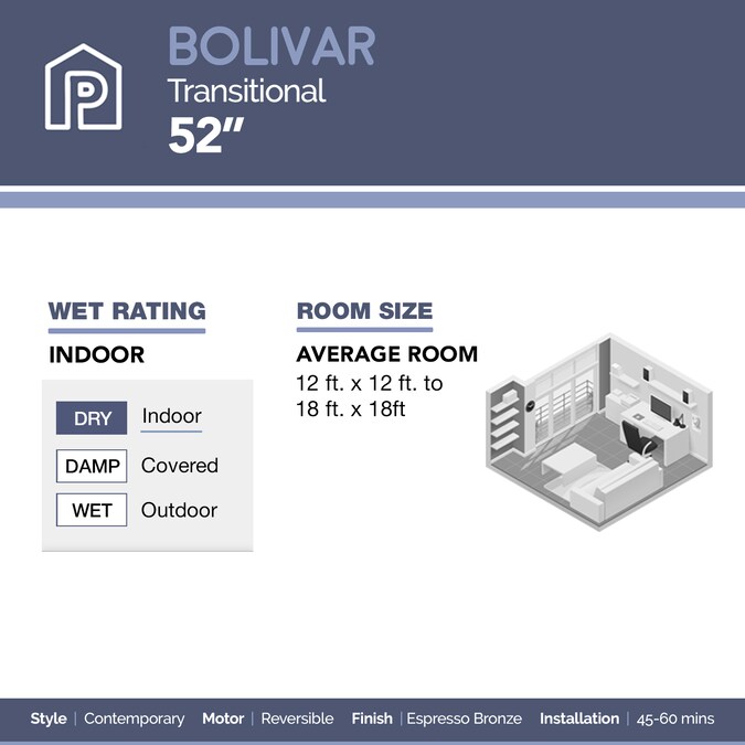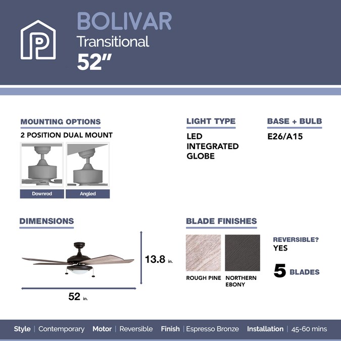 • The Prominence Home Bolivar boasts a bronze housing and 5 reversible fan blades in rough pine and northern ebony finishes
