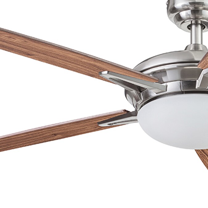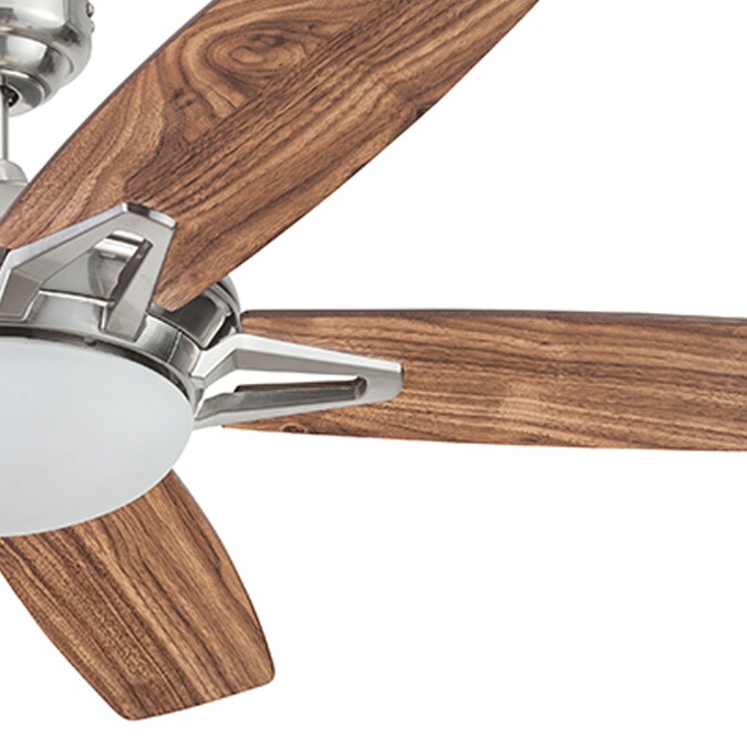 This 52-inch ceiling fan features a beautifully rounded integrated dome light which provides a perfect contrast to the sharp angles of the modern peep-hole blade arms creating a striking focal point. The brushed nickel finish boasts reversible caramel walnut/true brown blades. Each combination is expertly designed to add extra flair and perfectly accent a variety of different looks to have mass appeal. The powerful motor and design provides adjustable, reversible air movement that is ultra-efficient whether you want to cool down on those sweltering summer days or circulate warm air in the cold months of winter. The included remote controls the power, 3 speed settings of the fan, the reversible airflow and light as well for the ultimate convenience.