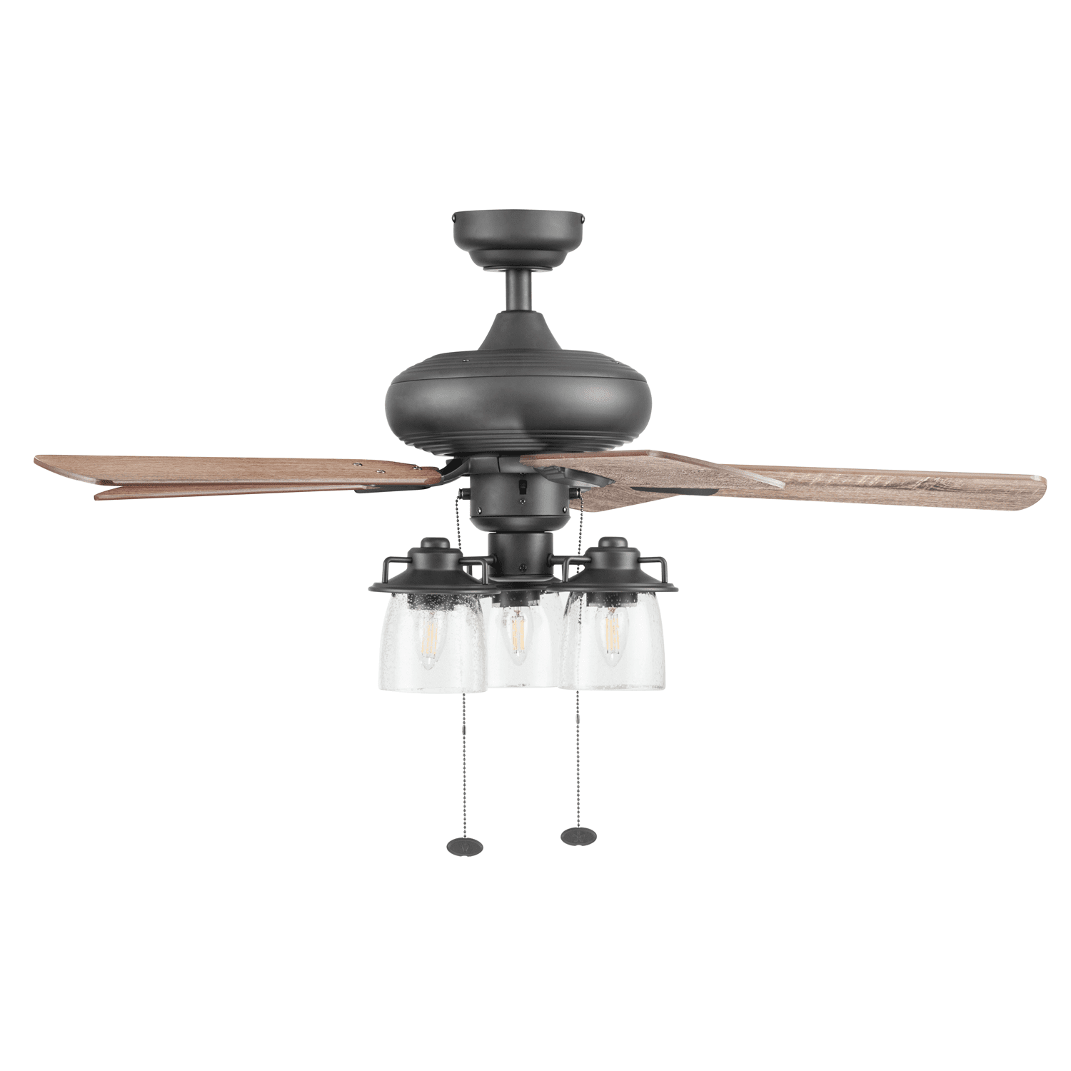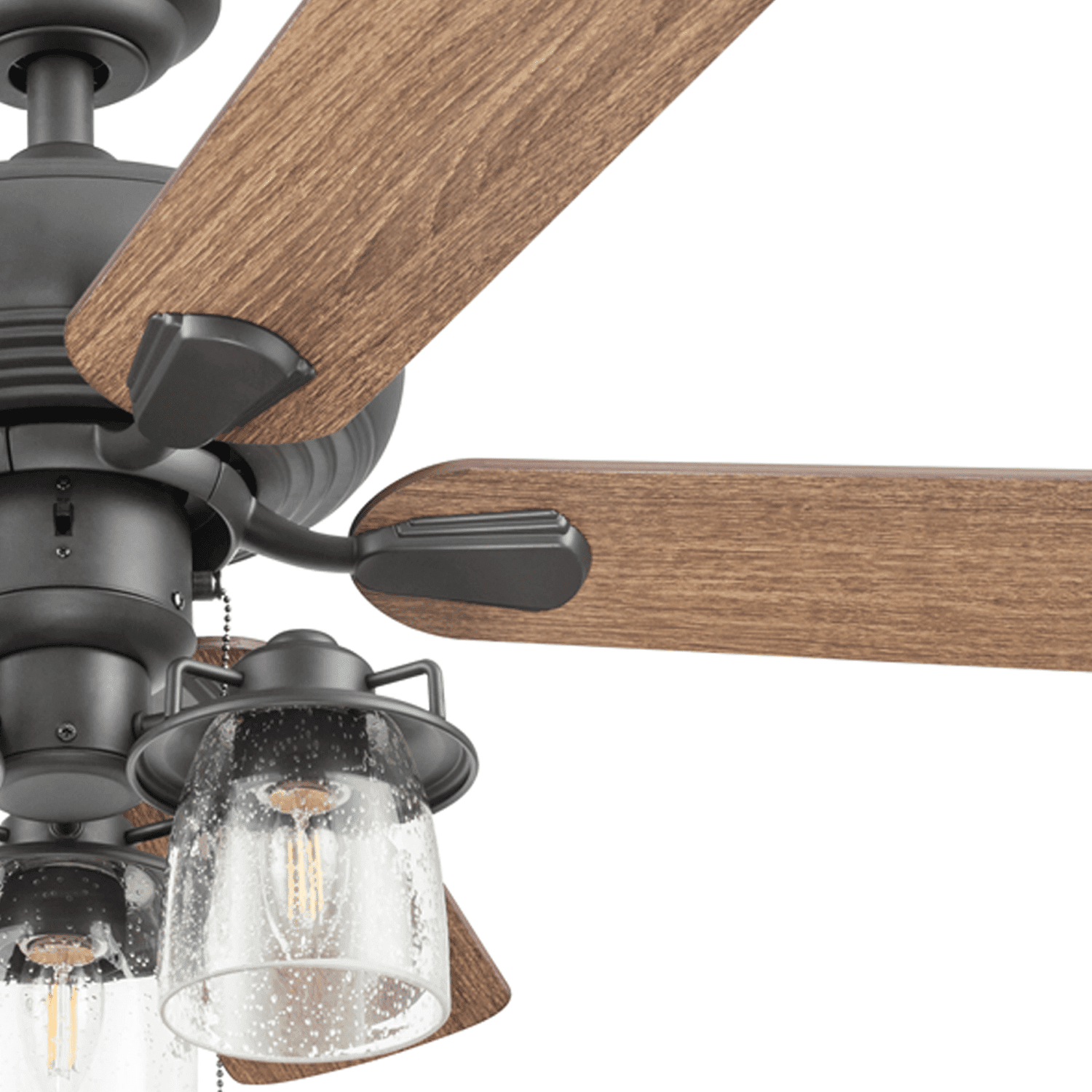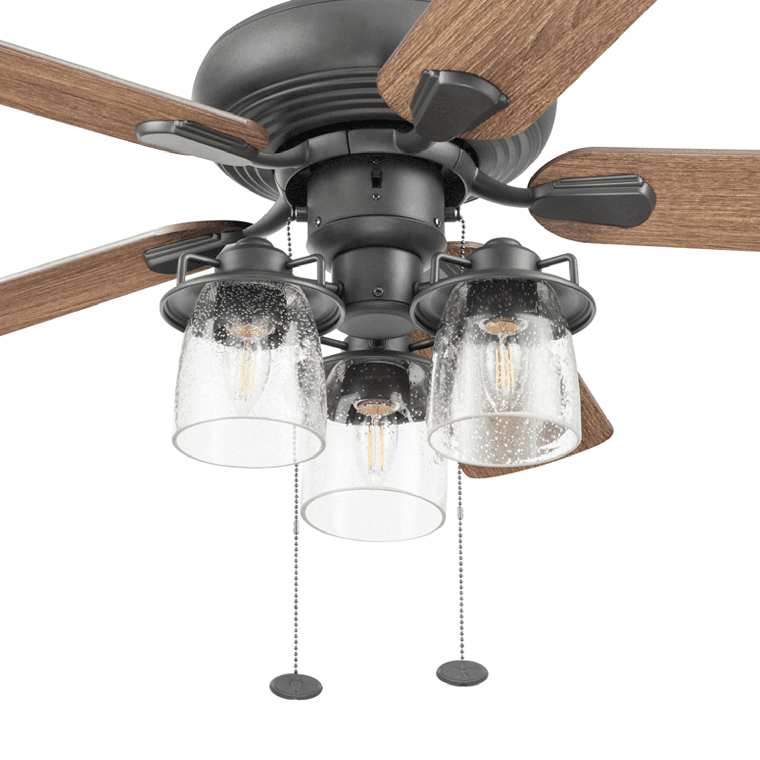 Prominence Home Crown Canyon Bronze 52 In. Indoor LED Ceiling Fan with Remote (5 Blades) RUSTIC FARMHOUSE: With unique texture, stylish Edison light bulbs and a beautiful deep bronze finish, the Piercy elevates your farmhouse spaces! Having a blade span of 52 inches, this fan is perfect for medium to large rooms such as bedrooms, dining rooms, dens and much more! EDISON BULBS & CLEAR SEEDED GLASS: This beautiful lantern-inspired light has the power to light up your space but also dimmable to adjust to whatever suits your moods! This light kit features E26/B10 bulbs (included with purchase), 450 lumens, 4.5 watts with a color temperature of 2700K. REMOTE CONTROL INCLUDED: Controlling your fan has never been easier! Control the 3 speed settings of your fan as well as the light output all from the convenience of an easy-to-use remote control (included). Also compatible with Google Home and Alexa with a Bond Home (sold separately). Batteries are included TRI-MOUNT COMPATIBLE: Enjoy the dynamic hanging capabilities of a multi-position ceiling fan. This fan can be hung low profile where more walk-through space is required, standard with a 4” downrod (included) or on angled ceilings (angle bracket sold separately). DUAL-FINISH REVERSIBLE BLADES: The style is up to you! This ceiling fan comes with a different finish on each side of the blades. One side comes in a beautiful Rough Pine finish, while the other side showcases a lovely Tumbleweed finish. Pick the look that best fits your space! QUIET, REVERSIBLE MOTOR: Conveniently quiet, 3 speed – reversible motor. Can be run in the winter to aid in rotating warm air and cutting down on energy costs.