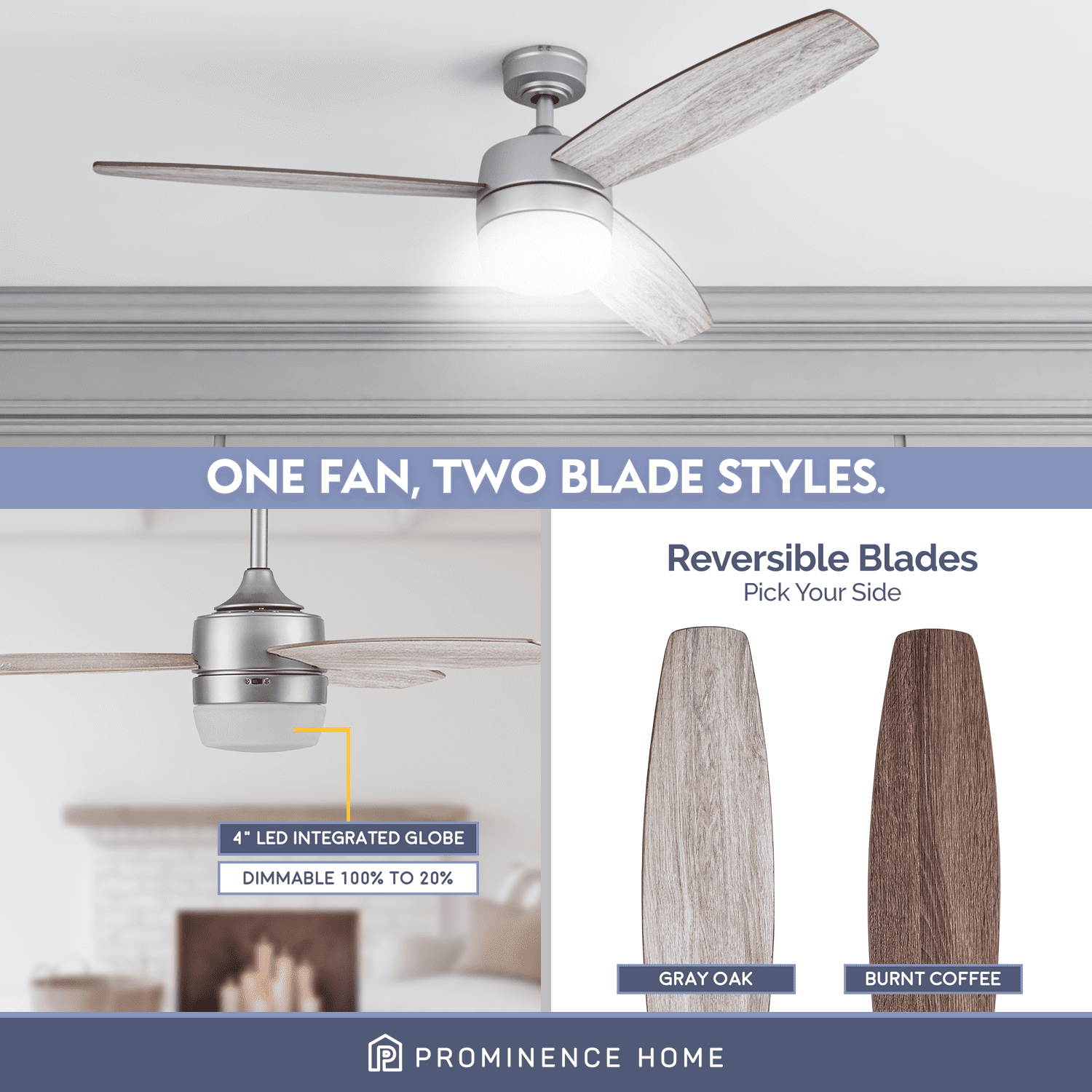SMART FAN: Works with Alexa and Google Assistant and powered by FansIO (included with purchase). Control your ceiling fan by voice, by the included smart remote or via the FansIO app which is downloadable at the App Store and Google Play! Being smart has never been so cool! INTEGRATED LIGHT KIT: This modern ceiling fan has an integrated 4 inch LED light board providing 18.5 watts, 1400 lumens, a color temperature of 3000K, and is dimmable 20% to 100%. DUAL-FINISH REVERSIBLE BLADES: The style is up to you! This ceiling fan comes with a different finish on each side of the blades. One side comes in a beautiful gray oak finish, while the other side showcases a lovely coal finish. Pick the look that best fits your space! DUAL MOUNT COMPATIBLE: This ceiling fan can be conveniently mounted with a down rod (4 inch downrod included- longer downrods sold separately) or angled mounted on vaulted ceilings (angle bracket sold separately) ETL DRY-RATED: For indoor use only, install this indoor ceiling fan inside your home to protect it’s natural beauty and style. QUIET, REVERSIBLE MOTOR: Conveniently quiet, 3 speed – reversible motor. Can be run in the winter to aid in rotating warm air and cutting down on energy costs. LIMITED LIFETIME WARRANTY: A Limited Lifetime warranty is offered by the manufacturer on all ceiling fans.
