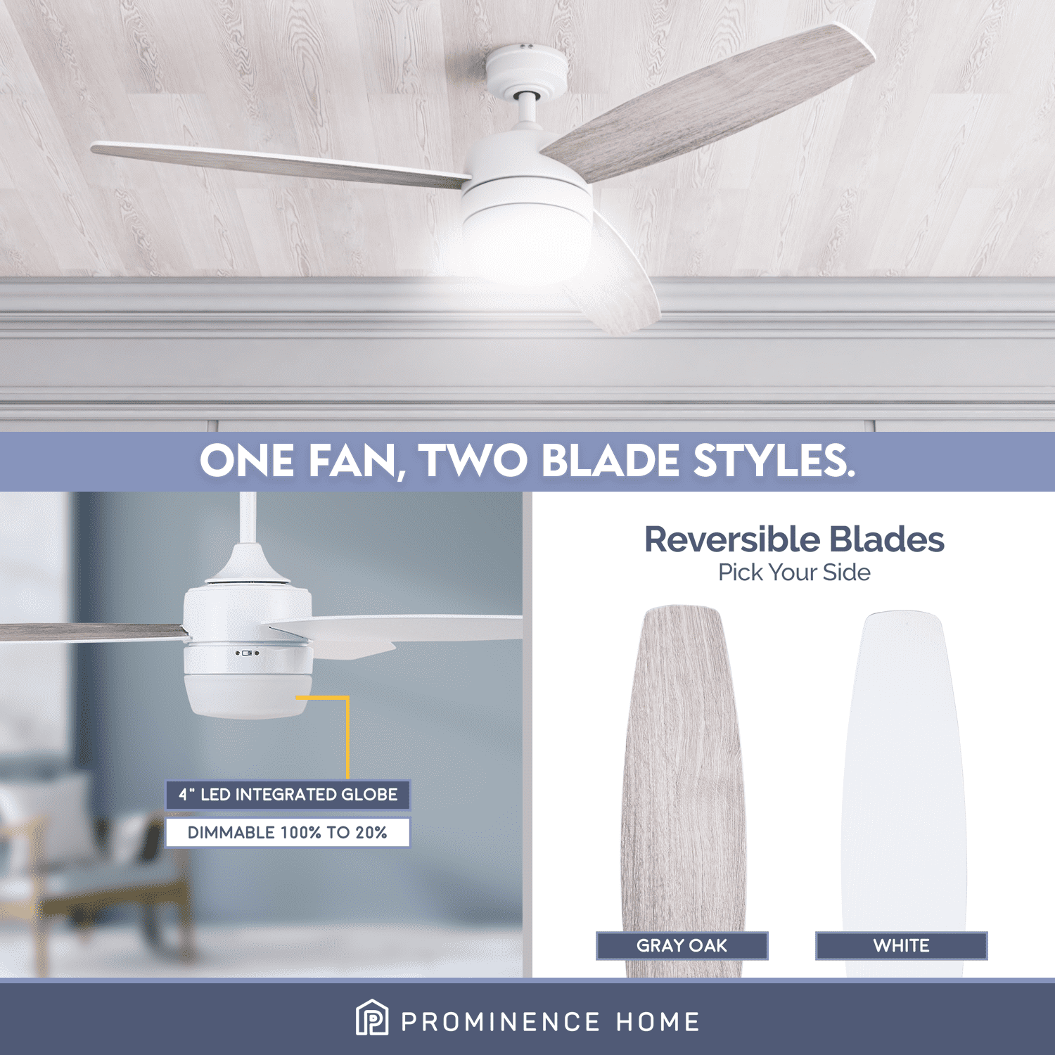 SMART FAN: Works with Alexa and Google Assistant and powered by FansIO (included with purchase). Control your ceiling fan by voice, by the included smart remote or via the FansIO app which is downloadable at the App Store and Google Play! Being smart has never been so cool! INTEGRATED LIGHT KIT: This modern ceiling fan has an integrated 4 inch LED light board providing 18.5 watts, 1400 lumens, a color temperature of 3000K, and is dimmable 20% to 100%. DUAL-FINISH REVERSIBLE BLADES: The style is up to you! This ceiling fan comes with a different finish on each side of the blades. One side comes in a beautiful gray oak finish, while the other side showcases a lovely coal finish. Pick the look that best fits your space! DUAL MOUNT COMPATIBLE: This ceiling fan can be conveniently mounted with a down rod (4 inch downrod included- longer downrods sold separately) or angled mounted on vaulted ceilings (angle bracket sold separately) ETL DRY-RATED: For indoor use only, install this indoor ceiling fan inside your home to protect it’s natural beauty and style. QUIET, REVERSIBLE MOTOR: Conveniently quiet, 3 speed – reversible motor. Can be run in the winter to aid in rotating warm air and cutting down on energy costs. LIMITED LIFETIME WARRANTY: A Limited Lifetime warranty is offered by the manufacturer on all ceiling fans.