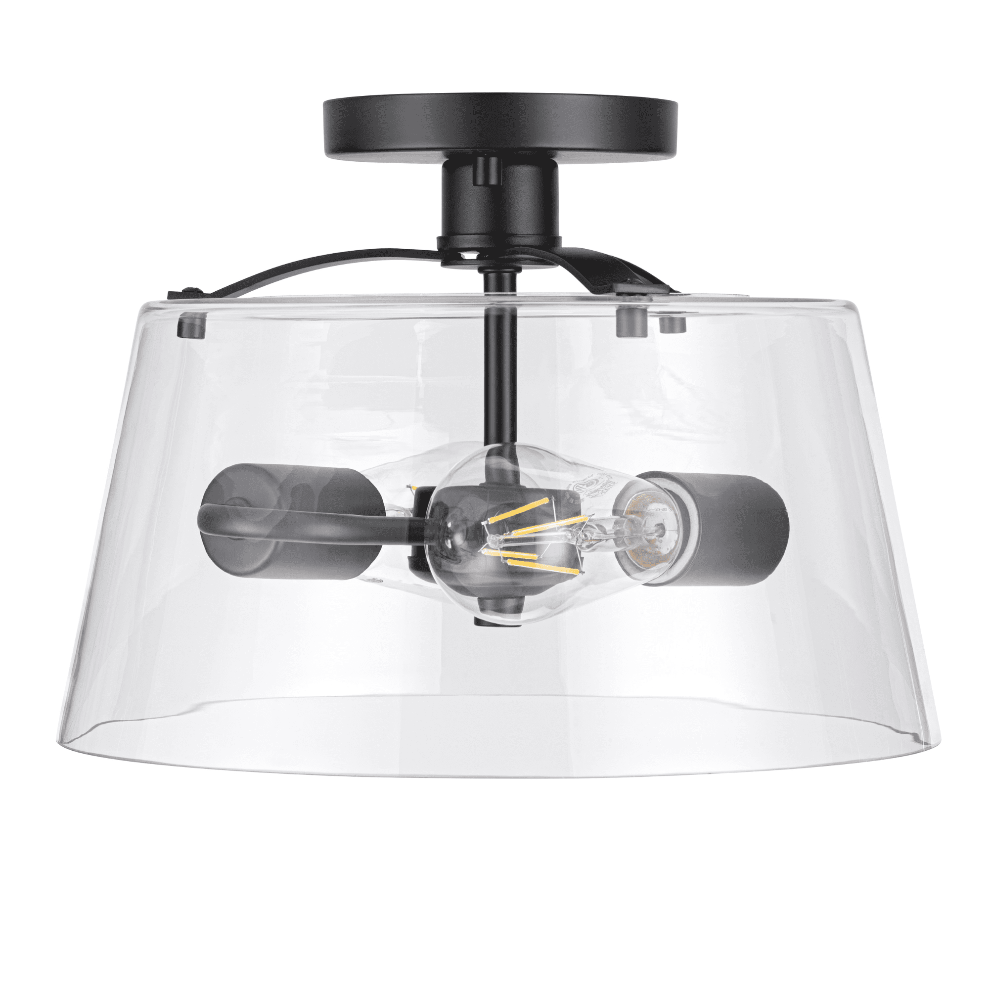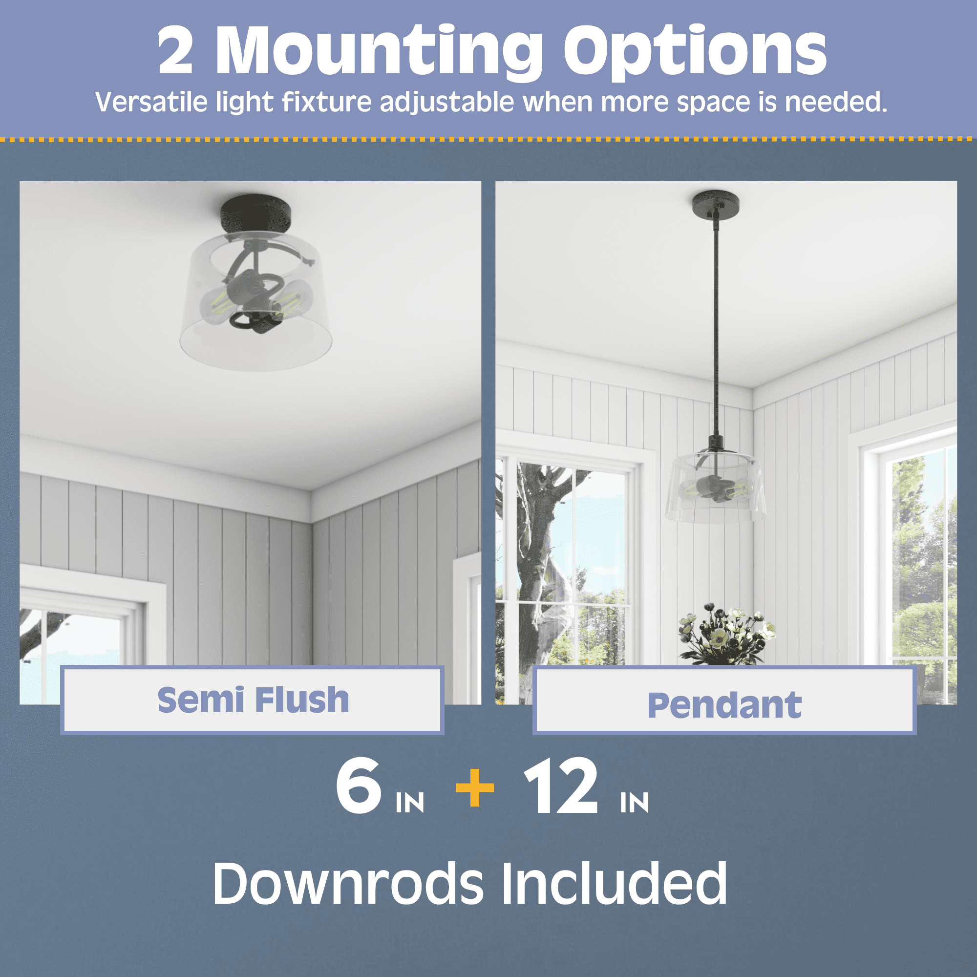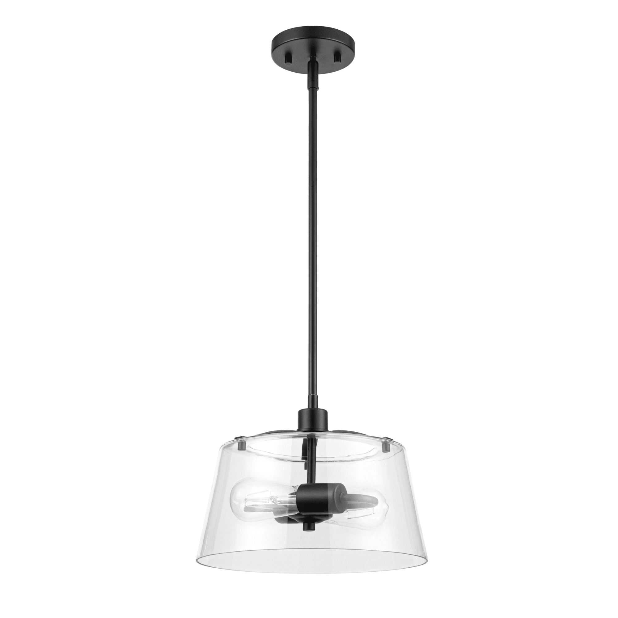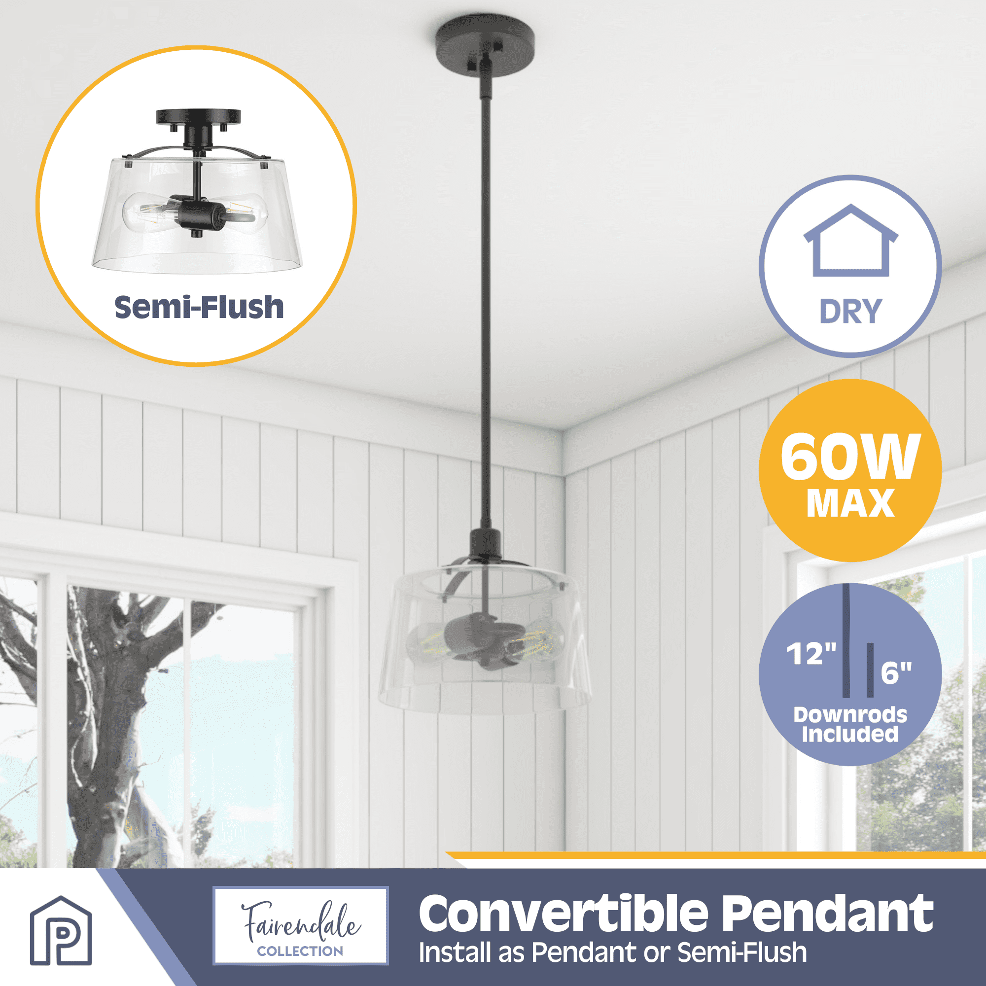 2-light convertible fixture can be installed as a pendant or semi-flush light Create a cohesive look in your home with coordinating fixtures from the Fairendale lighting collection Great as semi-flush in hallway, kitchen or bathroom and hanging over a kitchen island or an entryway Contemporary / modern styling in trending matte black finish with one large clear glass light cover 2-light convertible pendant / Semi-Flush mount uses medium base (E26) incandescent / LED (AC or DC) / CFL bulbs (not included) Measures 8-in H x 12-in W Includes (4) 12-in rods and (2) 6-in rods for customizable hanging length UL / CUL listed
