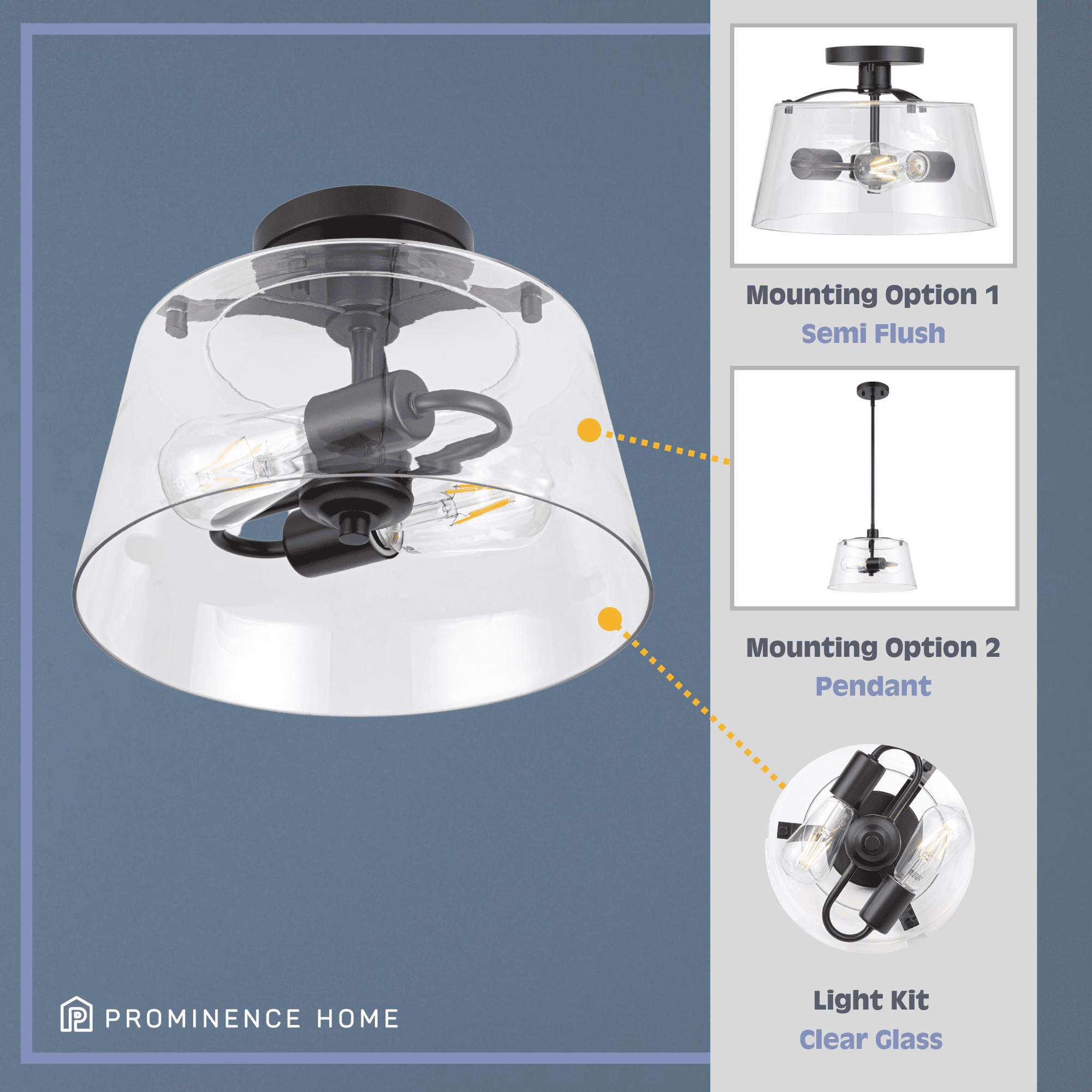 Elevate the look of your home with this 2-Light Convertible Pendant / semi flush light from Prominence Home. Whether mounted semi-flush in a hallway or bathroom or hanging as a pendant over a kitchen island or entryway, the large clear glass shade with matte black finish base offers a look of modern style and flair that is sure to impress. Update other rooms in your home with lights from the Fairendale collection as an impactful yet simple way to accomplish a DIY home remodel.