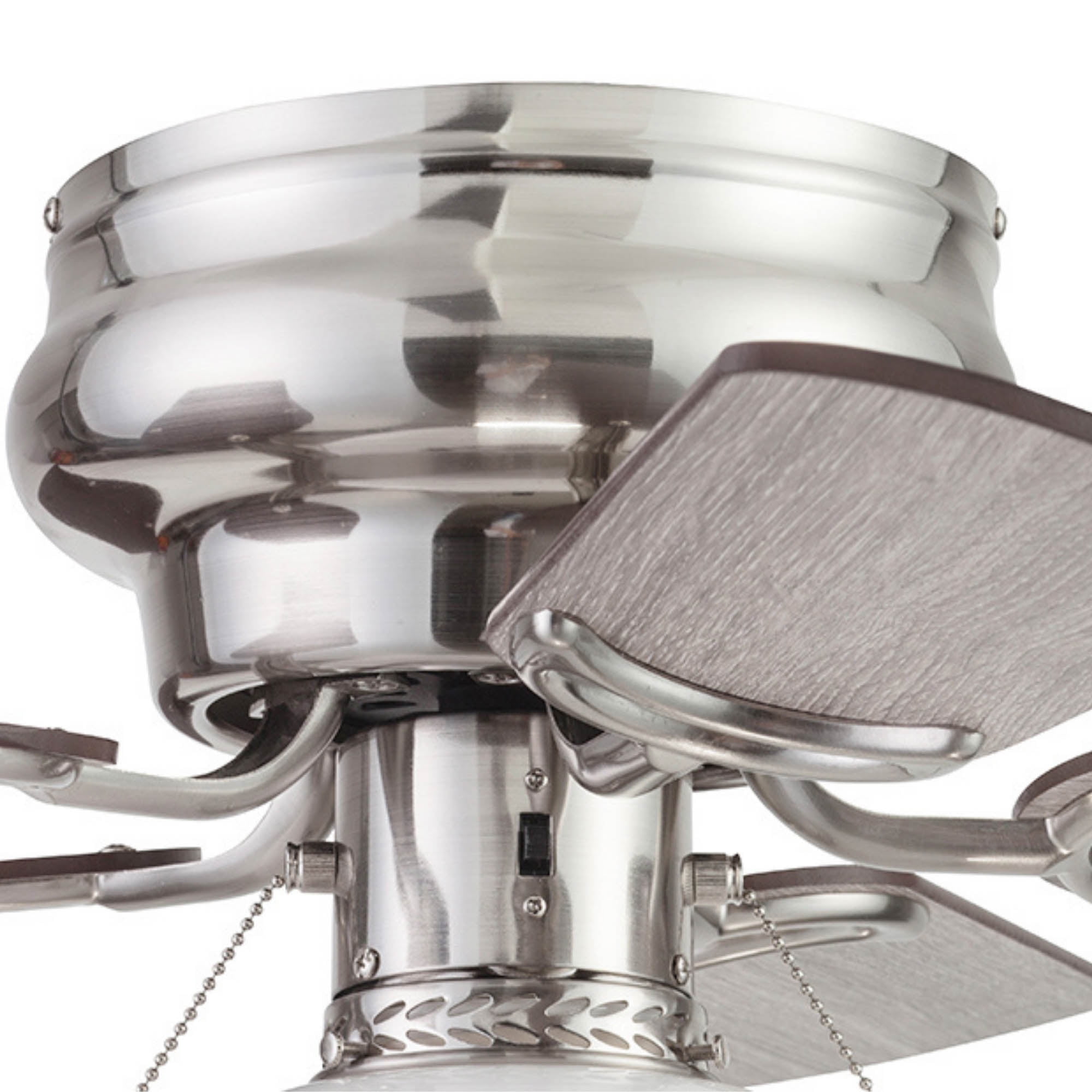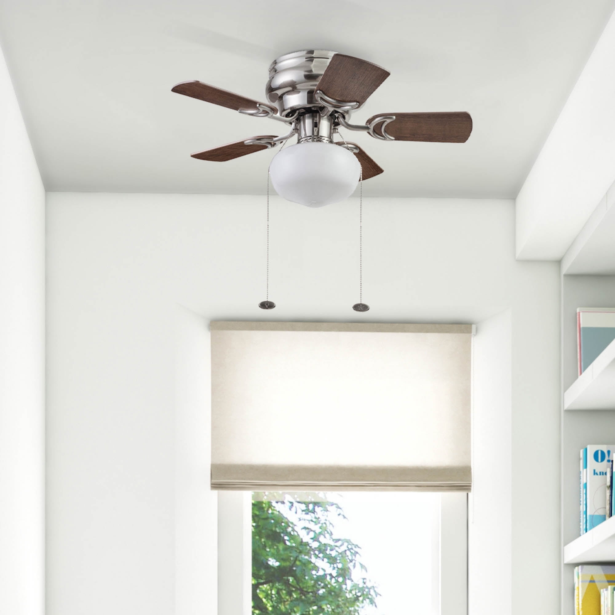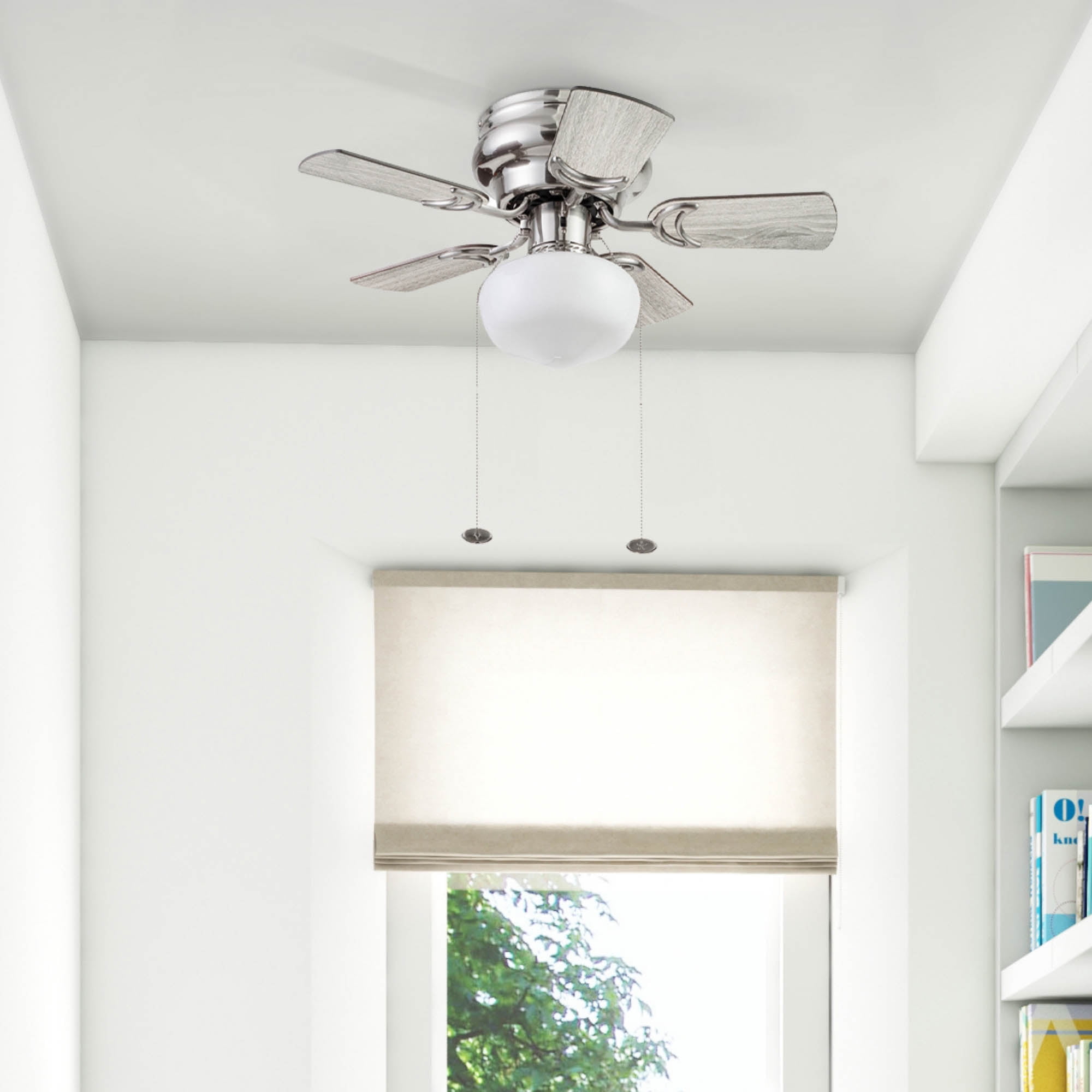 Prominence Home Hero 28″ Brushed Nickel Flushmount Small Room Ceiling Fan with 5 Blades, Globe Light Kit & Pull Chains