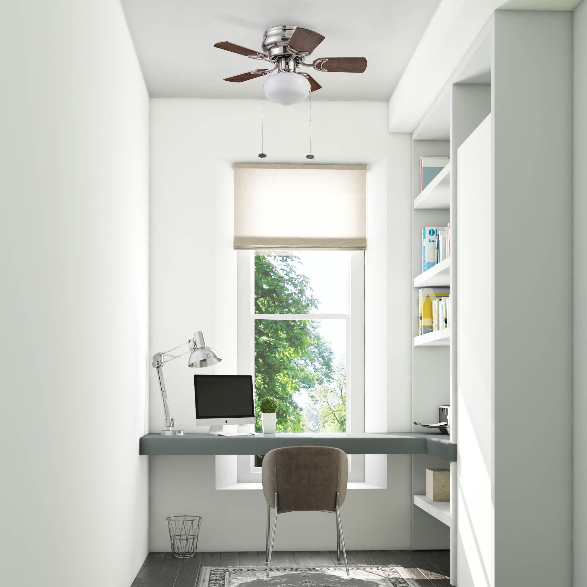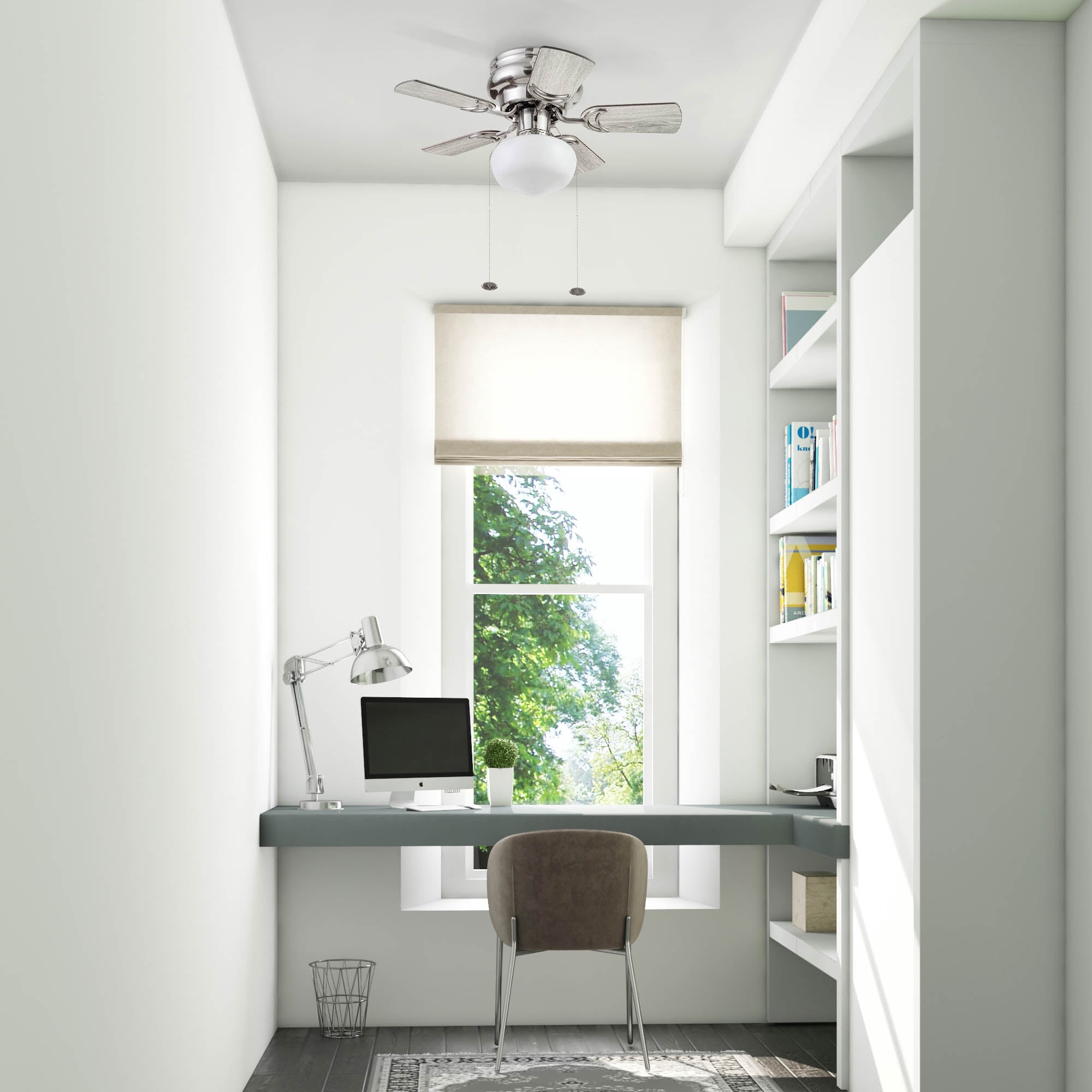 We are a big fan of this mini fan, here’s why: A beautiful brushed nickel finish, a sleek low-profile design, and perfect lighting all packed into 28 inches of cuteness! The Prominence Home Hero indoor ceiling fan has all the style, charm, and function of the big guys condensed into a tiny unit that can be easily tucked into your smaller spaces to elevate the comfort while still adding personality and charm. Every home should have a Hero! Featuring a striking brushed nickel finish on a hugger style, low profile body for indoor rooms with low ceilings where a little more room is needed. The Hero is expertly designed with reversible gray oak/ light oak blades to complement your modern farmhouse or casually spaces. The lighting is crafted with a traditional style closed schoolhouse globe with dimmable LED bulbs to perfectly illuminate your inviting spaces.The reversible motor and design provide adjustable air movement that is ultra-efficient whether you want to cool down on those sweltering summer days or circulate warm air in the cold months of winter. To ensure your long-term satisfaction. The Prominence Home Hero gives you all the quality functions you deserve while providing the impressive eye-catching style you crave.