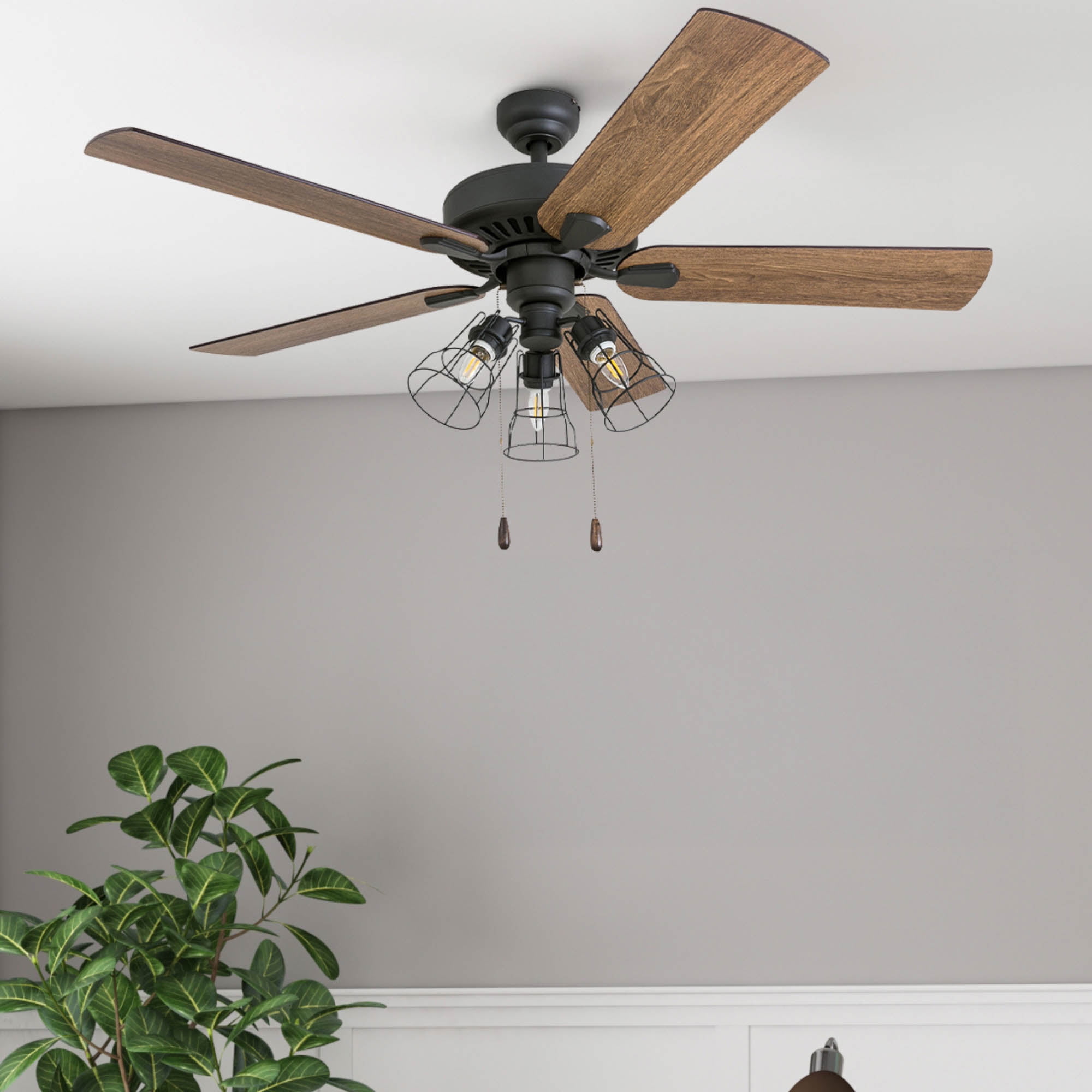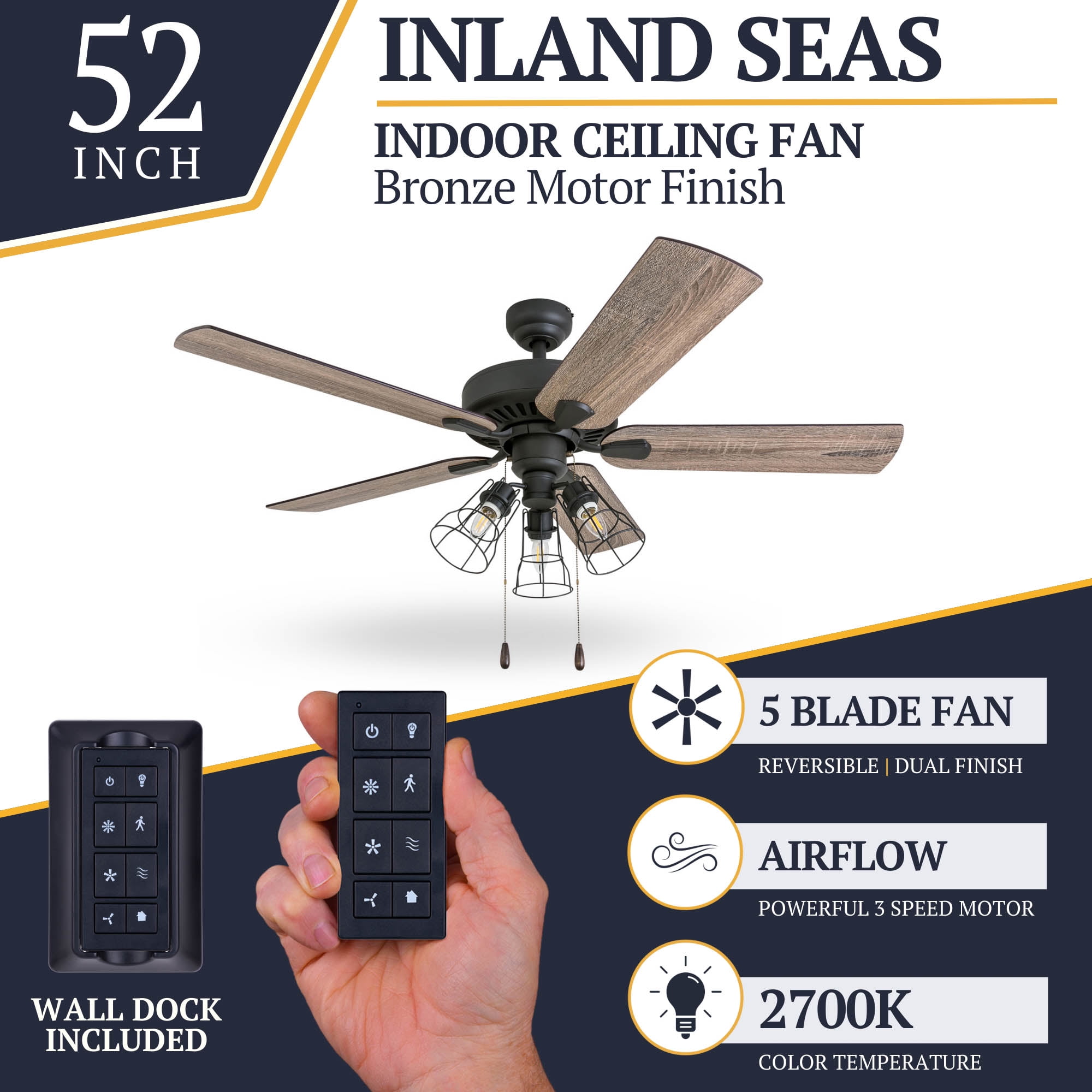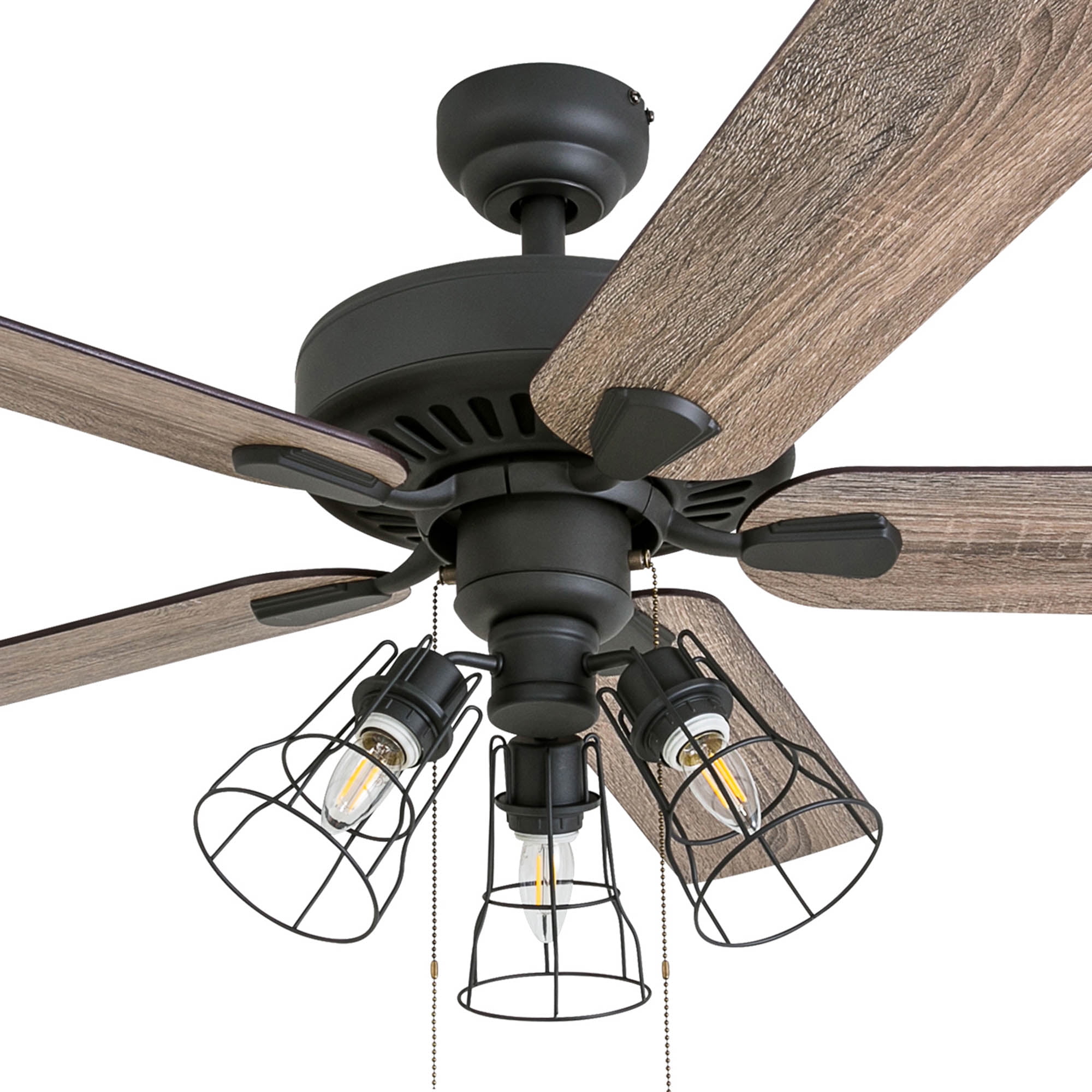 Prominence Home 50750-35 Inland Seas Farmhouse 52-Inch Aged Bronze Indoor Ceiling Fan, Cage LED Cage Barnwood/Tumbleweed Blades and 3 speed remote HIGH AIR-FLOW: Enjoy the cool breeze created by a ceiling fan! Three speeds allow for the perfect setting for your space.QUIET, REVERSIBLE MOTOR: Conveniently quiet, reversible motor. Can be run in the winter to aid in rotating warm air and cutting down on energy costs.MEDIUM SIZED ROOMS: Perfect for rooms around 350 square feet such as living rooms, bedrooms, dining rooms or family rooms.TWO-BLADE FINISHES: Get the perfect finish match with our reversible ceiling fan blades. Each side has a unique finish to compliment your space.100% SATISFACTION GUARANTEED: Limited manufacturer’s warranty. You’ll love this ceiling fan!