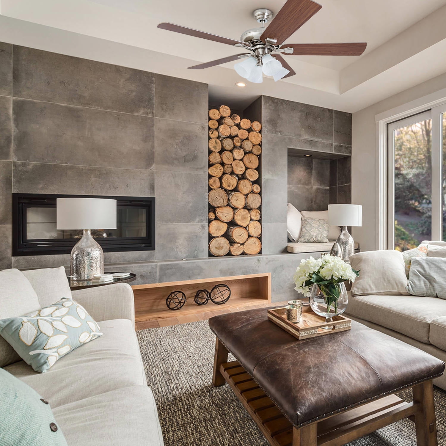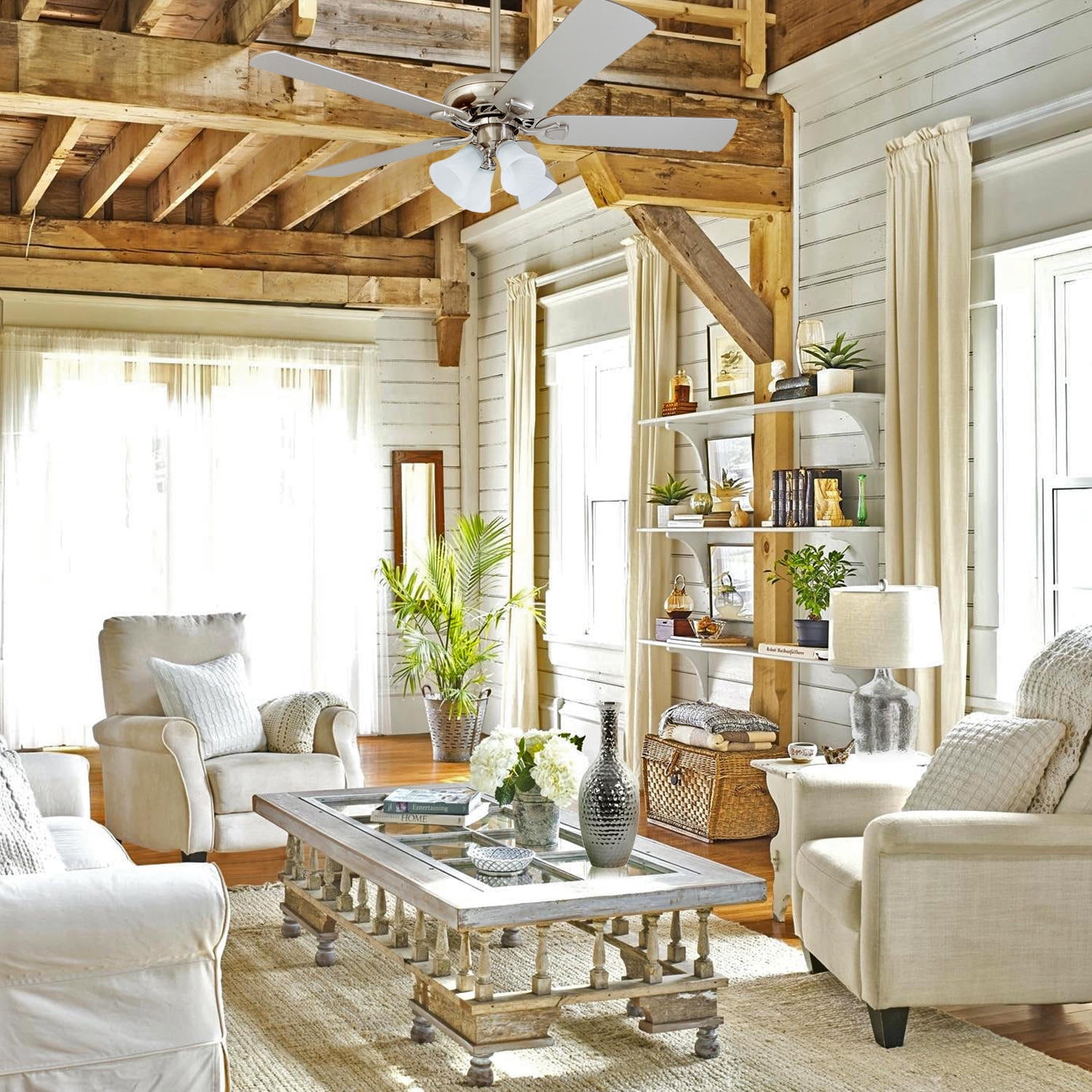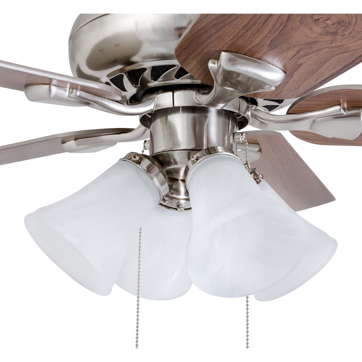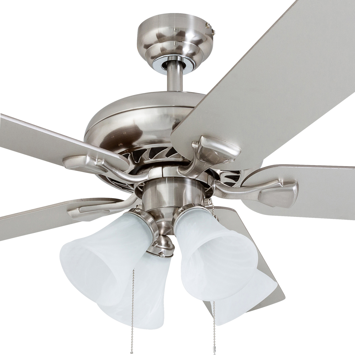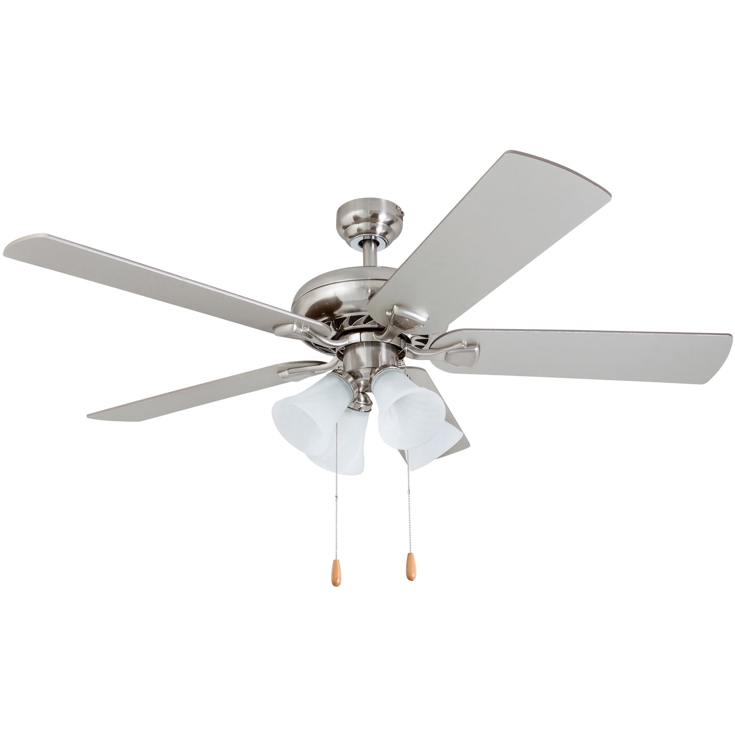 Prominence Home Lanie 52” Brushed Nickel Traditional Ceiling Fan with Multi-Arm Lighting and Gray High air-flow design for a refreshing breeze Three speed settings for customizable comfort Quiet, reversible motor for year-round use Ideal for medium-sized rooms up to 350 square feet Reversible blades with two unique finishes for versatile styling Durable construction for long-lasting performance