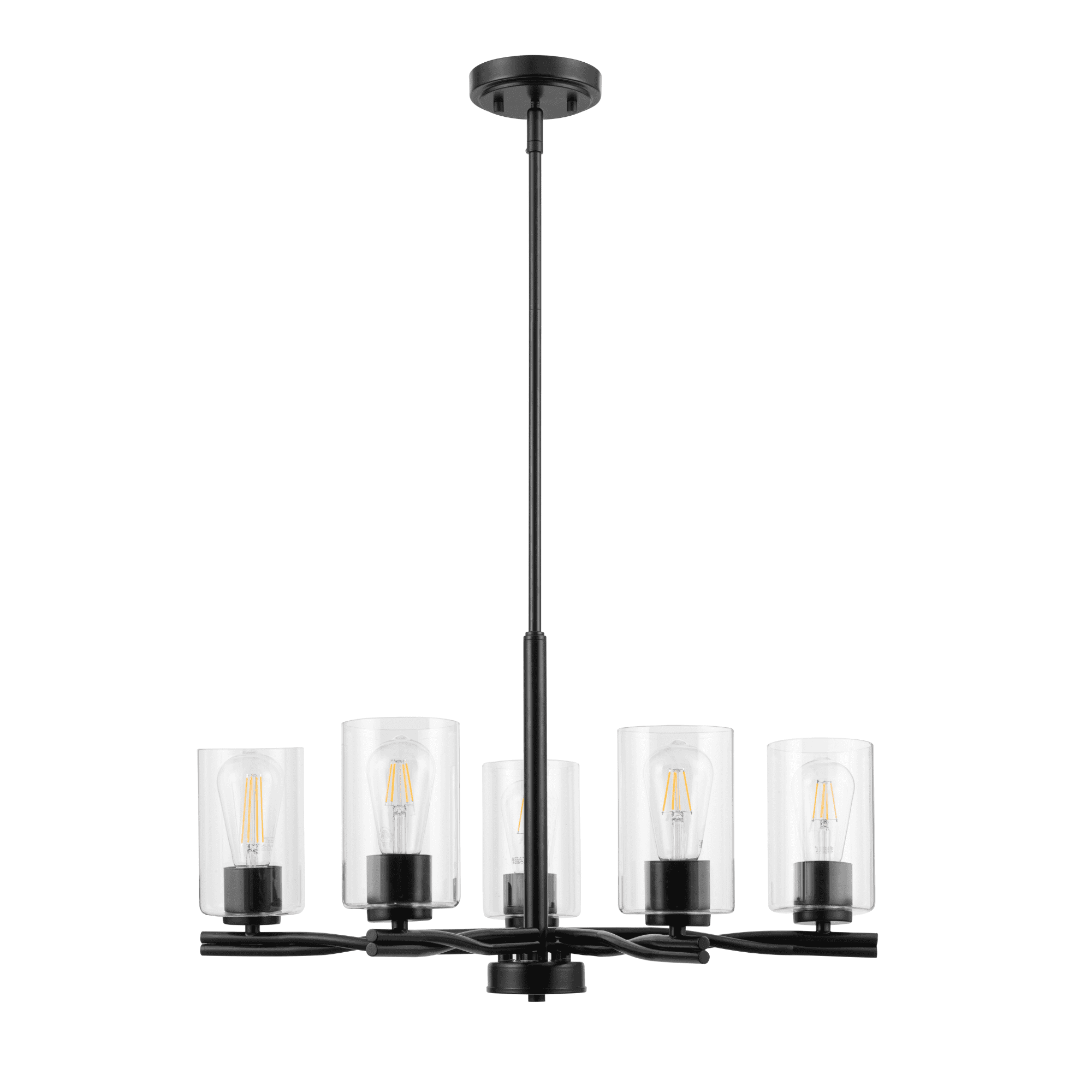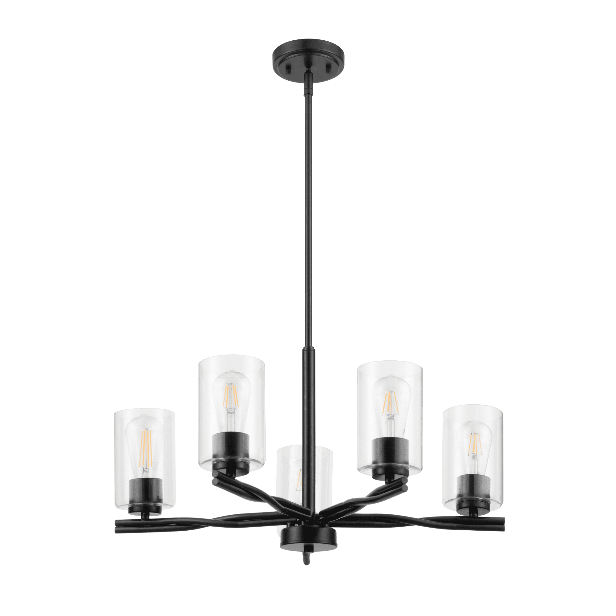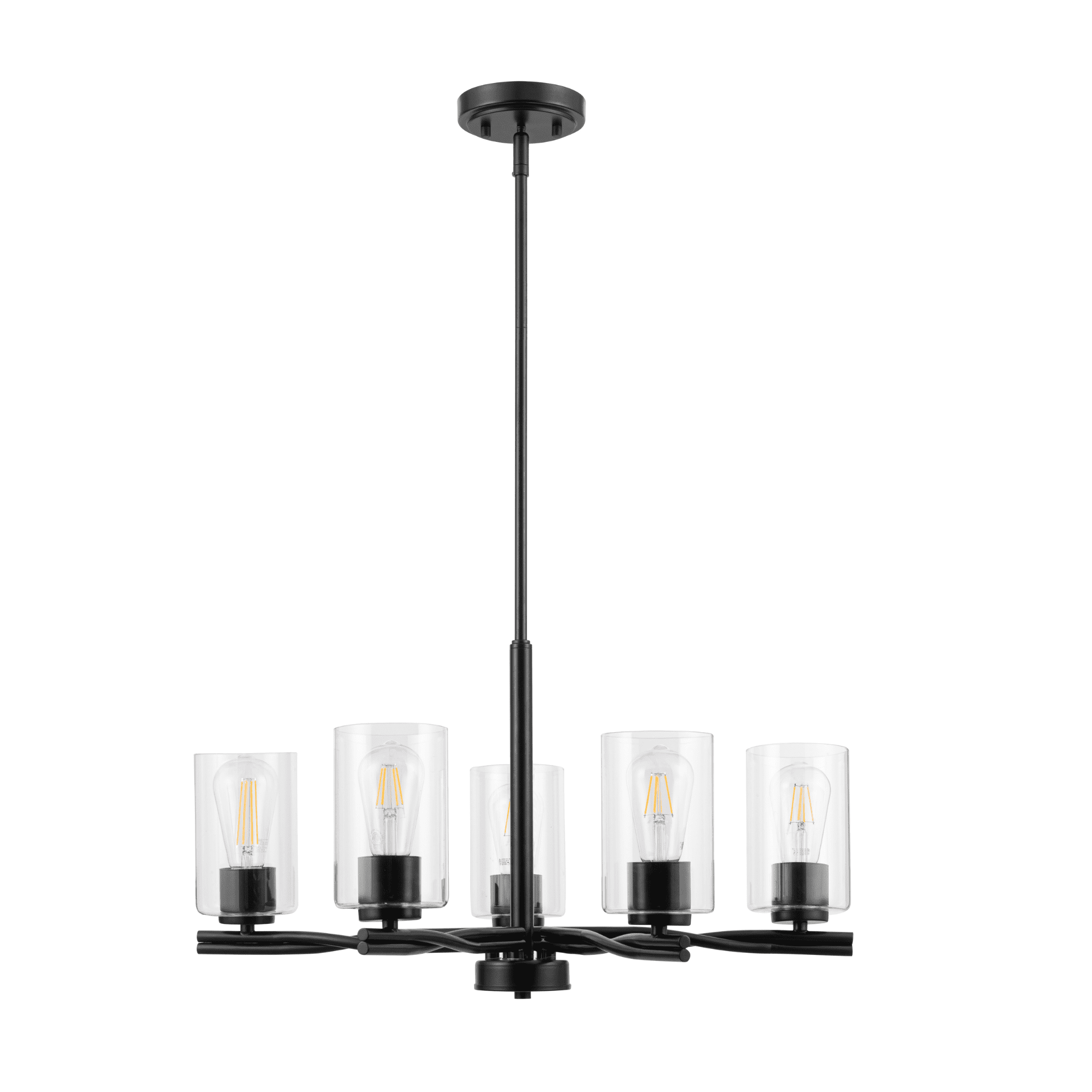 Add a “twist” of transitional style to your home, with the beautifully designed Lantier collection 5-Light Chandelier in matte black finish. Each arm features a unique twisted iron design to create a sense of flow and movement. Paired with the clean straight lines of the clear glass cylinder shades, this light is an simple yet impressive way to enhance the look of your dining room.
