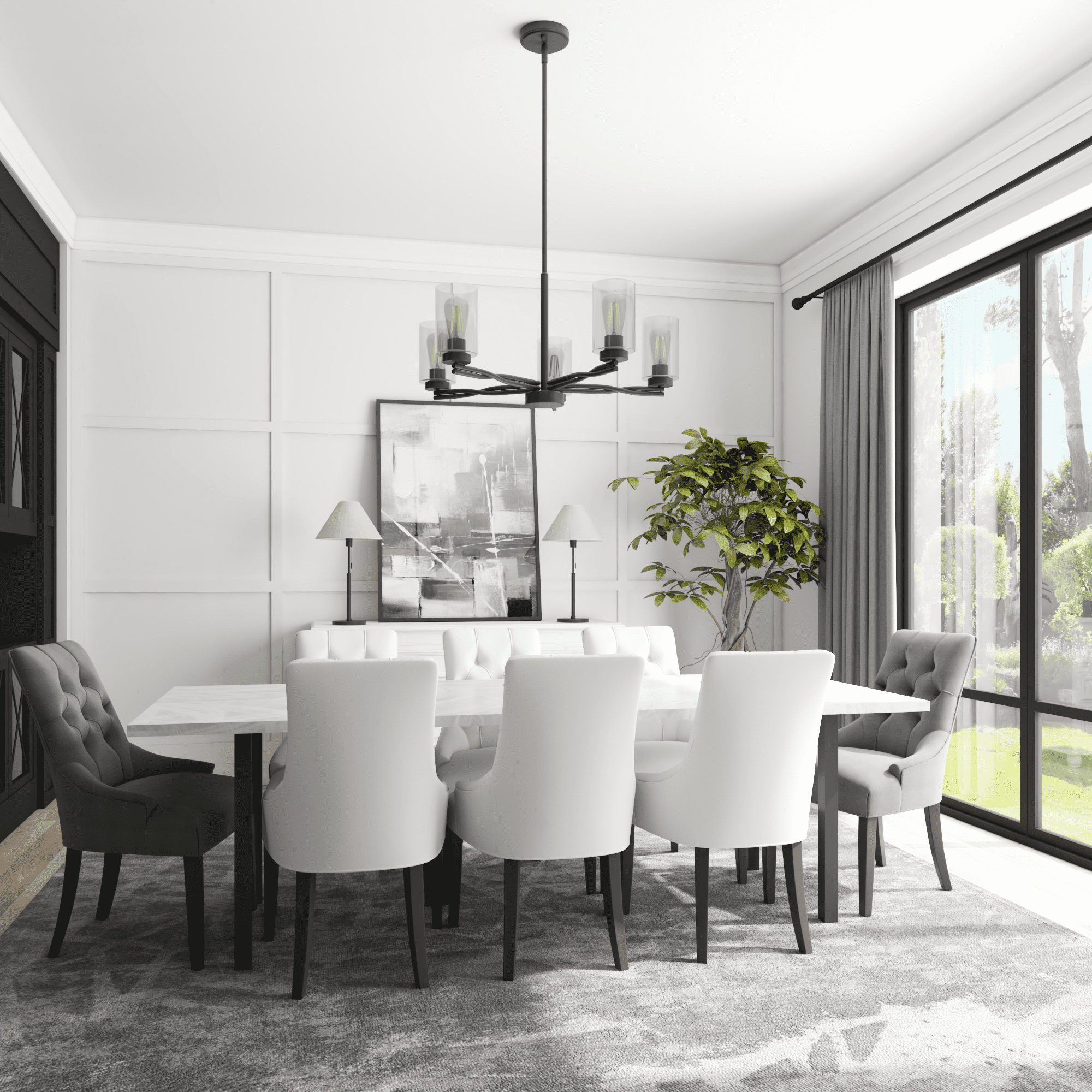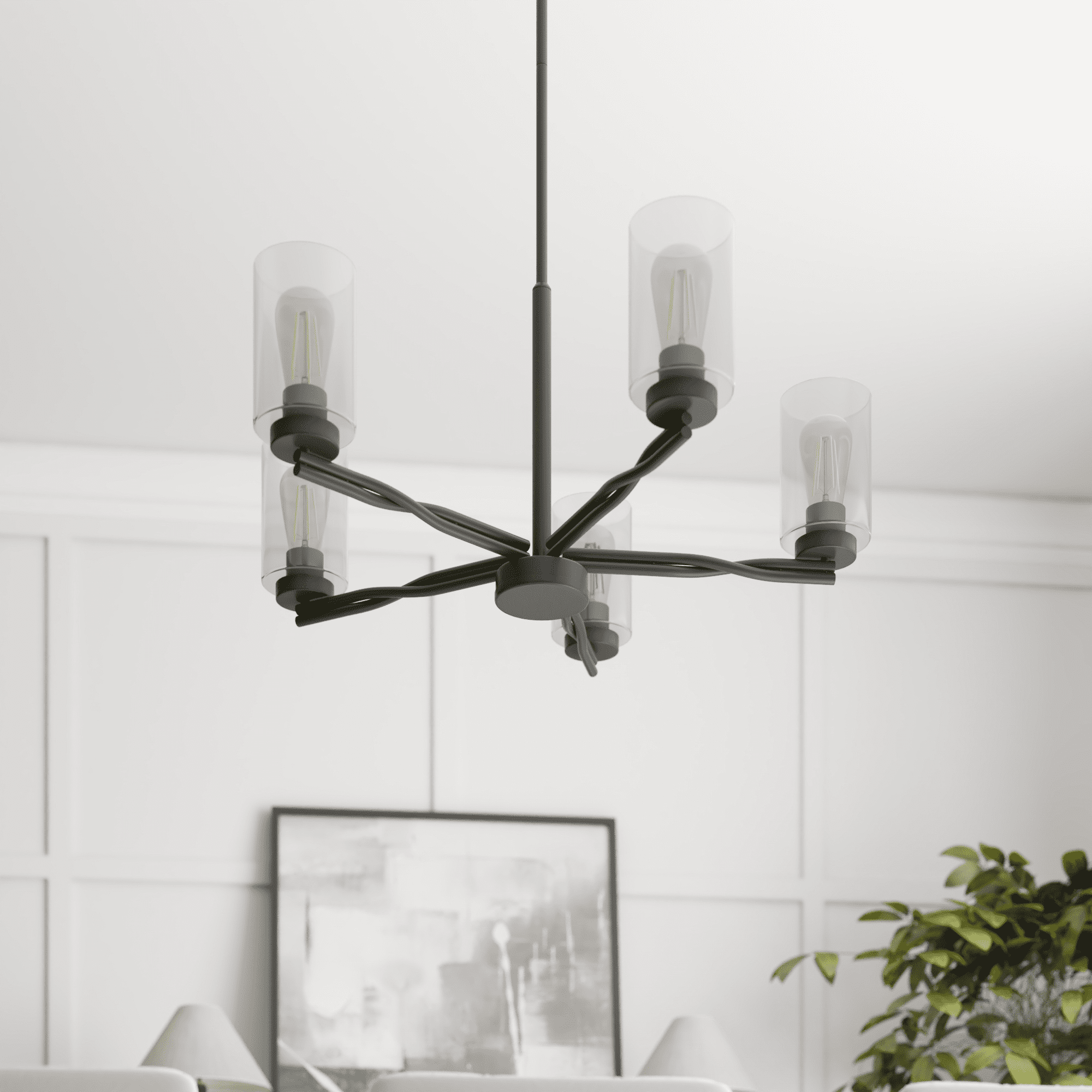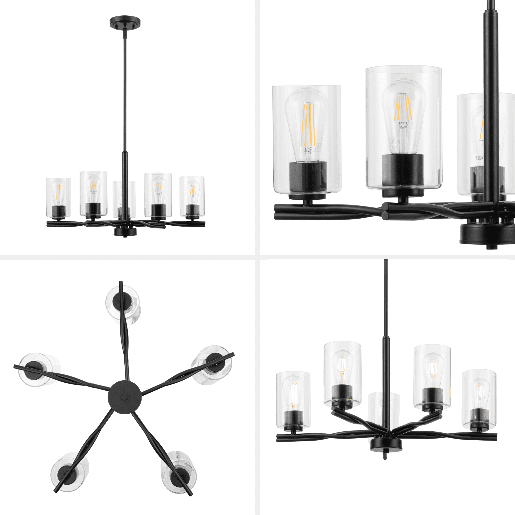 Add a “twist” of transitional style to your home, with the beautifully designed Lantier collection 5-Light Chandelier in matte black finish. Each arm features a unique twisted iron design to create a sense of flow and movement. Paired with the clean straight lines of the clear glass cylinder shades, this light is an simple yet impressive way to enhance the look of your dining room.
