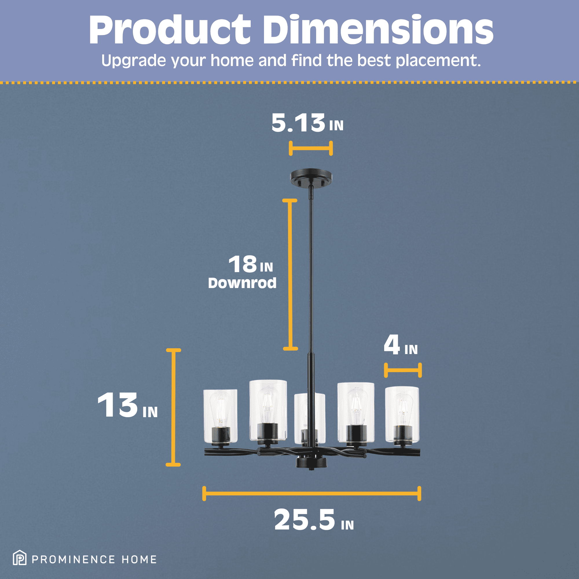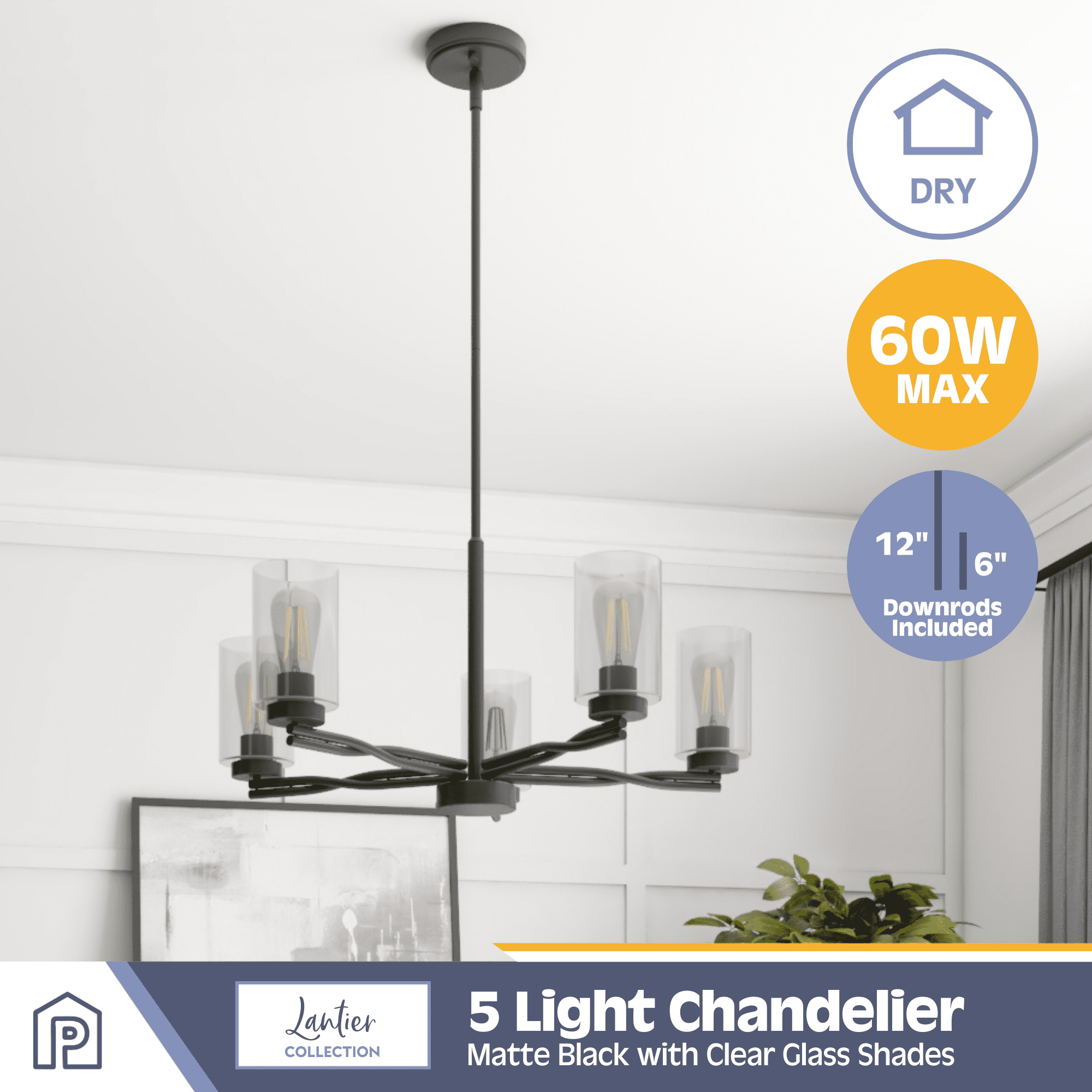 Create a cohesive look in your home with coordinating fixtures from the Lantier lighting collection Transitional 5-light chandelier is great for dining room or large grand entry way Trending matte black finish with clear glass compliments a variety of interiors from transitional to modern 5-Light chandelier uses medium base (E26) incandescent / LED (AC or DC) / CFL bulbs (not included) Measures 13-in H x 28.5 W Includes (4) 12-in rods and (2) 6-in rods for customizable hanging length UL listed