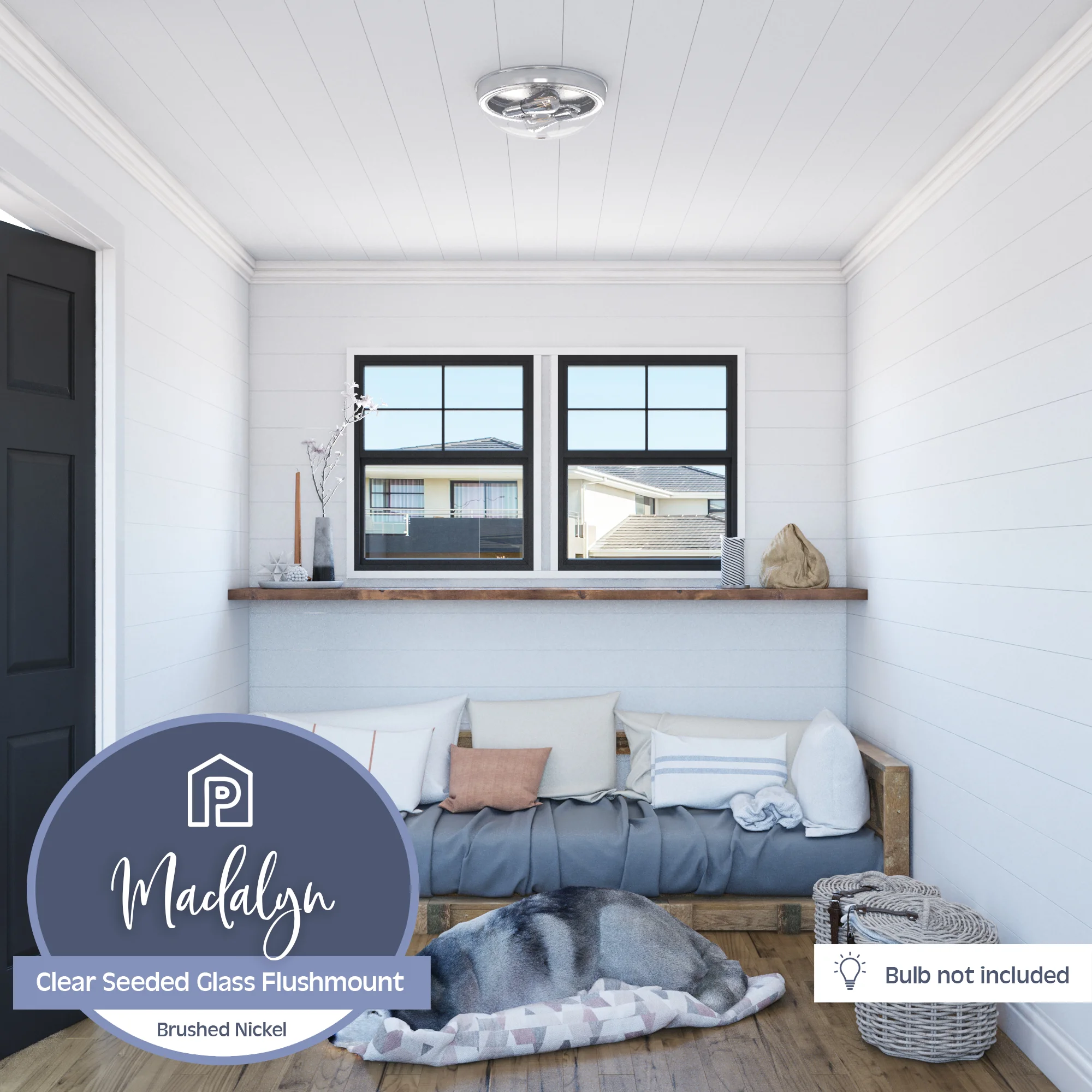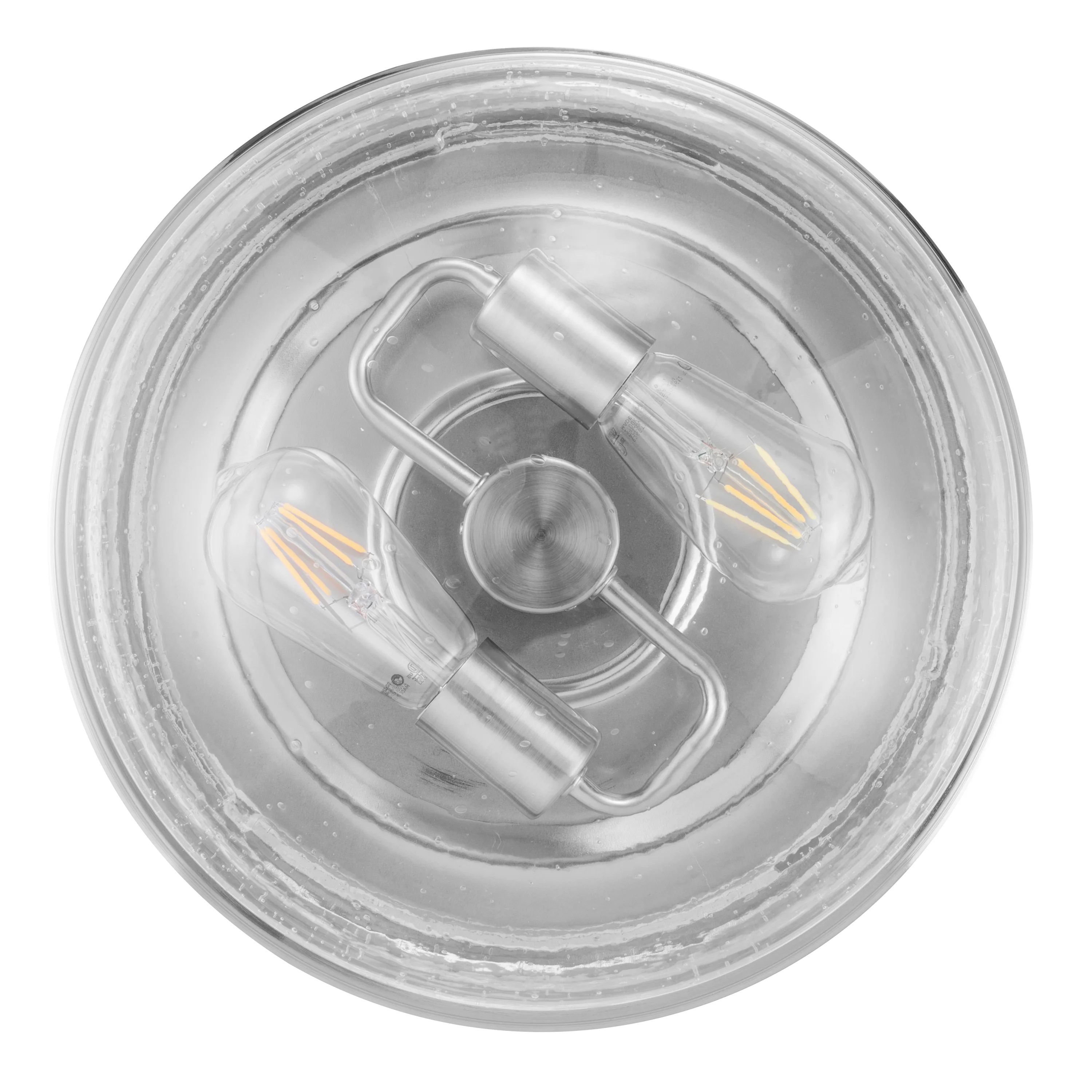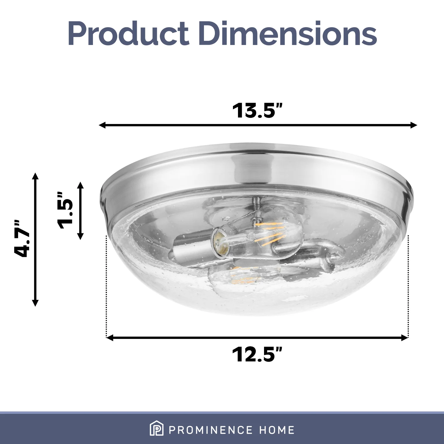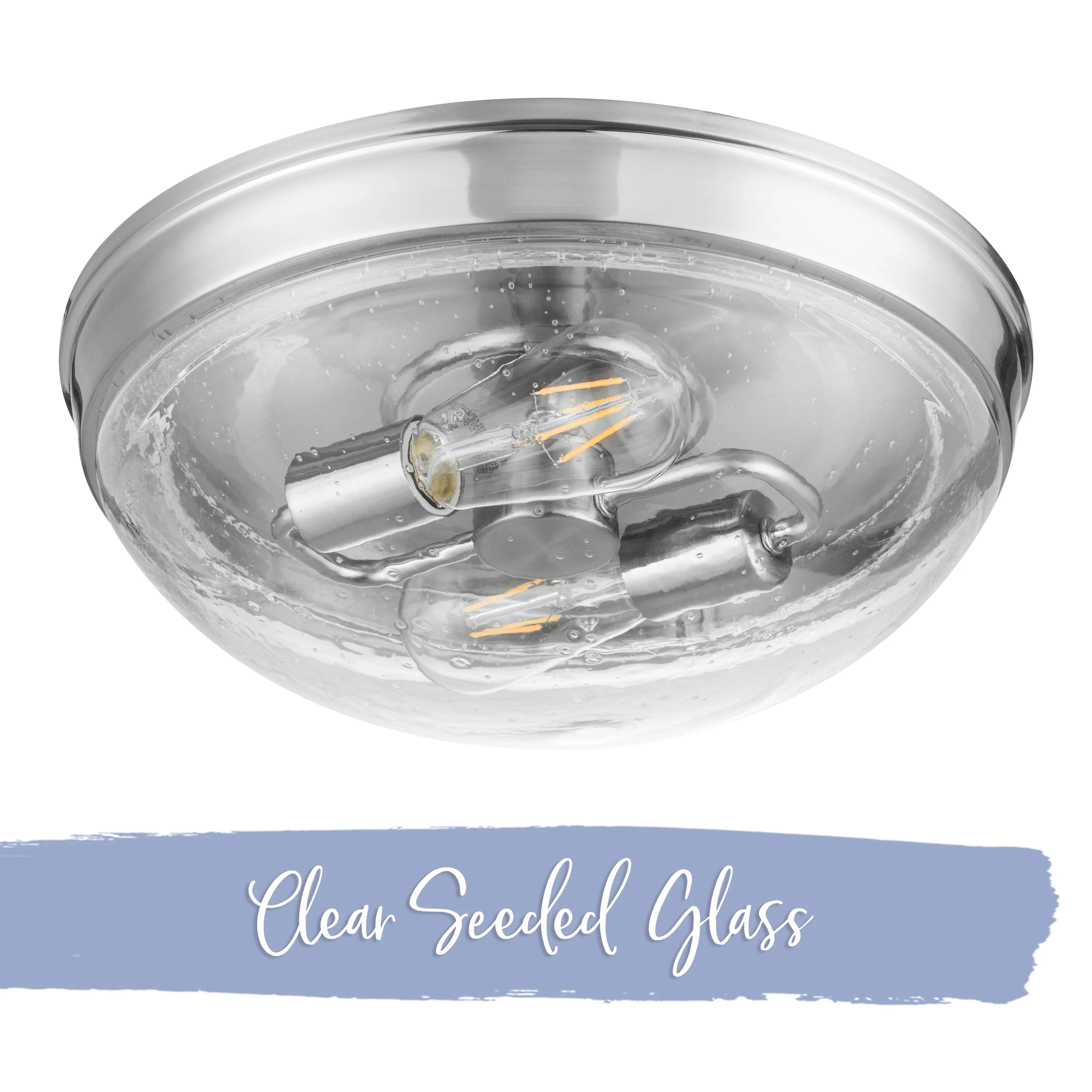 The Prominence Home Madalyn boasts a domed glass shade and a sleek, streamlined design built to complement a variety of styles. The beautiful clear seeded glass of this two-light flush mount fixture provides a beautiful radiant glow where you need it most. Available in brushed nickel or matte black, this fixture will elevate and illuminate your space! This beautifully crafted, clean-lined fixture will beautifully light your stylish spaces This light fixture comes with comprehensive instructions and a troubleshooting manual making it easy to have installed in no time! This eye-catching light fixture is damp-rated and perfect for those high-moisture spaces. Bring modern style and beautiful illumination to your home. This fixture uses E26/Medium (Standard) bulbs (not included). The manufacturer recommends not to exceed 25w.
