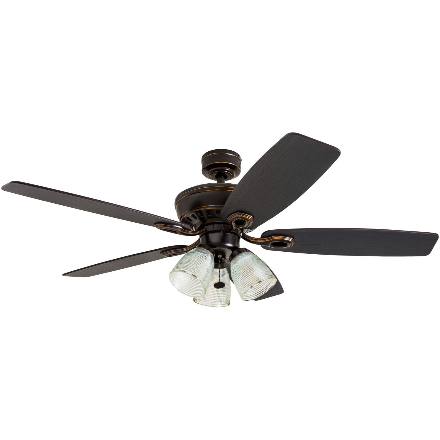Prominence Home Marston 52″ Oil Rubbed Bronce Ceiling Fan with 5 Blades, 3 Arm Textured Glass Light Kit & Pull Chains