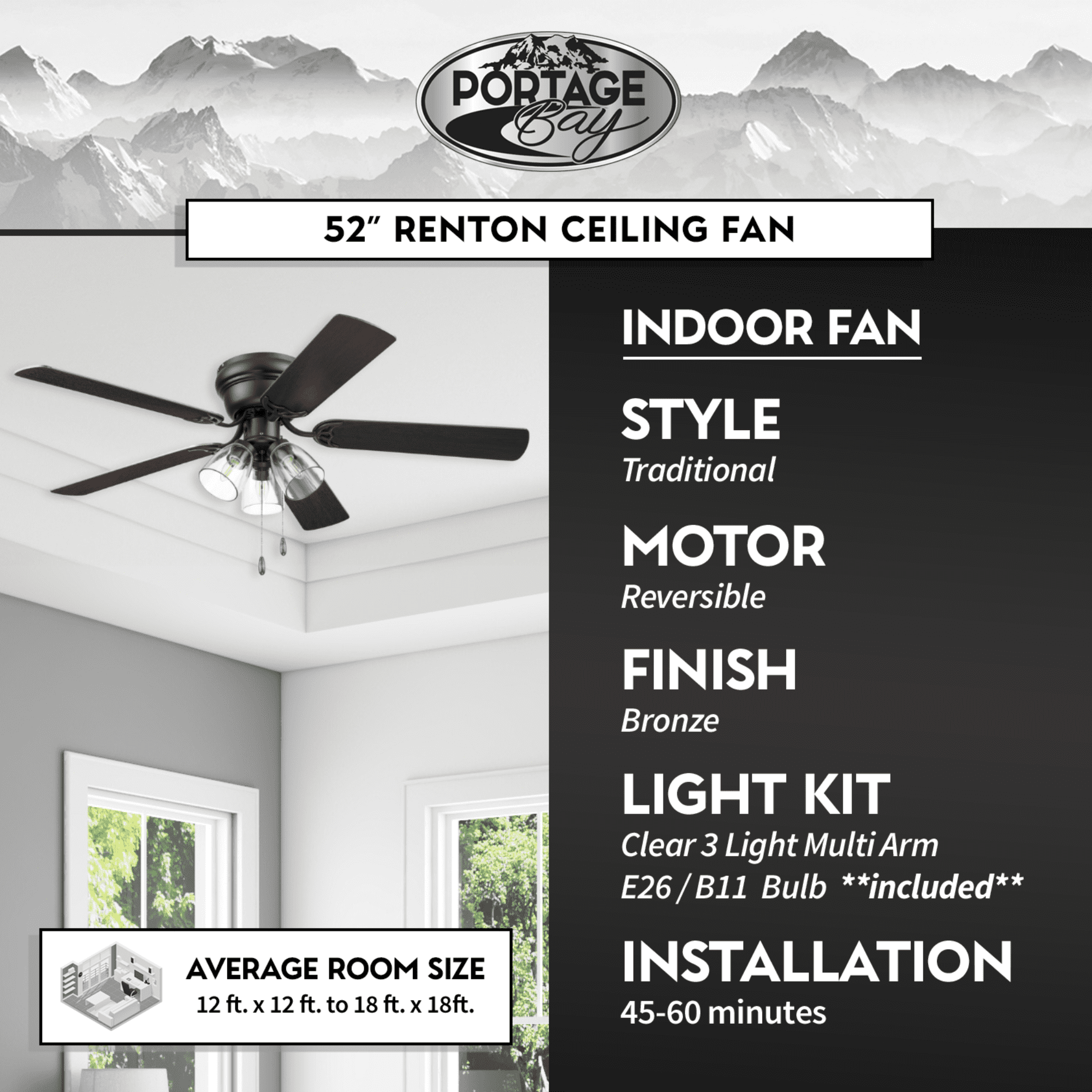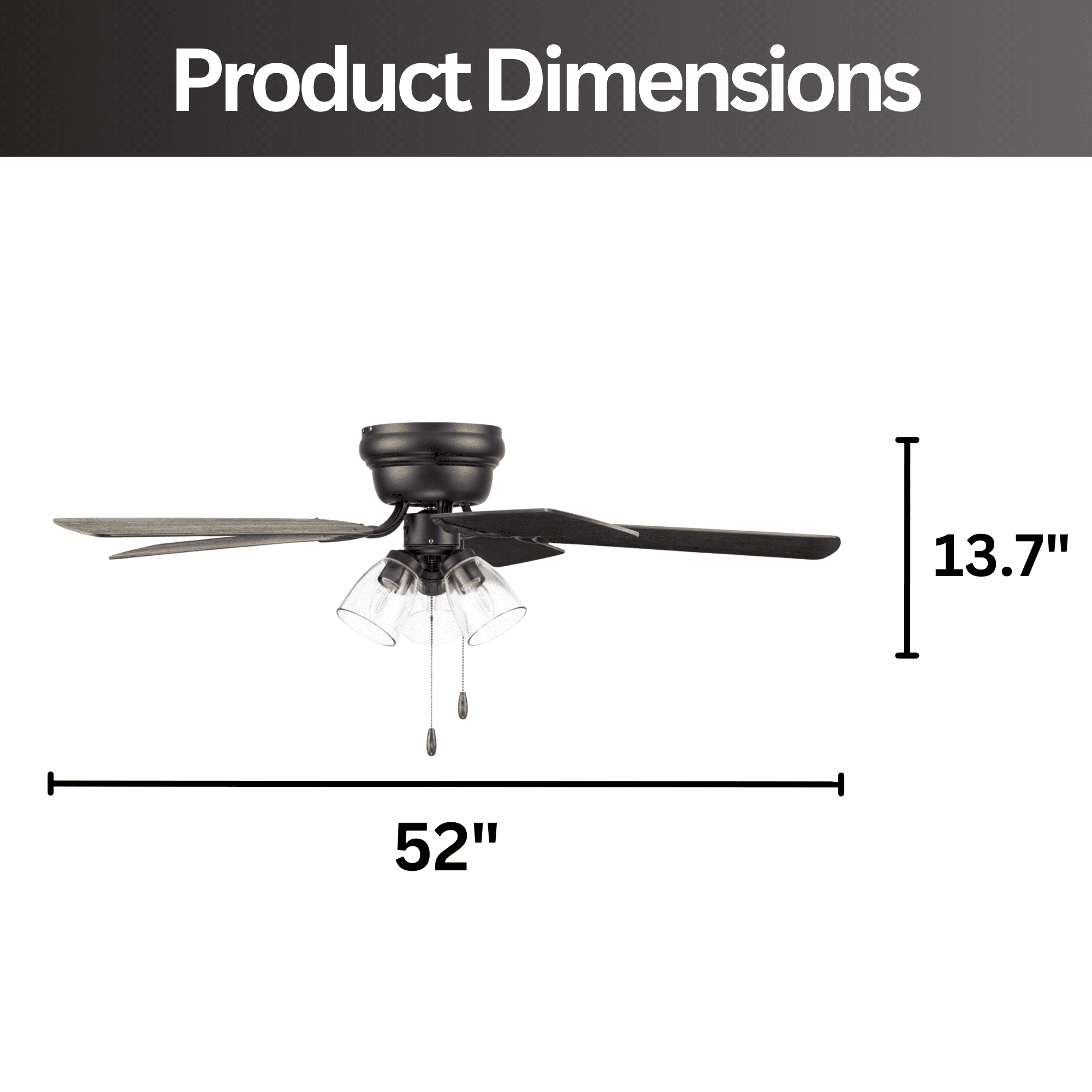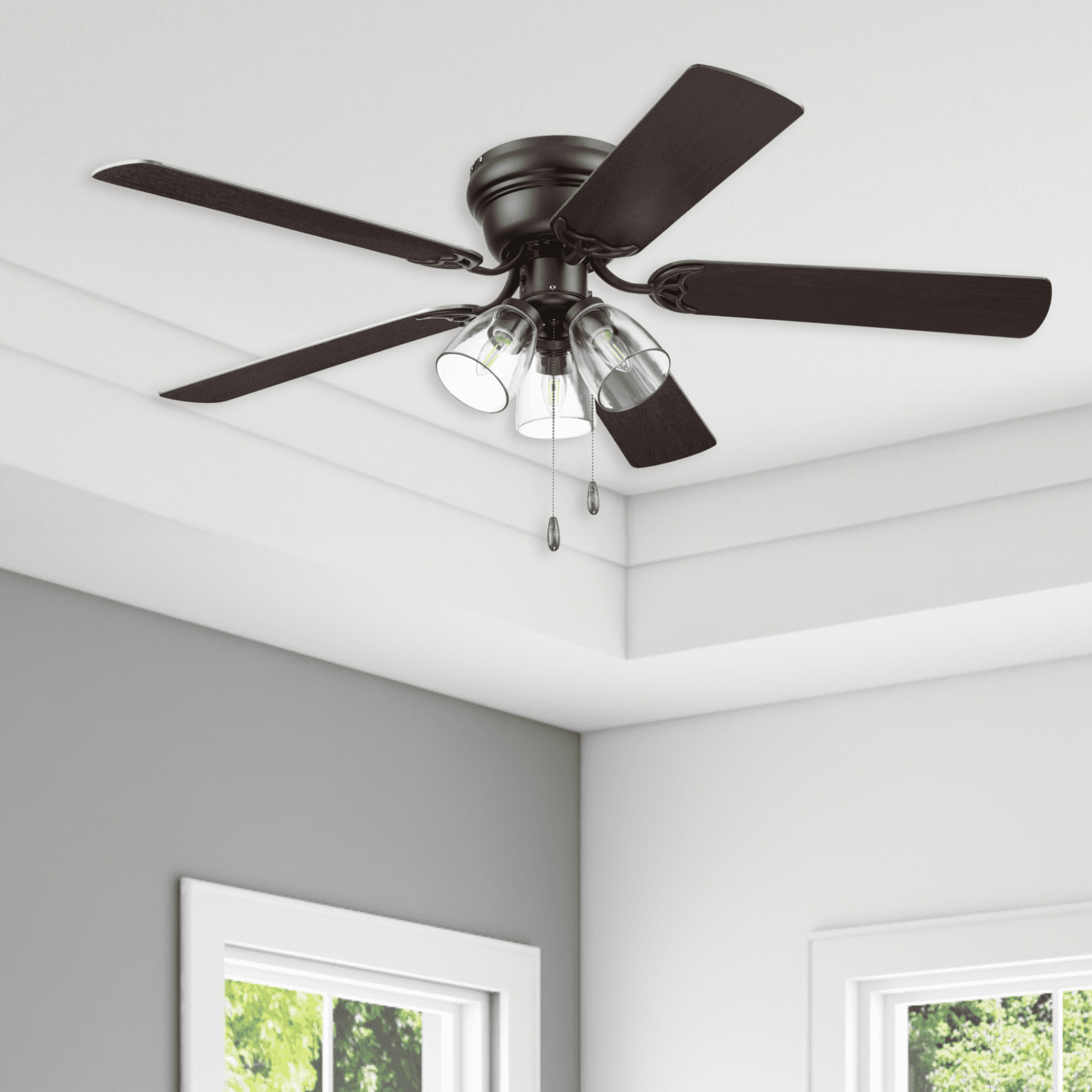 LIGHT KIT: This indoor ceiling fan features a clear glass branched light kit that houses 3 E26/Medium (Standard)/B11 bulbs(included). LARGE ROOM FAN: Having a blade span of 52 inches, this fan is perfect for medium to large rooms such as bedrooms, living rooms, & dining rooms. LOW PROFILE DESIGN: Flush mount ceiling fan, built for rooms where extra space is needed. This hugger ceiling fan is a compact cool solution to adding comfort to rooms with low ceilings. DUAL-FINISH REVERSIBLE BLADES: This ceiling fan comes with a different finish on each side of the blades. The bronze finish showcases reversible dark chestnut and rough pine blades. Pick the look that best fits your space! EASY TO USE: This flushmount ceiling fan uses pull chains for quick and easy on and off adjustments. QUIET, REVERSIBLE MOTOR: Conveniently quiet, 3 speed – reversible motor. Run counter-clockwise in the summer to produce a cooling downdraft and clockwise in the winter to aid in circulating warm air, cutting down on energy costs.