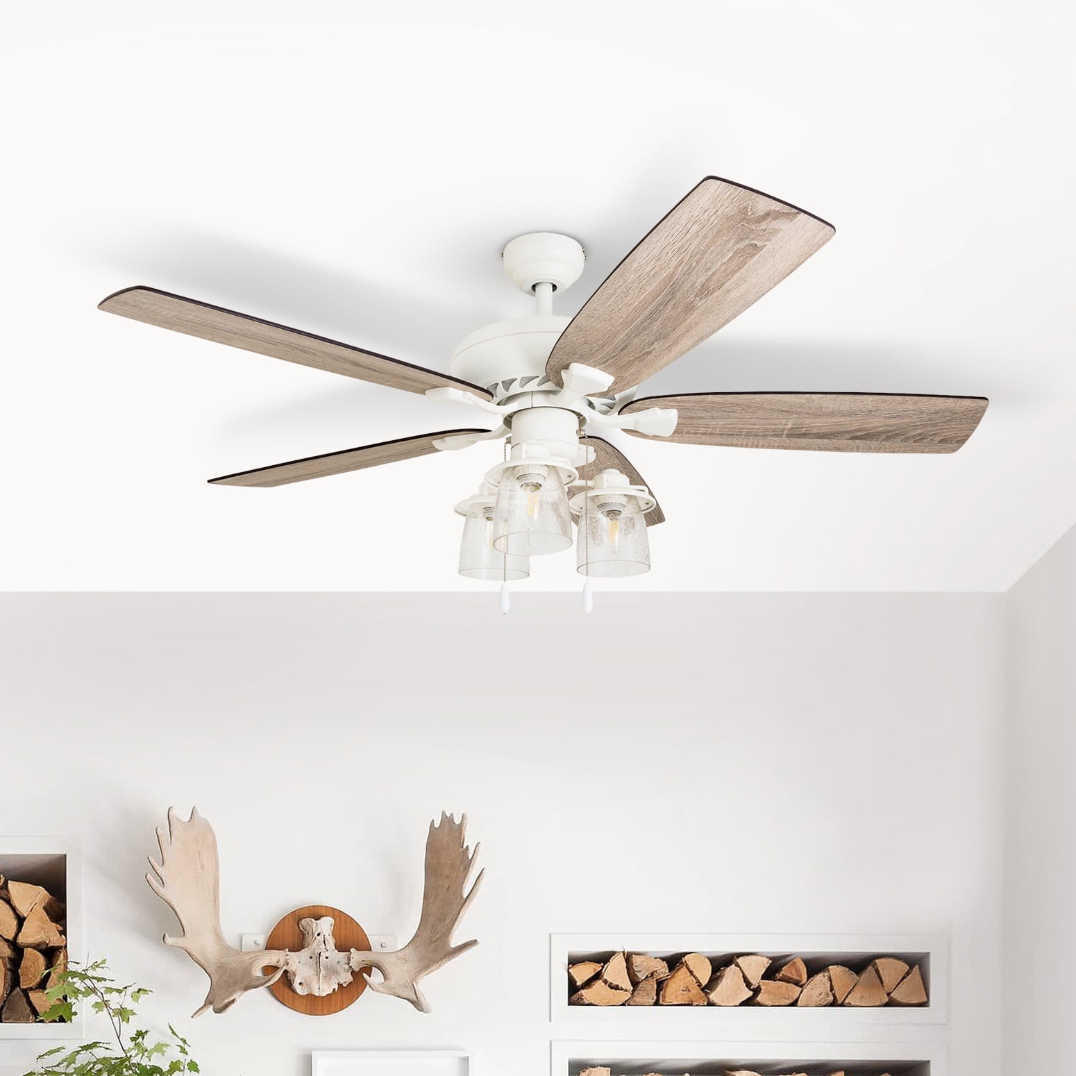 COASTAL STYLE: This coastal ceiling fan houses a soft white finish pairing perfectly with its driftwood undertones. The coastal theme of this fan offers such a relaxing aesthetic, evoking the breeziness of the beach but in the comfort of your home. We can’t get enough of this BoHo look ourselves. Who says you can’t bring some of that calming ambiance home with you? LARGE TO MEDIUM SPACES: Having a blade span of 52 inches, this fan is perfect for medium to large rooms. TRI MOUNT COMPATIBLE: Hanging has never been easier! Enjoy the dynamic hanging capabilities of a multiposition ceiling fan. This fan can be hung low profile where more walk through space is required, standard with a 4” downrod (included) or on angled ceilings (angle bracket sold separately)