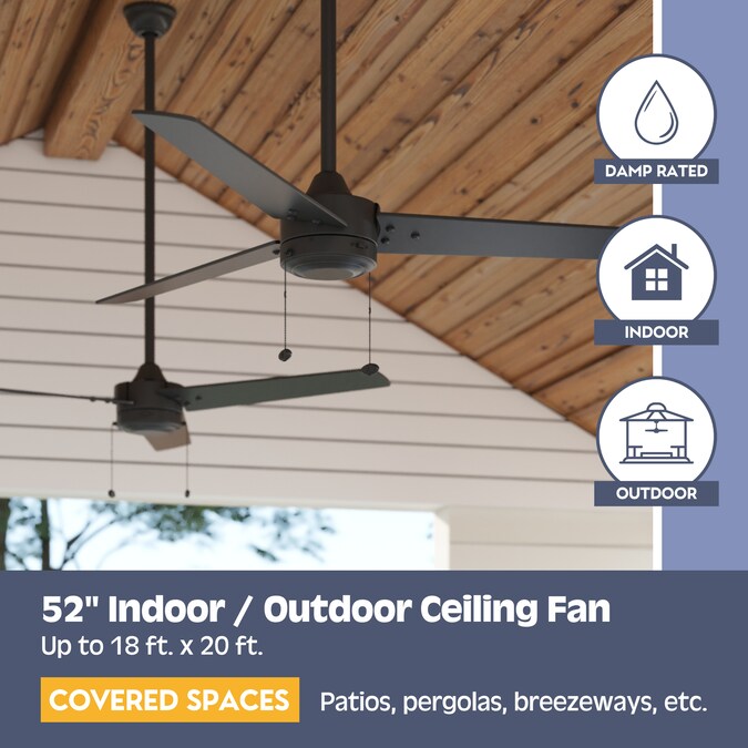- Indoor or Outdoor Ceiling Fan: This ceiling fan is damp rated so it is great for areas where moisture levels are high but it is still protected from direct rain; It can be hung both indoors or covered outdoor spaces like porches, garages, breezeways, etc