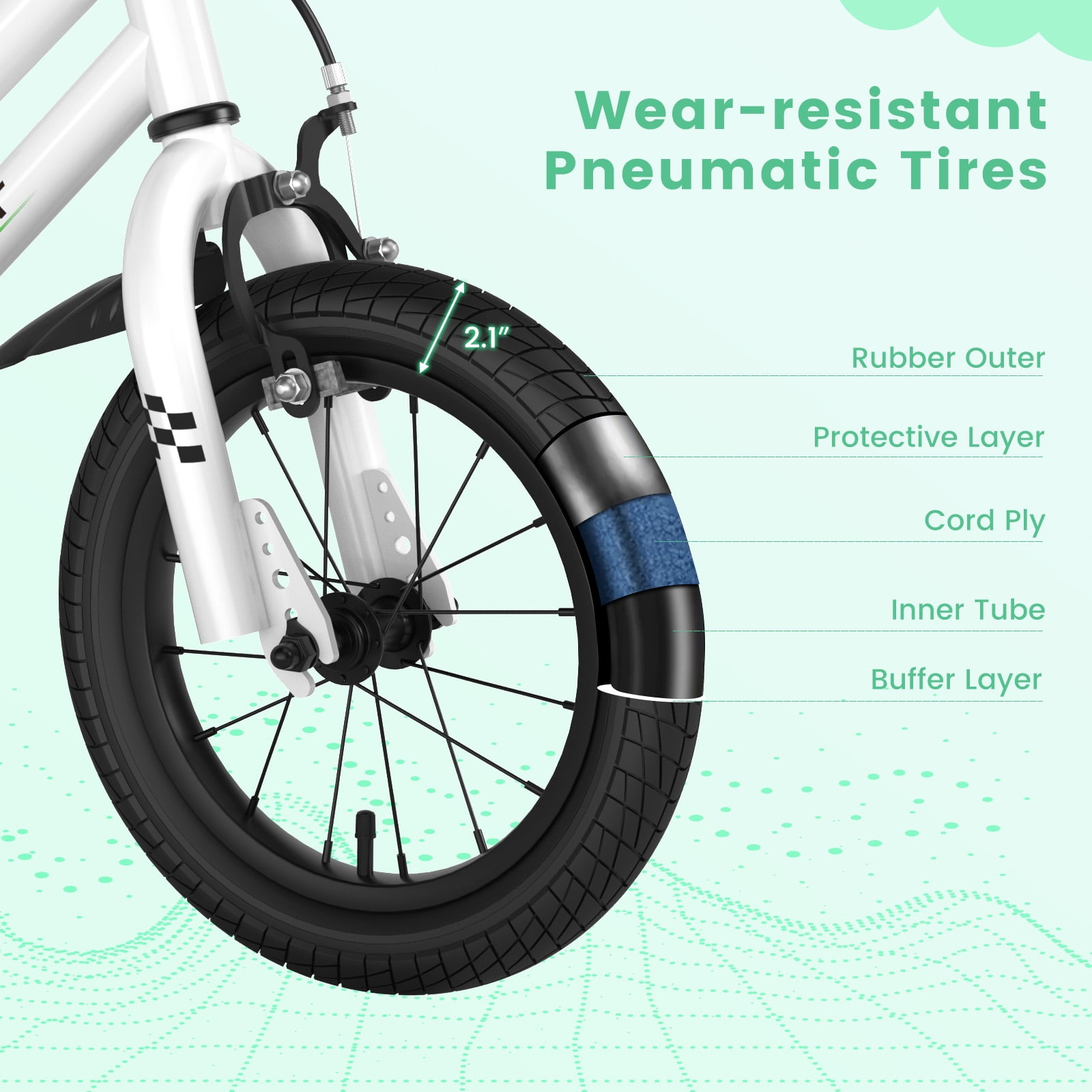 It’s time for kids to take the adventure with a cool toddler bike. This 14” children training bicycle is equipped with height-adjustable handlebar(26”-28.5”) and saddle(20”-24”) to meet your kids’ needs, and allows your little ones to ride with the most comfortable position. Besides, it is equipped with a dual brake system( including hand brake and coaster brake) and fully enclosed chain guard for high safety. The anti-slip pedals and wear-resistant tires enable kids to ride on various flat roads. Besides, 2 training wheels add more stability. The front detachable basket is a perfect place for kids to store their toys. Last but not least, this toddler bicycle comes with 95% pre-assembled design, which is easy for you to install it quickly and effortlessly. Note: Measure kid’s INSEAM and compare with SADDLE HEIGHT to check if the rider can touch the ground. Feature Height-adjustable handlebar & seat accompany kids to grow up Designed with hand brake which is shorter distance for kids’ small hands Equipped with coaster brake (pedal backwards to instantly stop) Removable storage basket for kids to place toys and snacks Ours: 95% pre-assembled design, better than others: 85% pre-assembled Wear-resistant pneumatic tires feature multiple layers: rubber outer, buffer layer, cord ply, inner tube and protective layer Extra training wheels make it suitable for beginners to ride Both training wheels can be removed if you need Fully enclosed chain guard to keep kids away from the drivetrain for safety Soft padded seat for kids to ride with utmost comfort Allows for hassle-free installation Premium carbon steel frame is sturdy and solid for long-term use Bell on the bar can help your boys and girls to remind others for safety Specification Color:White Material: Carbon Steel, PP, PVC, PP, TPR Overall Dimension: 41” x 20” x 26”-28.5” (L x W x H) Handbrake Height: 26”-28.5” Saddle Height: 20”-24” Saddle Size: 8.5” x 5.5”(L x W) Inseam Height: 18.5″-22.5″ Suitable Height: 37.5”-43.5” Suitable Age: 3-5 Years Old Weight Capacity of Seat: 99 lbs Net Weight: 21 lbs Package includes: 1 x Kid’s Bike 1 x Instruction