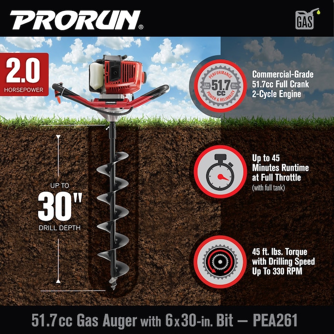 - Package Contents: Gas Auger Powerhead, Auger Kit (two separate boxes)