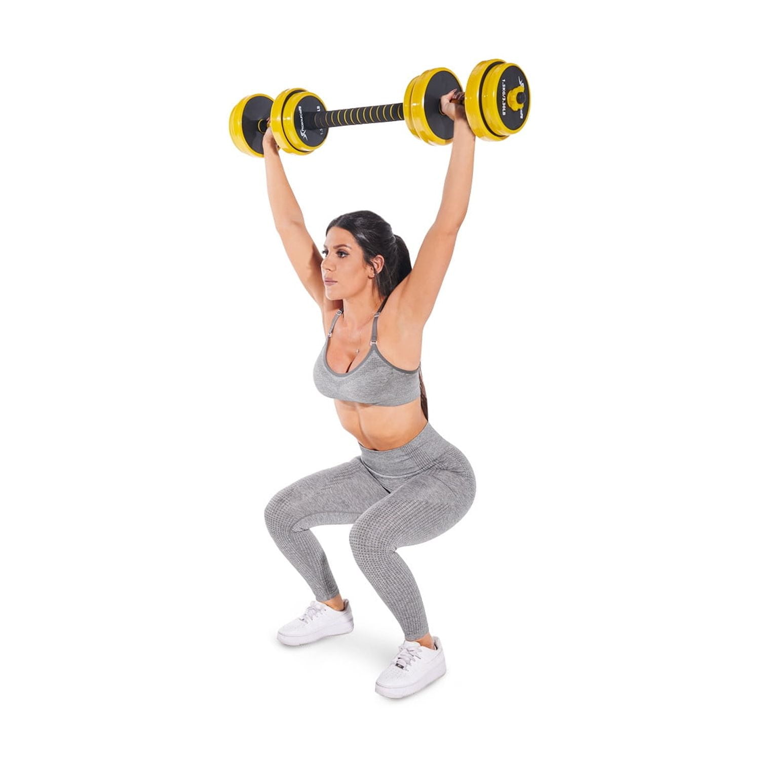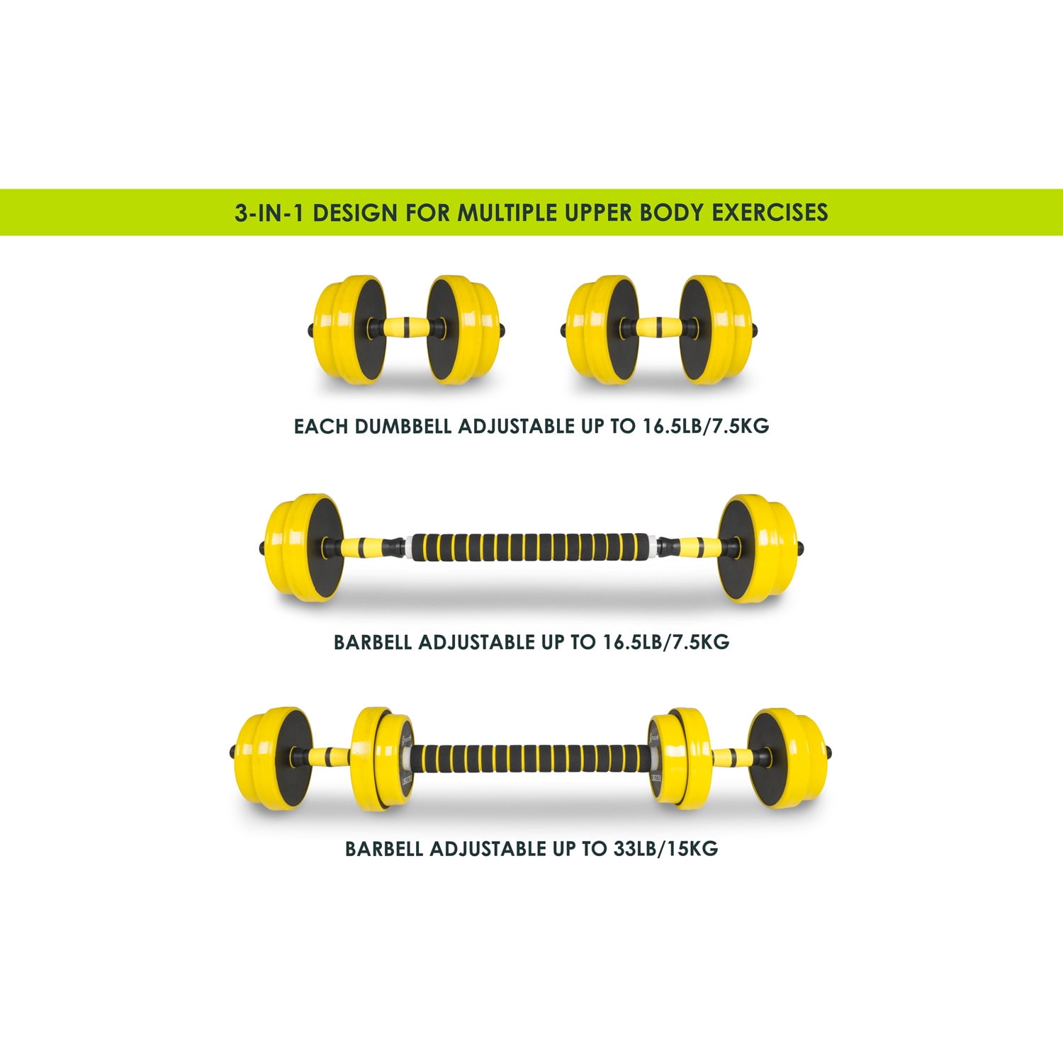 Adjustable Dumbbells and Barbell Set, 33LB 2-IN-1 DUMBBELL & BARBELL – Transition from dumbbells to a barbell in seconds! Easily attach the connecting rod to transform the hand weights into a barbell for ultimate versatility. Get your workout done with one piece of equipment. 8 ADJUSTABLE WEIGHTS – 8 weight plates are included: 3.3lb x 4, 4.4lb x 4. Mix and match weight plates to create the ideal weight for your workout. Easily slide plates on dumbbells and barbell and secure in place with the durable 4 spinlock collars. FOR ALL FITNESS LEVELS – From beginner to advanced, the free weight set is user friendly and easy to manage for different levels of exercises. Adjust as needed to perform your workout without any complications. SLIP-RESISTANT & CUSHIONED – Designed for comfort, dumbbells provide stabilization with the rubber coated plates while the barbell’s connecting rod gives the ultimate support for the individual to perform their best in their workout. SAVE SPACE & MONEY – With the 2-in-1 feature secured by spin-lock barbell collars, there’s no need to spend more on other gym equipment. Plus, your home gym will be set up for convenience and safety by the slip-resistant and cushioned attributes.