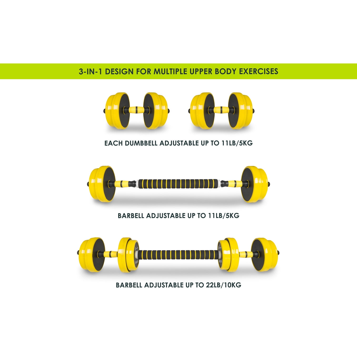 Adjustable Dumbbells and Barbell Set, 22LB 2-IN-1 DUMBBELL & BARBELL – Transition from dumbbells to a barbell in seconds! Easily attach the connecting rod to transform the hand weights into a barbell for ultimate versatility. Get your workout done with one piece of equipment. 8 ADJUSTABLE WEIGHTS – 8 weight plates are included: 2.2lb x 4, 2.75lb x 4. Mix and match weight plates to create the ideal weight for your workout. Easily slide plates on dumbbells and barbell and secure in place with the durable 4 spinlock collars. FOR ALL FITNESS LEVELS – From beginner to advanced, the free weight set is user friendly and easy to manage for different levels of exercises. Adjust as needed to perform your workout without any complications. SLIP-RESISTANT & CUSHIONED – Designed for comfort, dumbbells provide stabilization with the rubber coated plates while the barbell’s connecting rod gives the ultimate support for the individual to perform their best in their workout. SAVE SPACE & MONEY – With the 2-in-1 feature secured by spin-lock barbell collars, there’s no need to spend more on other gym equipment. Plus, your home gym will be set up for convenience and safety by the slip-resistant and cushioned attributes.
