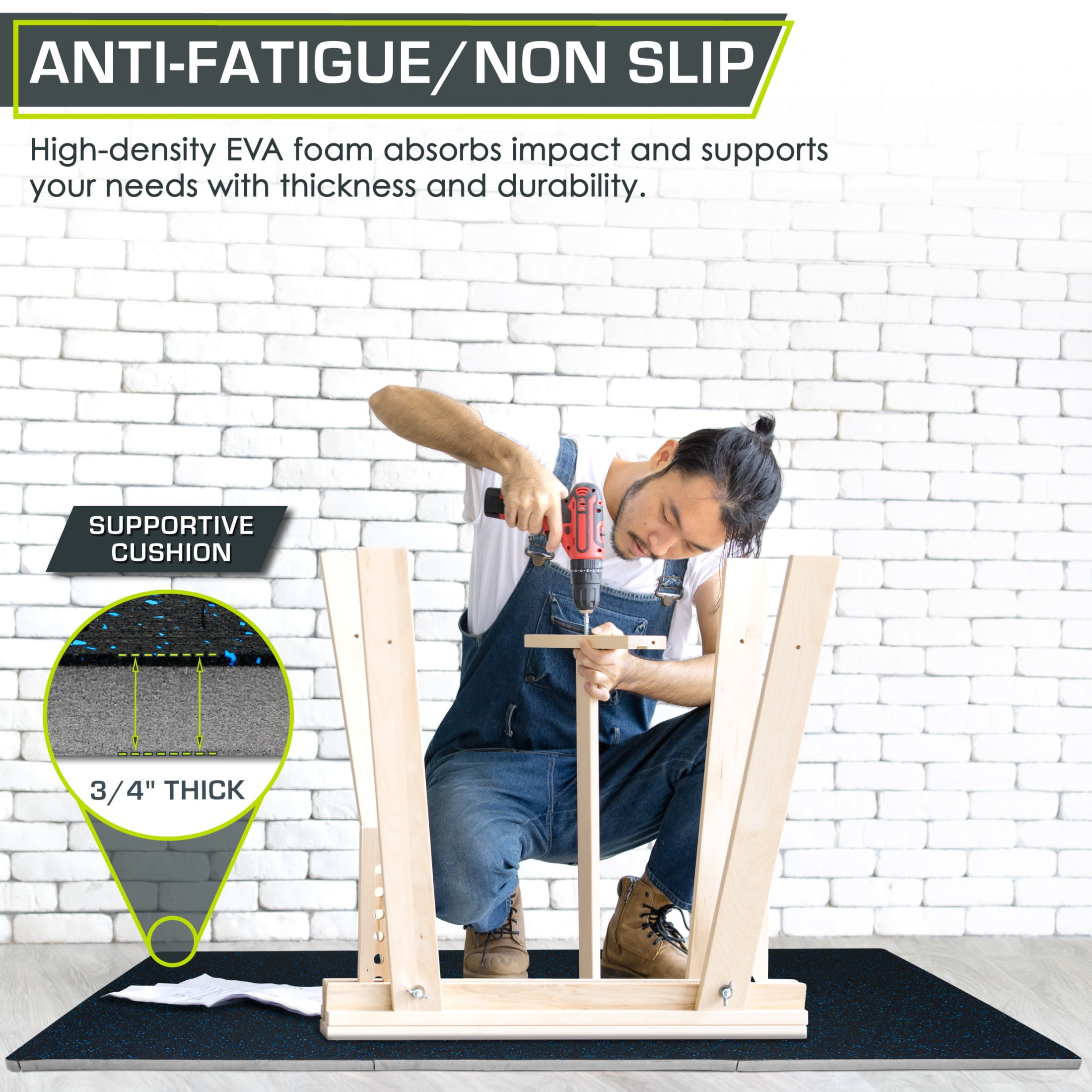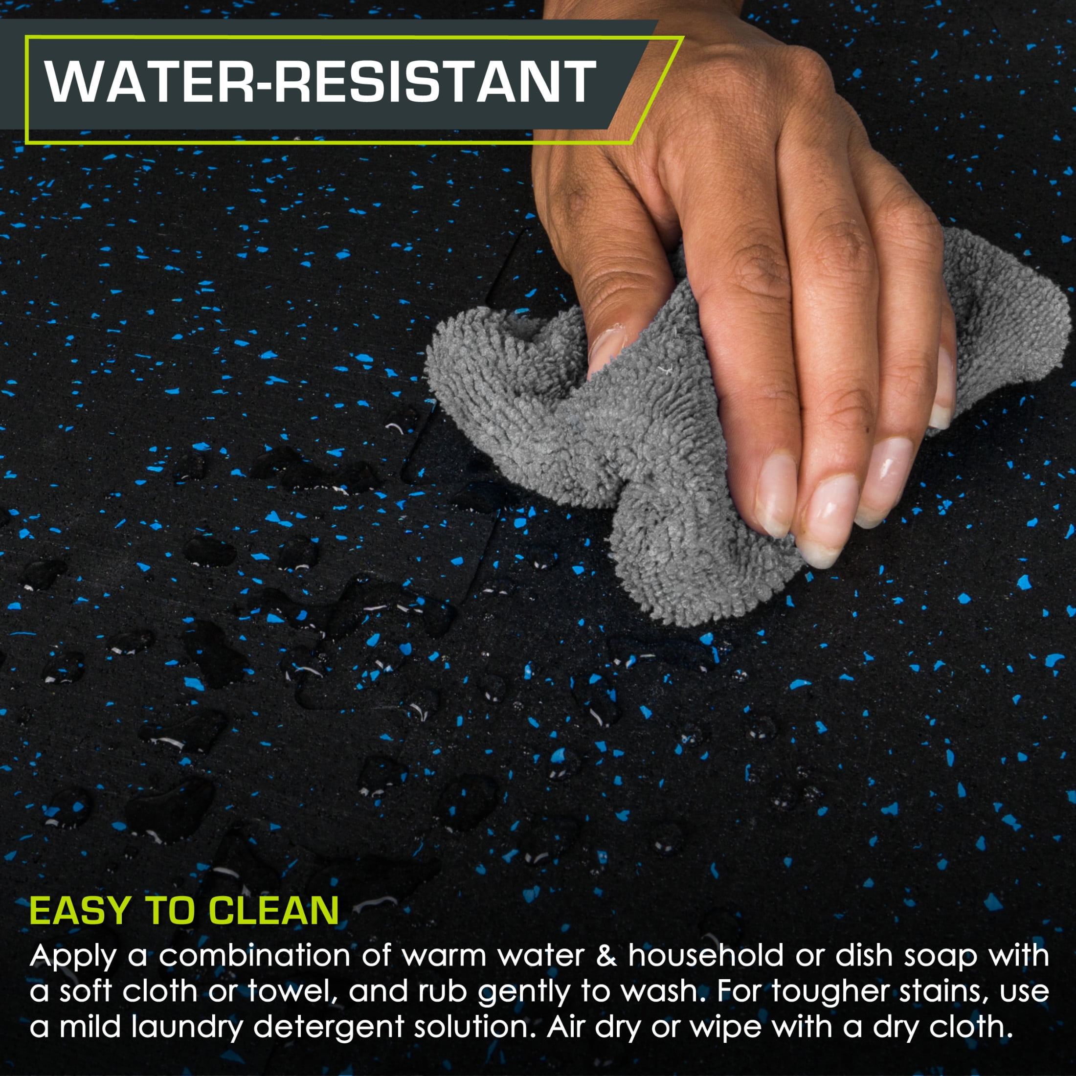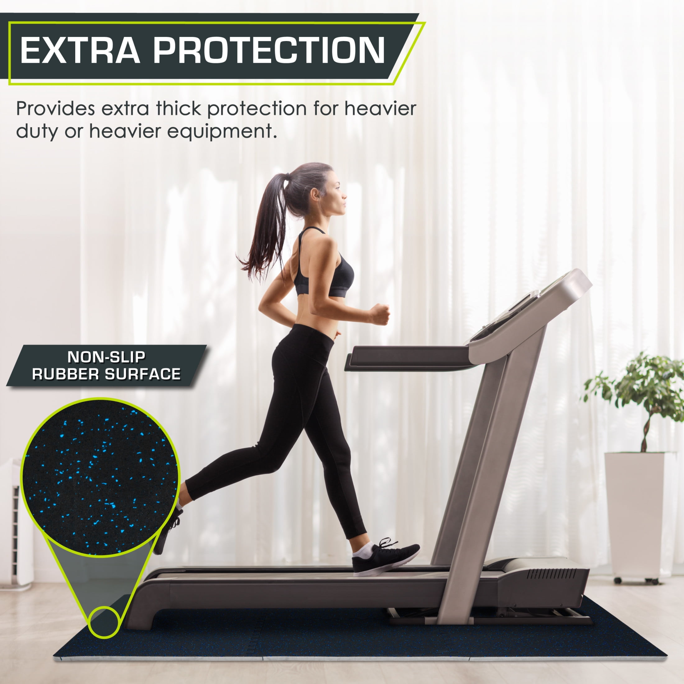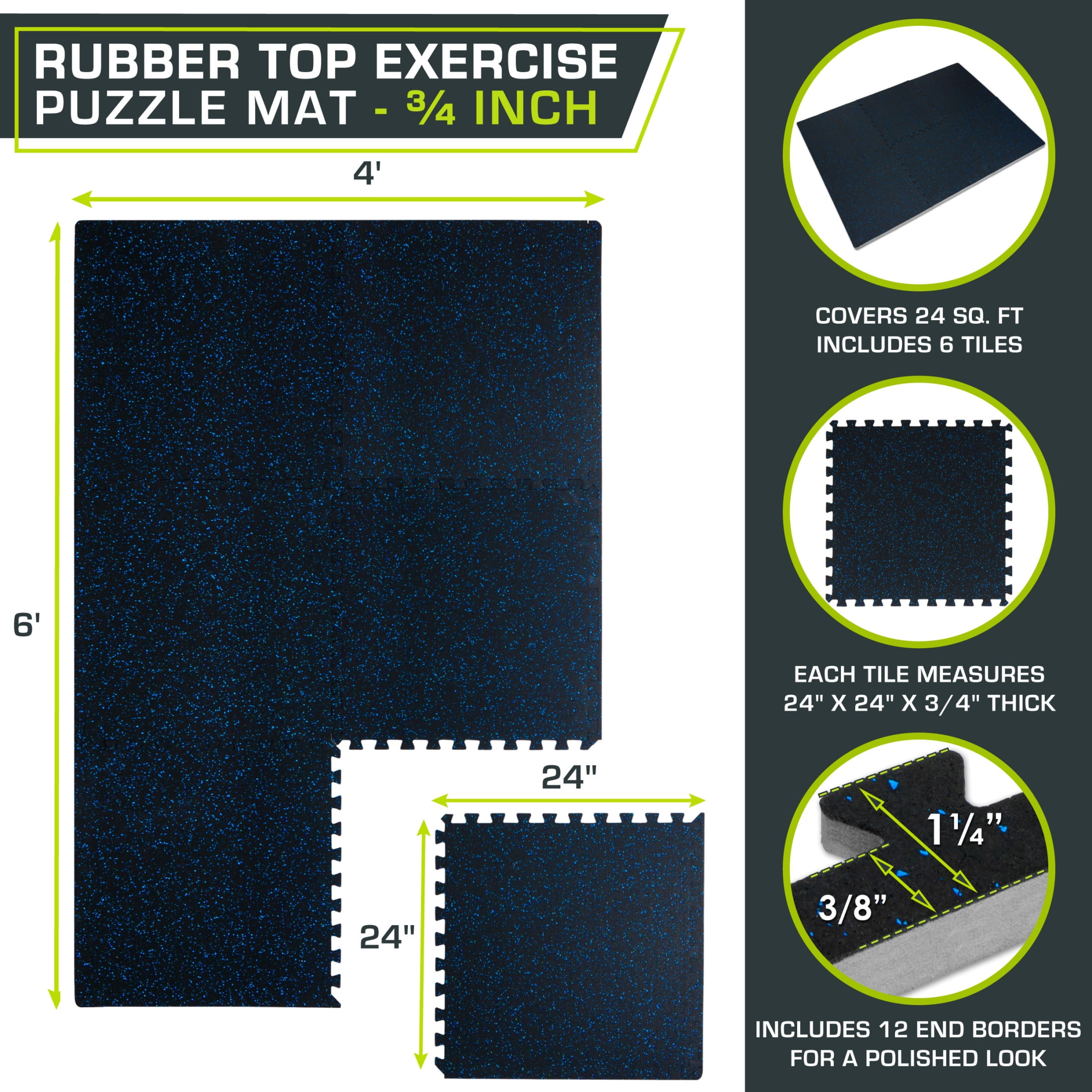 Rubber Top Exercise Puzzle Mat 3/4-in, Blue, 24 Sq Ft – 6 Tiles CUSHIONED WORKOUT SPACE – Turn hard floors into a comfortable, impact-absorbent surface for fitness and equipment. The ¾-inch tiles protect floors against scratches and dents from heavy equipment. TWO LAYERS OF SUPPORT – Textured rubber top layer with high-density EVA foam bottom layer creates the perfect shock-absorbent and non-slip surface. QUICK ASSEMBLY – The jigsaw design makes assembly quick and easy. Simply connect edges together and easily disassemble and move tiles around whenever you need. COVERS 24 or 48 SQUARE FEET – Each tile measures 24-in x 24-in x ¾-in. Includes end borders for clean edges and polished look. NON-SLIP & ABSORBS IMPACTS – The speckled rubber top offers a non-slip, textured surface and the high-density foam underneath absorbs impact and protects your floors damage.