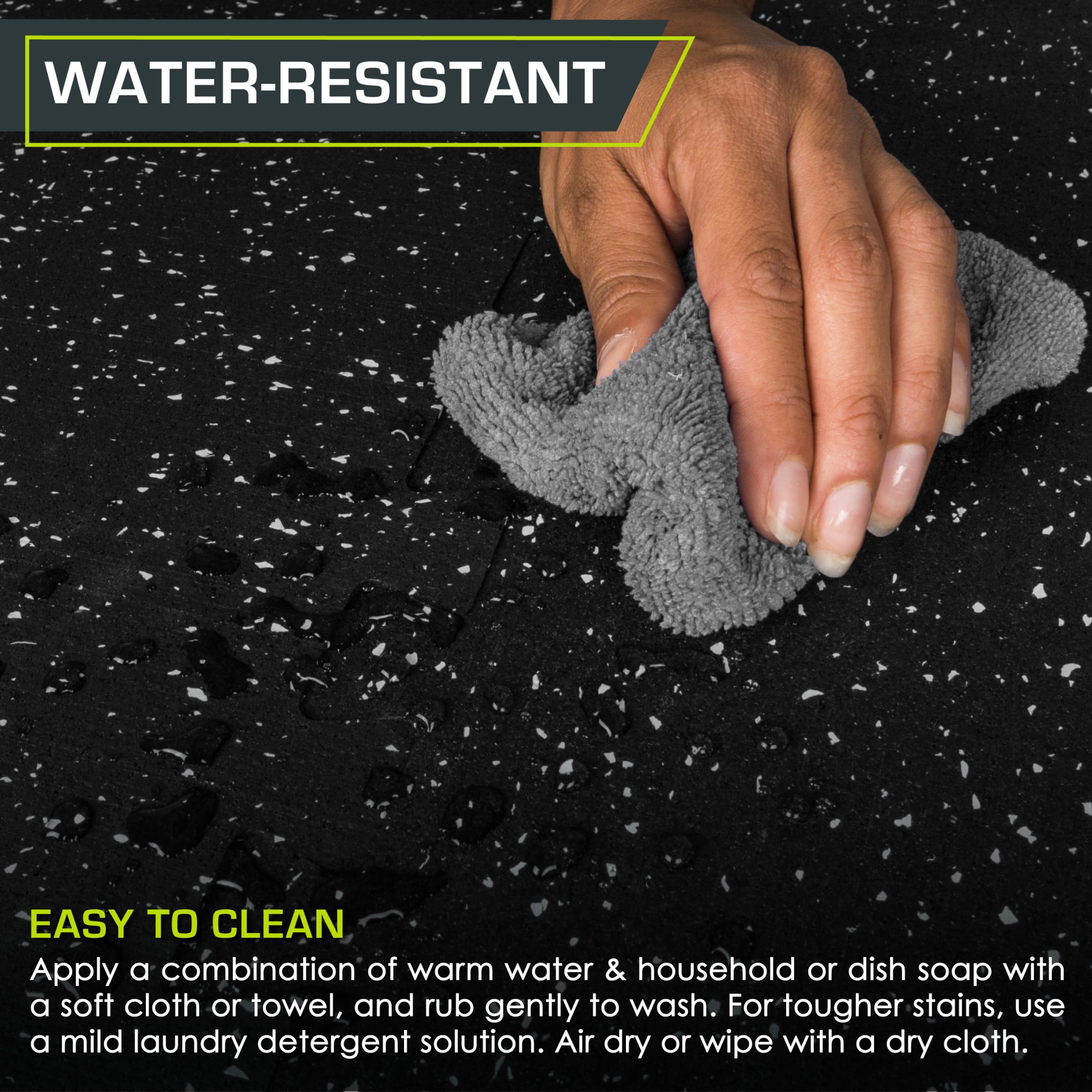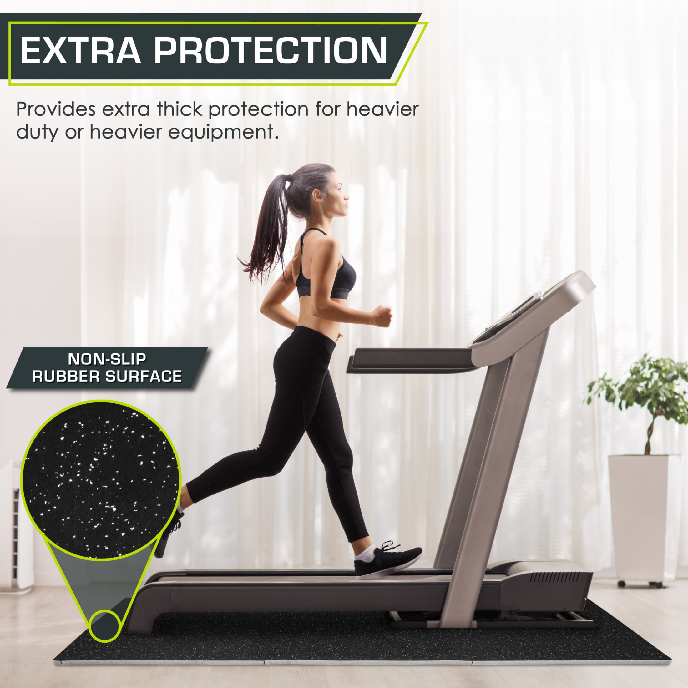 Rubber Top Exercise Puzzle Mat 3/4-in, Grey, 24 Sq Ft – 6 Tiles CUSHIONED WORKOUT SPACE – Turn hard floors into a comfortable, impact-absorbent surface for fitness and equipment. The ¾-inch tiles protect floors against scratches and dents from heavy equipment. TWO LAYERS OF SUPPORT – Textured rubber top layer with high-density EVA foam bottom layer creates the perfect shock-absorbent and non-slip surface. QUICK ASSEMBLY – The jigsaw design makes assembly quick and easy. Simply connect edges together and easily disassemble and move tiles around whenever you need. COVERS 24 or 48 SQUARE FEET – Each tile measures 24-in x 24-in x ¾-in. Includes end borders for clean edges and polished look. NON-SLIP & ABSORBS IMPACTS – The speckled rubber top offers a non-slip, textured surface and the high-density foam underneath absorbs impact and protects your floors damage.