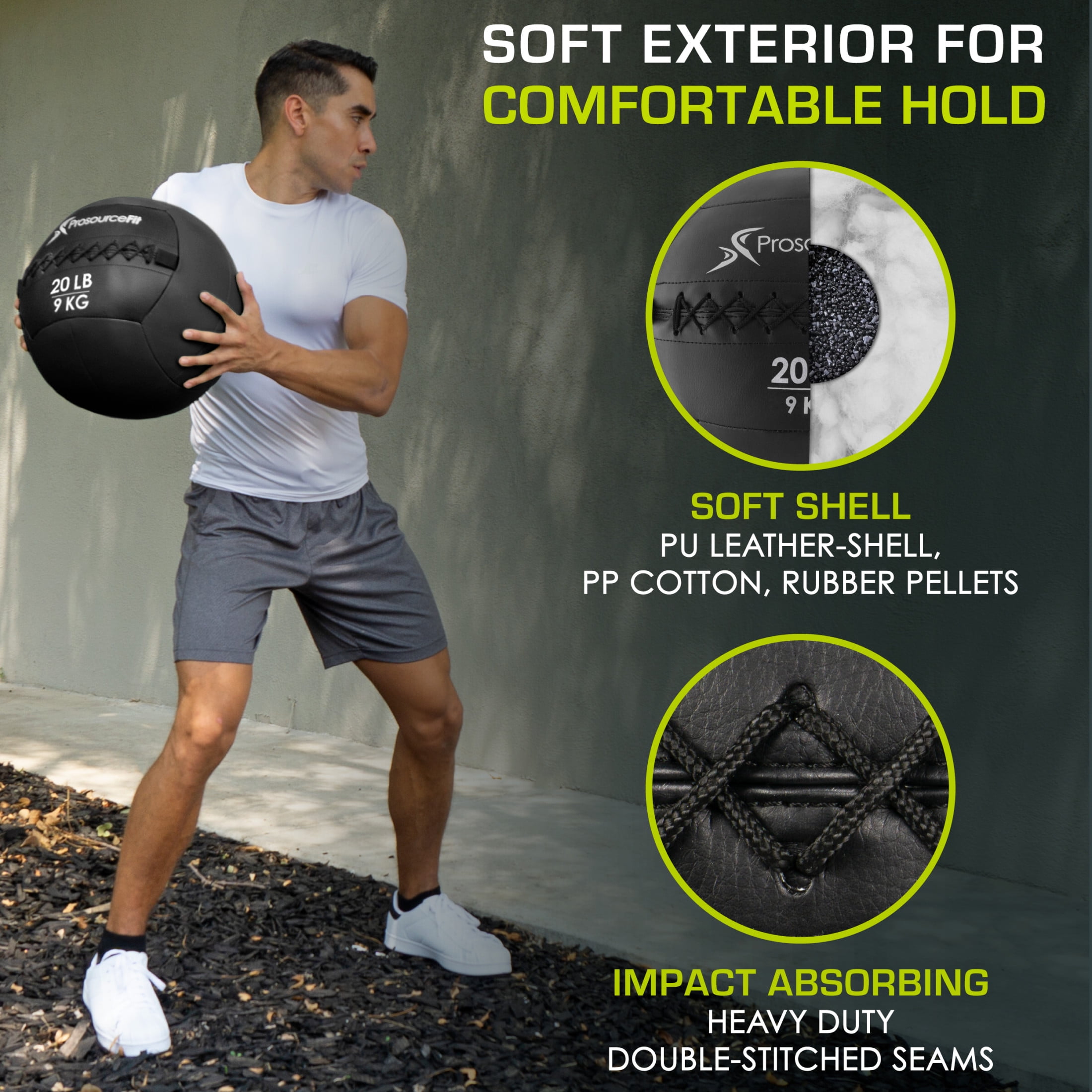 Soft Medicine Ball, 20lb FUNCTIONAL EXERCISE – Versatile for cross-training workouts, power and agility training, core exercises, functional fitness and strength SOFT SHELL – PU leather exterior is soft to the touch, with a padded interior with slight give to catch and grip comfortably IMPACT-ABSORBING – Cushioned design absorbs impact during strength and power exercises and is held together with heavy duty double-stitched seams LONG-LASTING – Durable PU leather material is water resistant and scuff resistant for a long-lasting ball that is perfect for home or gym CONSISTENT SIZE – Constructed to maintain a balanced weight and is 14” in diameter, making it easy to hold and toss against a wall or with a partner