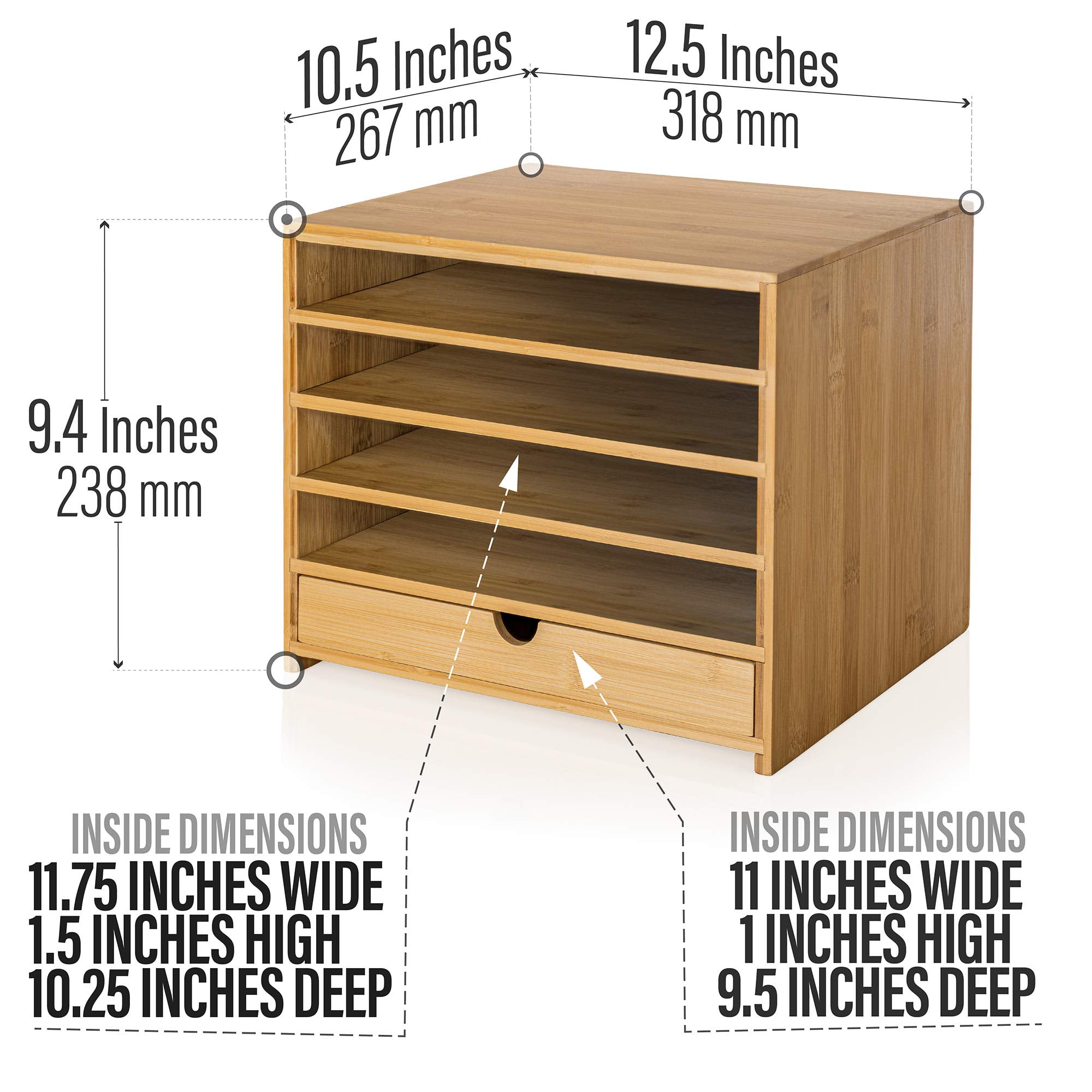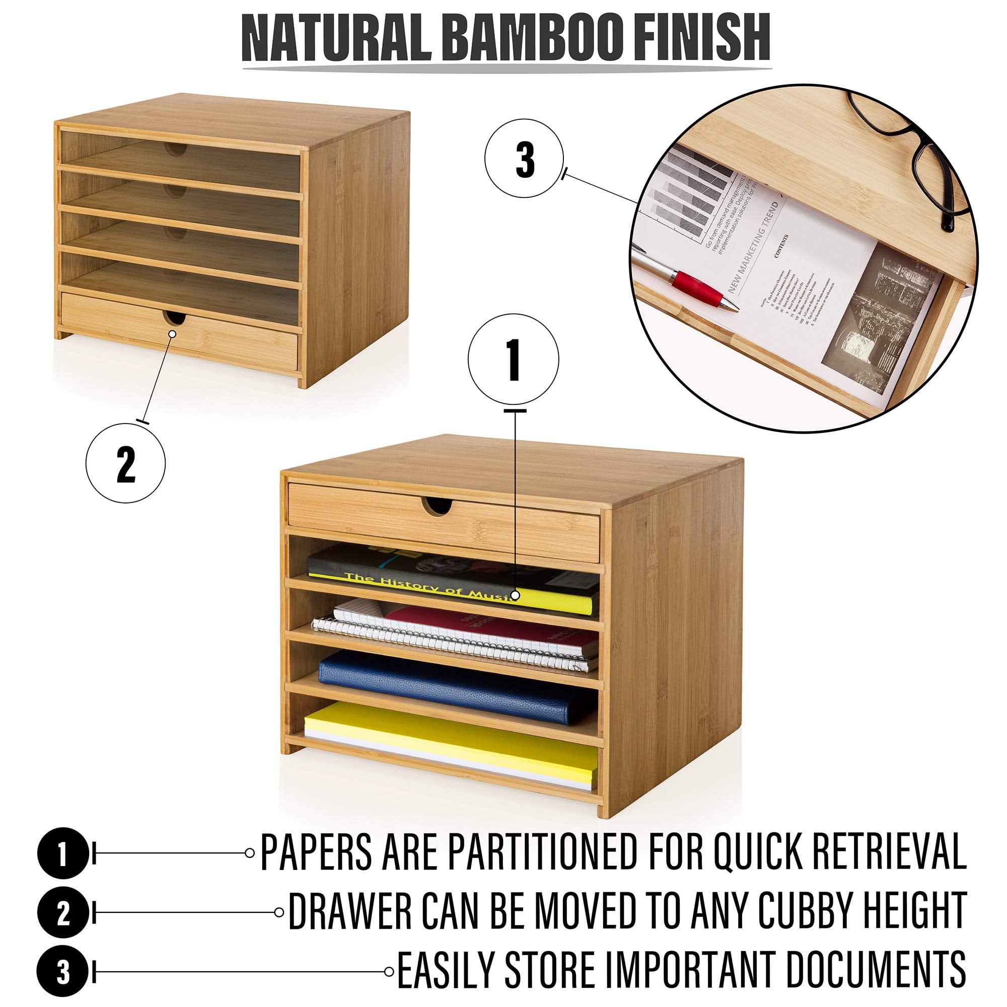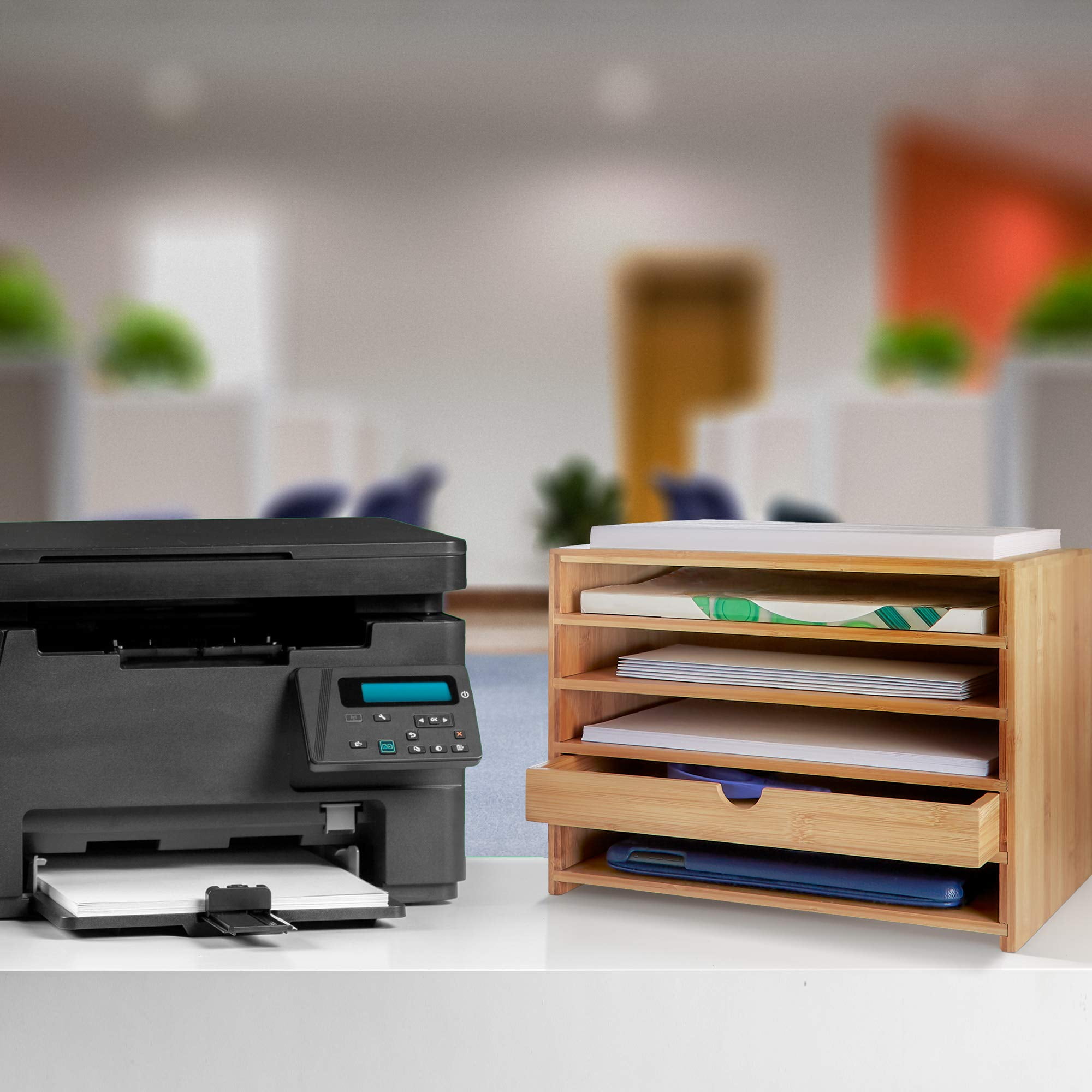 [STYLISH ORGANIZATION]: : A beautiful and durable bamboo paper organizer. swiftly declutter your desk, kitchen and home office. Sturdy and stylish. [PAPER STORAGE AND DRAWER] : Four open compartments for keeping 8.5 x 11-inch paper, with an additional pull-out drawer for accessories. Stay stocked with the exact paper you need, especially when your next report, school paper or grocery list needs to be ready by yesterday. [COMPACT DESIGN] : A compact footprint for minimizing table space next to your printer, offering efficient vertical space for all your paper storage needs. [PREMIUM HIGH-QUALITY MATERIAL] : Constructed from sturdy, sustainable material with a beautiful finish that looks great in any home or office environment. more tensile strength than steel in addition to being naturally durable and easy to clean. NO ASSEMBLY REQUIRED] : Ready to start organizing your printer paper and storage needs right out of the box. this tabletop assistant will bring functionality to any cluttered workspace or countertop.