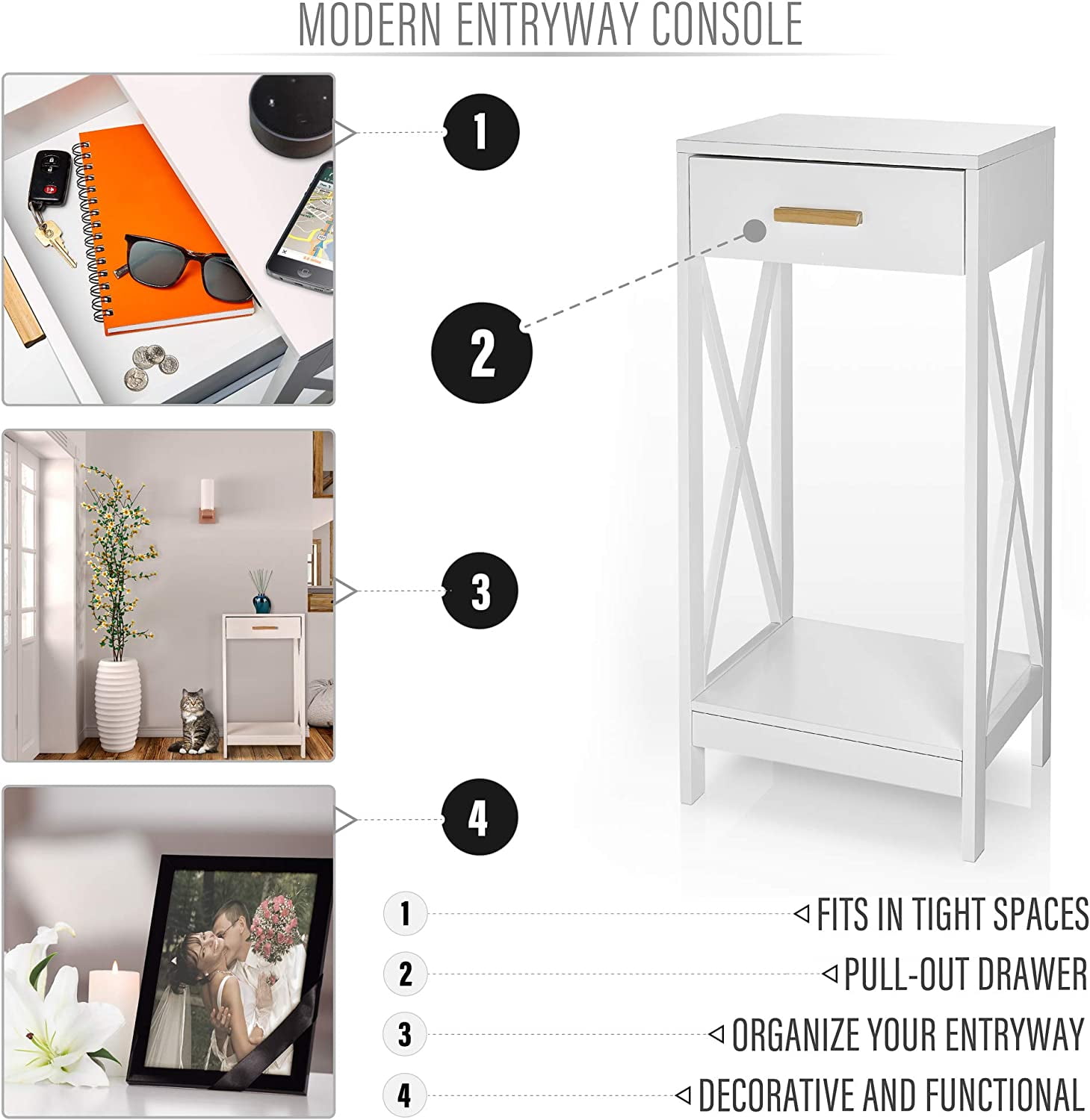 ORGANIZE ENTRYWAYS & BEDROOMS: Conquer clutter with a hybrid table and nightstand that can hold phones, glasses and knickknacks to often go missing COMPACT & SPACIOUS: Its narrow profile fits large and small spaces alike, from hallways to living rooms, bedrooms and anywhere storage is needed EXTRA PULLOUT DRAWER WITH BEECHWOOD HANDLE: Keep keys, wallets and other living essentials out of sight while knowing exactly where to find them later DECORATIVE & FUNCTIONAL: Add utility and elegance to entryways and bedrooms with a modern, décor-neutral solution that blends easily with any room SAFE BAG STORAGE: Place larger items like backpacks, suitcases and purses on the bottom shelf to avoid accidents from accidental tripping ORGANIZE ENTRYWAYS & BEDROOMS: Conquer clutter with a hybrid table and nightstand that can hold phones, glasses and knickknacks to often go missing COMPACT & SPACIOUS: Its narrow profile fits large and small spaces alike, from hallways to living rooms, bedrooms and anywhere storage is needed EXTRA PULLOUT DRAWER WITH BEECHWOOD HANDLE: Keep keys, wallets and other living essentials out of sight while knowing exactly where to find them later DECORATIVE & FUNCTIONAL: Add utility and elegance to entryways and bedrooms with a modern, dcorneutral solution that blends easily with any room SAFE BAG STORAGE: Place larger items like backpacks, suitcases and purses on the bottom shelf to avoid accidents from accidental tripping