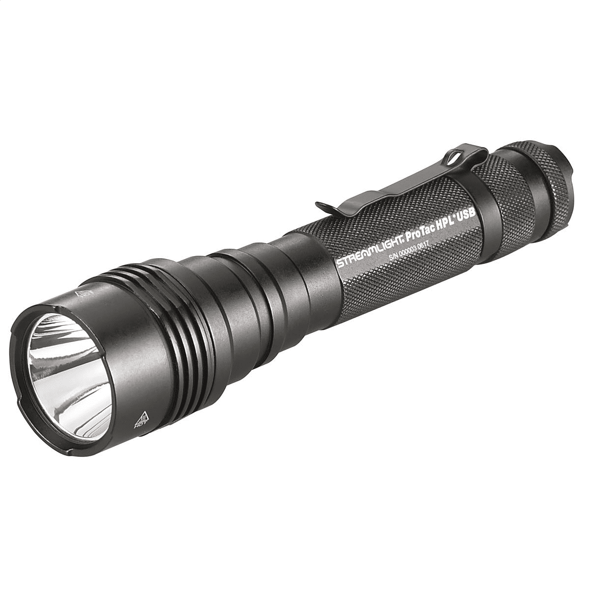 Features and Benefits:?1,000 lumens and 374 meter beam on High?Switch to Low for 20 hours of runtime?Battery versatility – use micro USB port or disposable lithium batteries?High/Medium/Low/Strobe modes?TEN-TAP Programming to choose your preferred operating mode?Anti-roll head prevents it from rolling away when you set it down?Durable aluminum construction and IPX4 water resistantThe Pro Tac® HPL USB is a versatile tactical light that can charge from multiple sources and use three battery types; Streamlight P/N 74175 rechargeable lithium ion battery, two CR123A batteries, or Streamlight® SL-B26™ protected Li-Ion USB rechargeable battery pack (see Battery detail below). This light will charge from a laptop or most USB wall chargers. Multi battery versatility means you can always use primary disposable cells to power the light when a charging source is not available. Designed for use in all markets, it features a tail cap switch for momentary or constant on operation, three different user selectable programs and a pocket clip for convenience. The aluminum housing with Type II Military Spec anodizing helps make the light extremely durable and abrasion resistant. Packaged with a removable pocket clip and holster. Available in Black.