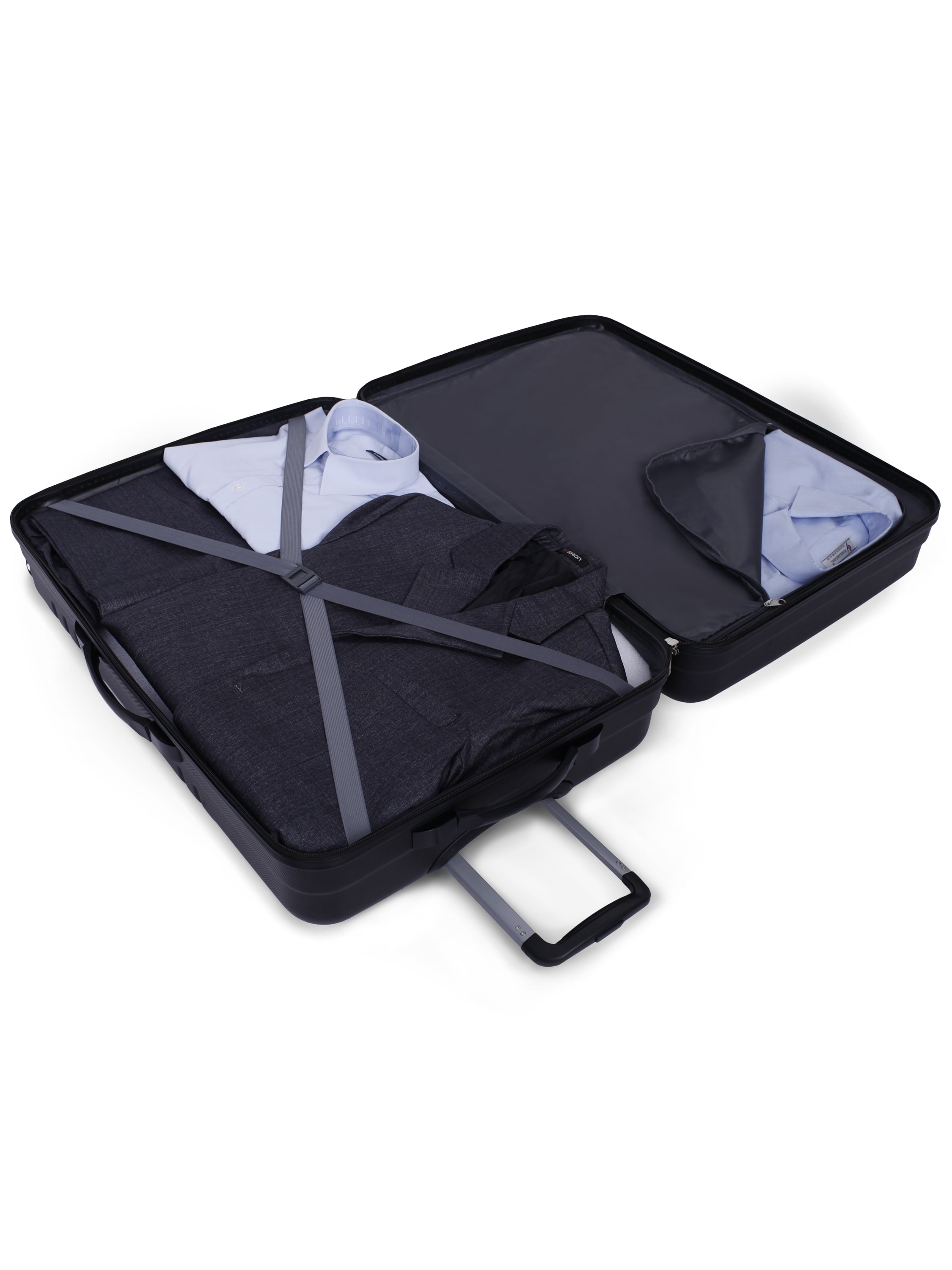 Made from durable and scratch resistant ABS material This luggage set includes a 20-inch & 28-inch hard side spinners and a matching 20-inch carry on duffel. An interior compartment divider helps keep your contents separate until you reach your destination Find the height that works best for you using the adjustable push-button telescopic handle Travel quick and turn on a dime with the four 360-degree spinner wheels Make more room for souvenirs with and added expansion of up to 2-inches Top and side carry handles allow you to grab your bag from multiple positions 28″ Spinner interior dimensions: 19.4″L x 11.2″D x 28″H 28″ Spinner exterior dimensions (with wheels):19.4L x 11.2″D x 29.5″H 20″ Spinner interior dimensions: 14″L x 9″D x 20″H 20 Spinner exterior dimensions (with wheels): 14″L x 9″D x 21″H Duffel bag dimensions: 14″L x 10″D x 20″H Available in sleek black finish Exclusive to and This luggage set includes a 20-inch & 28-inch hard side spinners and a matching 20-inch carry on duffel An interior compartment divider helps keep your contents separate until you reach your destination Find the height that works best for you using the adjustable push-button telescopic handle Travel quick and turn on a dime with the four 360-degree spinner wheels 28″ Spinner interior dimensions: 19.4″L x 11.2″D x 28″H 28″ Spinner exterior dimensions (with wheels):19.4L x 11.2″D x 29.5″H 20″ Spinner interior dimensions: 14″L x 9″D x 20″H 20 Spinner exterior dimensions (with wheels): 14″L x 9″D x 21″H Duffel bag dimensions: 14″L x 10″D x 20″H