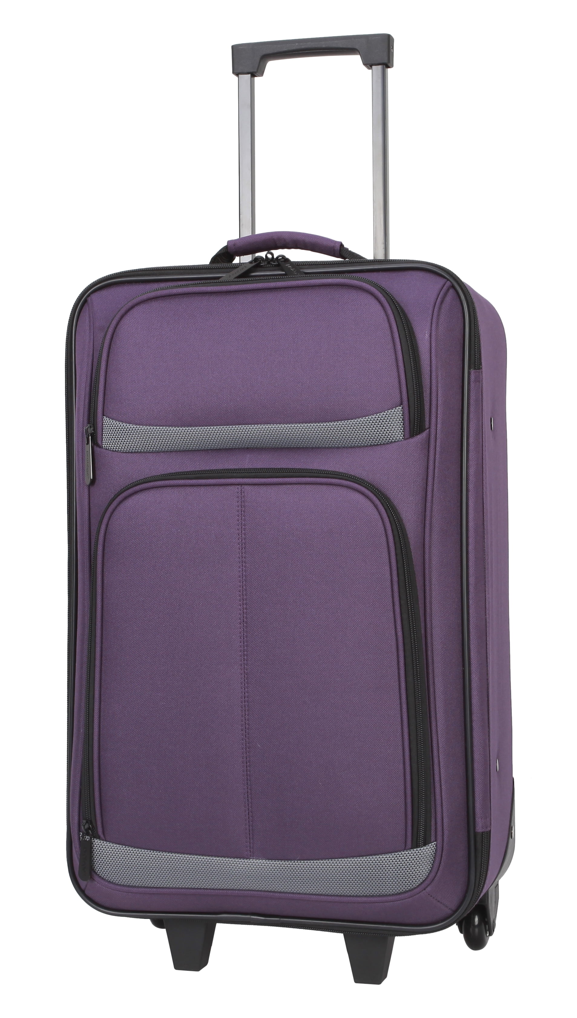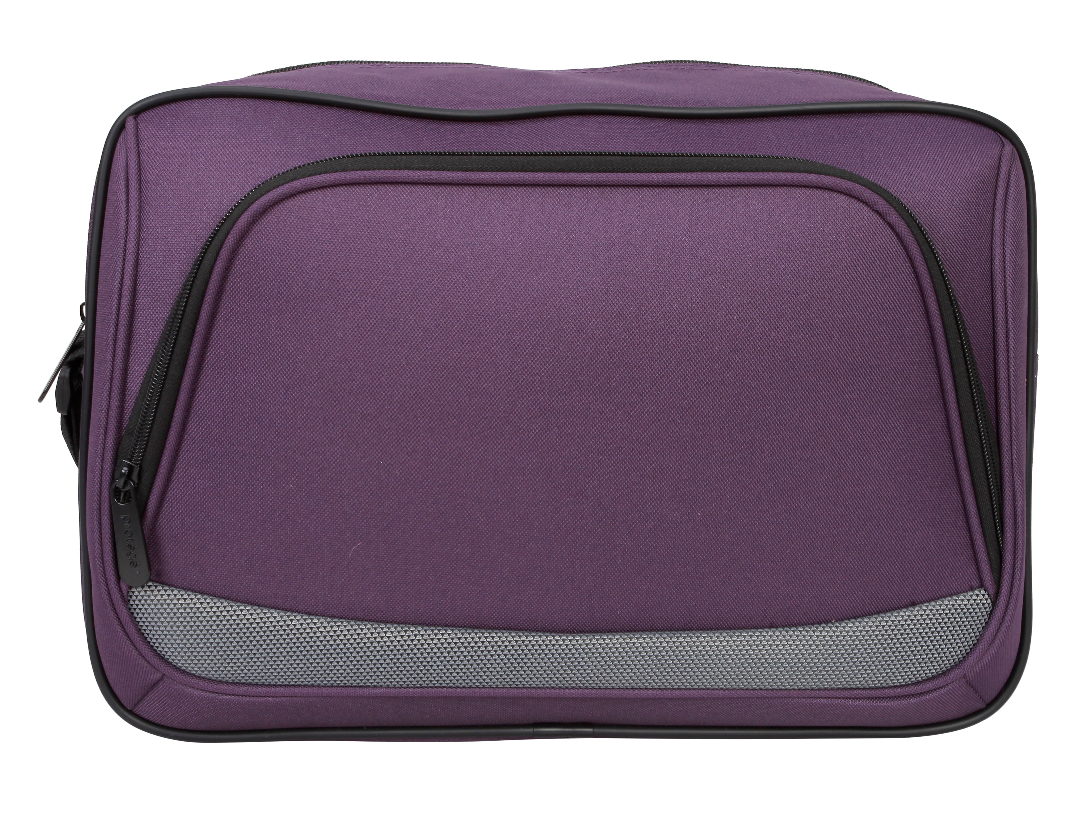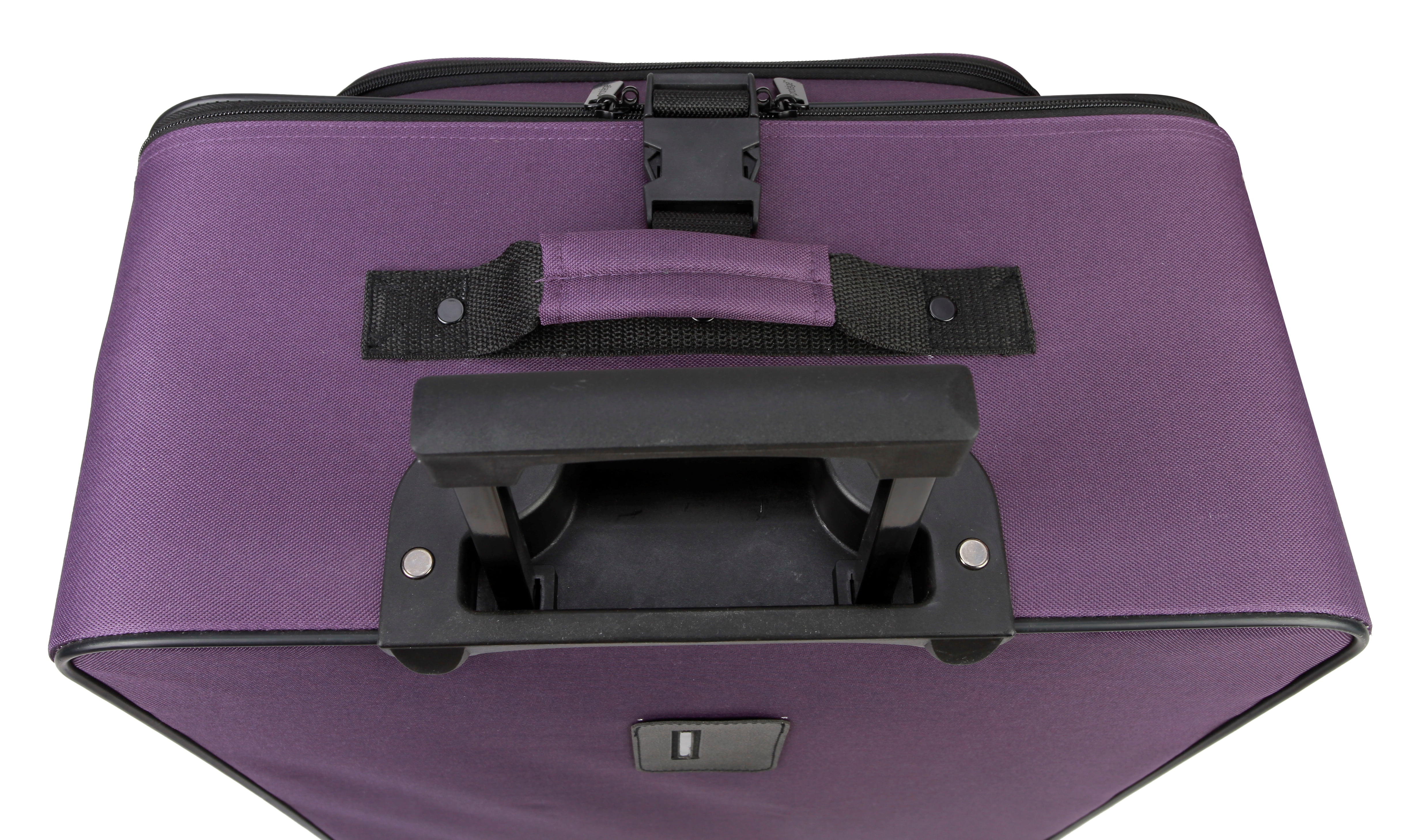 Protege 5-Piece Softside Luggage Set, Purple Set includes one 28″ upright, one 21″ upright, one boarding tote, one toiletry kit, and one cinch sack 28″ and 21″ uprights have 2 in-line skate wheels, telescoping handles, and an interlocking zipper system Upright Dimensions (28 in – 9.75″L x 18.25″D x 27.5″H without wheels), (21 in – 8″L x 13.5″D x 21.25″H without wheels) Accessory Dimensions: Tote (5.75″L x 15″D x 10.25″H), Toiletry Kit (5″L x 10″D x 5.5″H), Cinch Bag 15″ W x 16.5″ H)