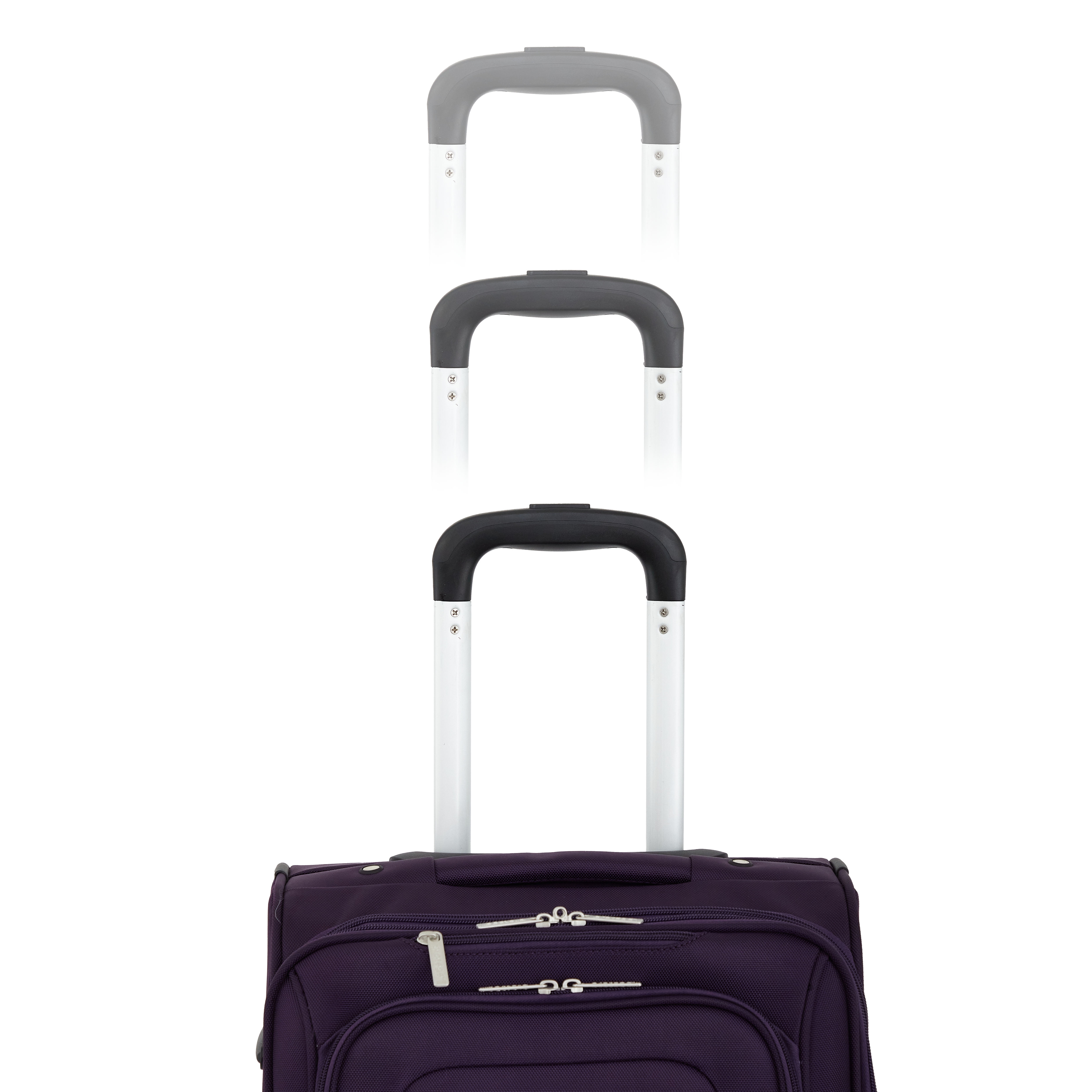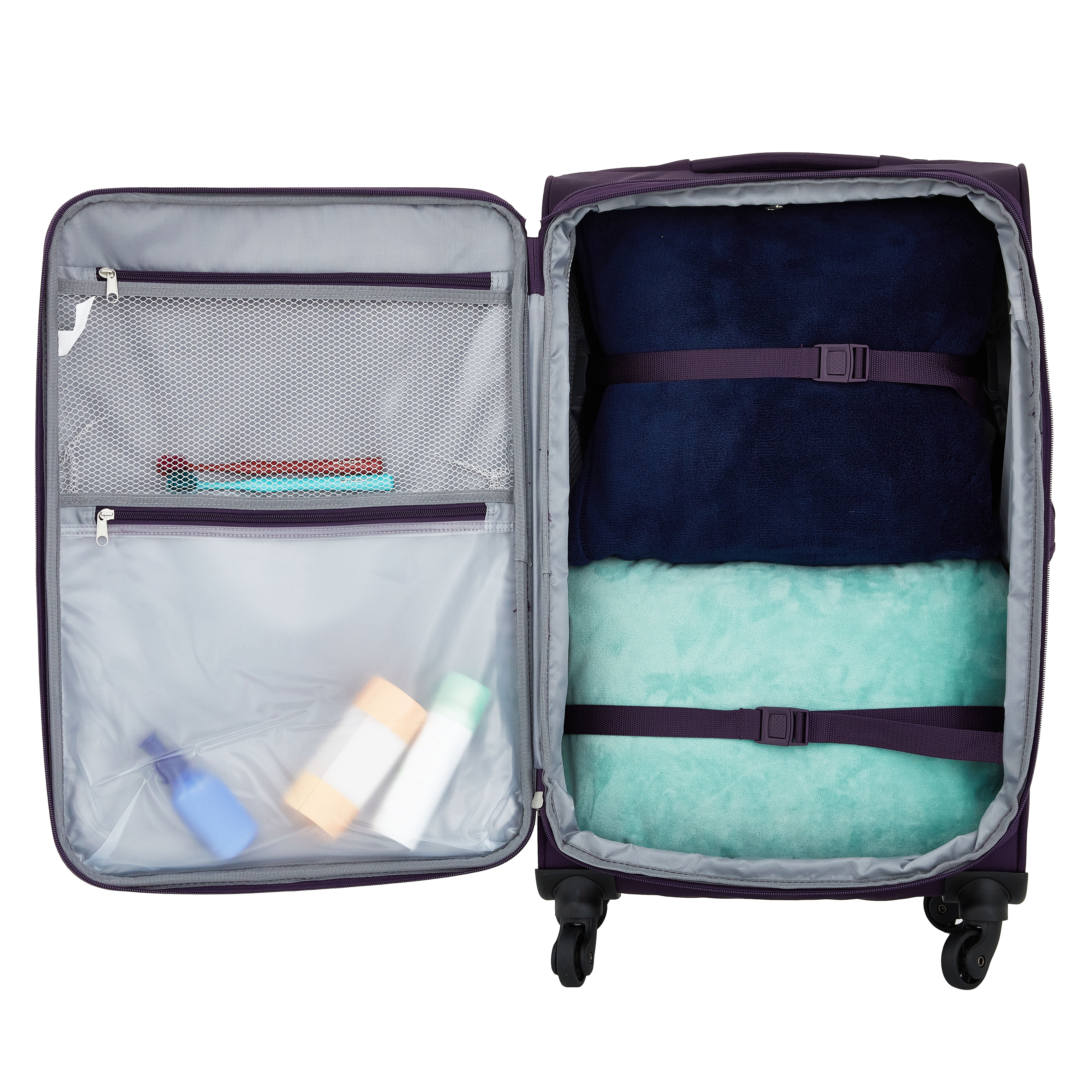 Protege Arendale 24″ Softside Expandable Rolling Spinner Luggage, Purple Material: 1680D Polyester Exterior measurements: 24″ x 15.6″ x 11.4″ Weight: 8.2 lbs Fully lined interior with wet pocket and zippered accessory pockets Locking telescopic handle and top and side carry handles for added convenience Four easy glide spinner wheels Expandable for up to 2″ packing capacity