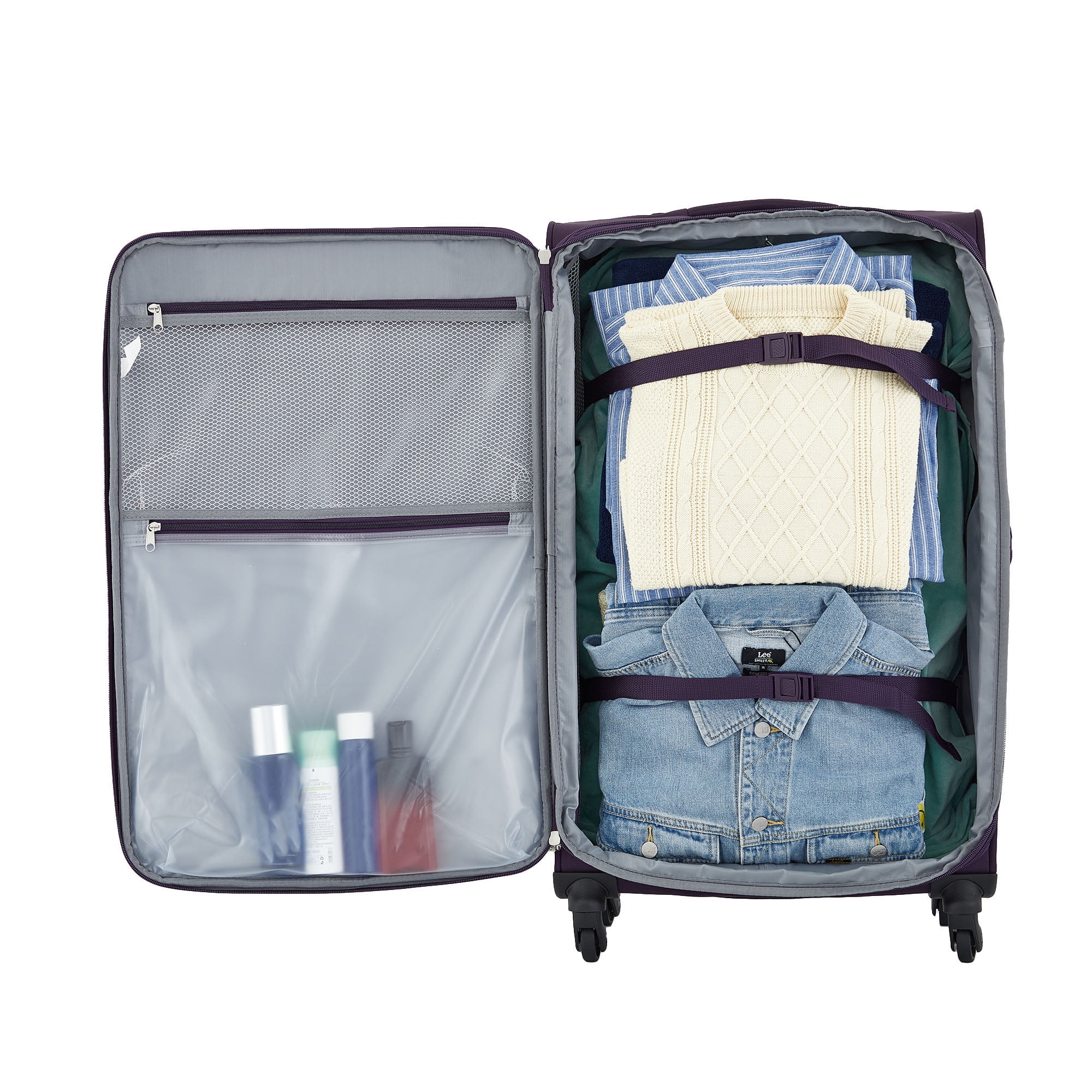Protege Arendale 32″ Softside Expandable Rolling Spinner Luggage, Purple Material: 1680D Polyester Exterior measurements: 32″ x 20″ x 14.2″ Weight: 10.7 lbs Fully lined interior with wet pocket and zippered accessory pockets Locking telescopic handle and top and side carry handles for added convenience Four easy glide spinner wheels Expandable for up to 2″ packing capacity