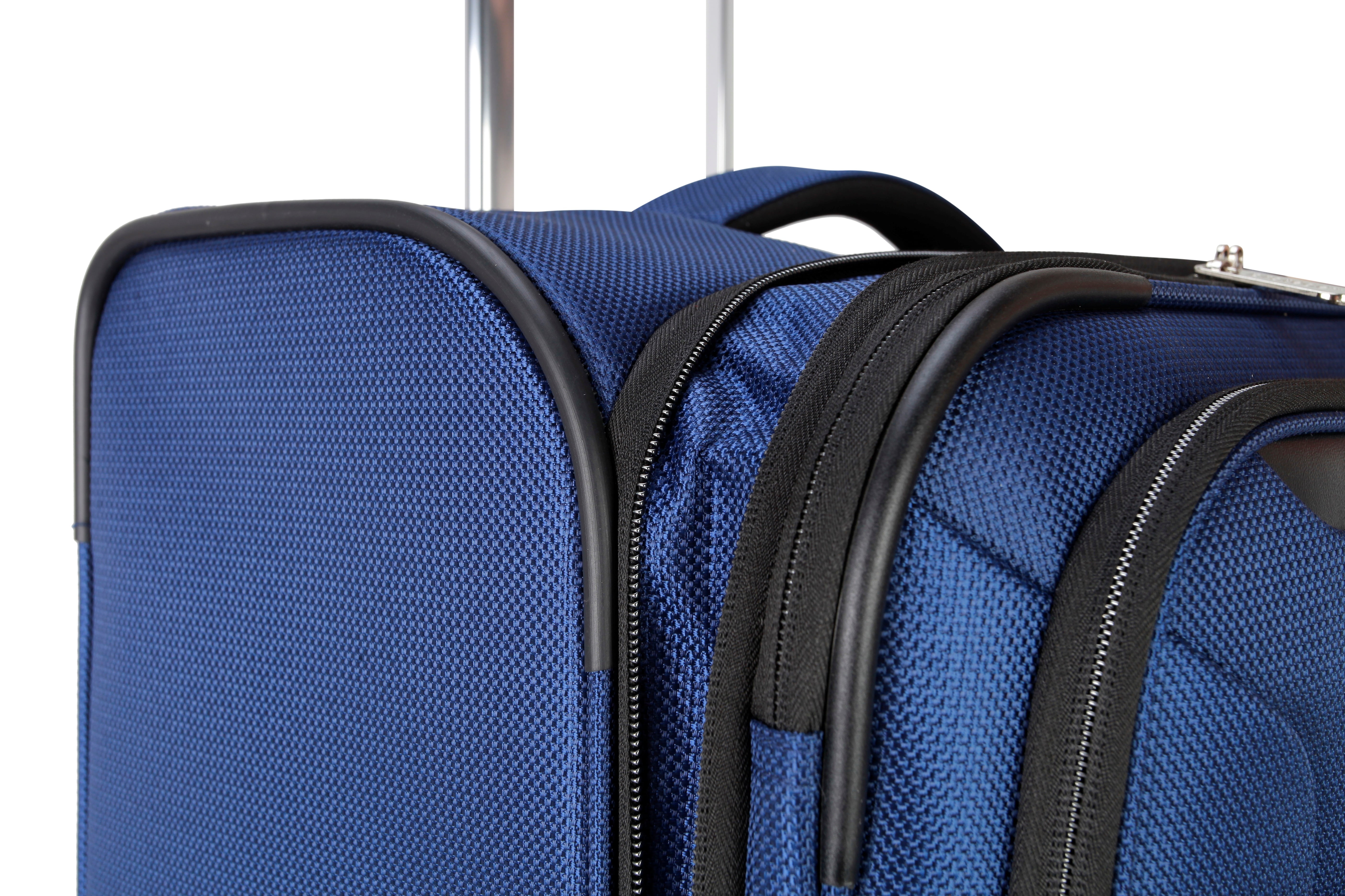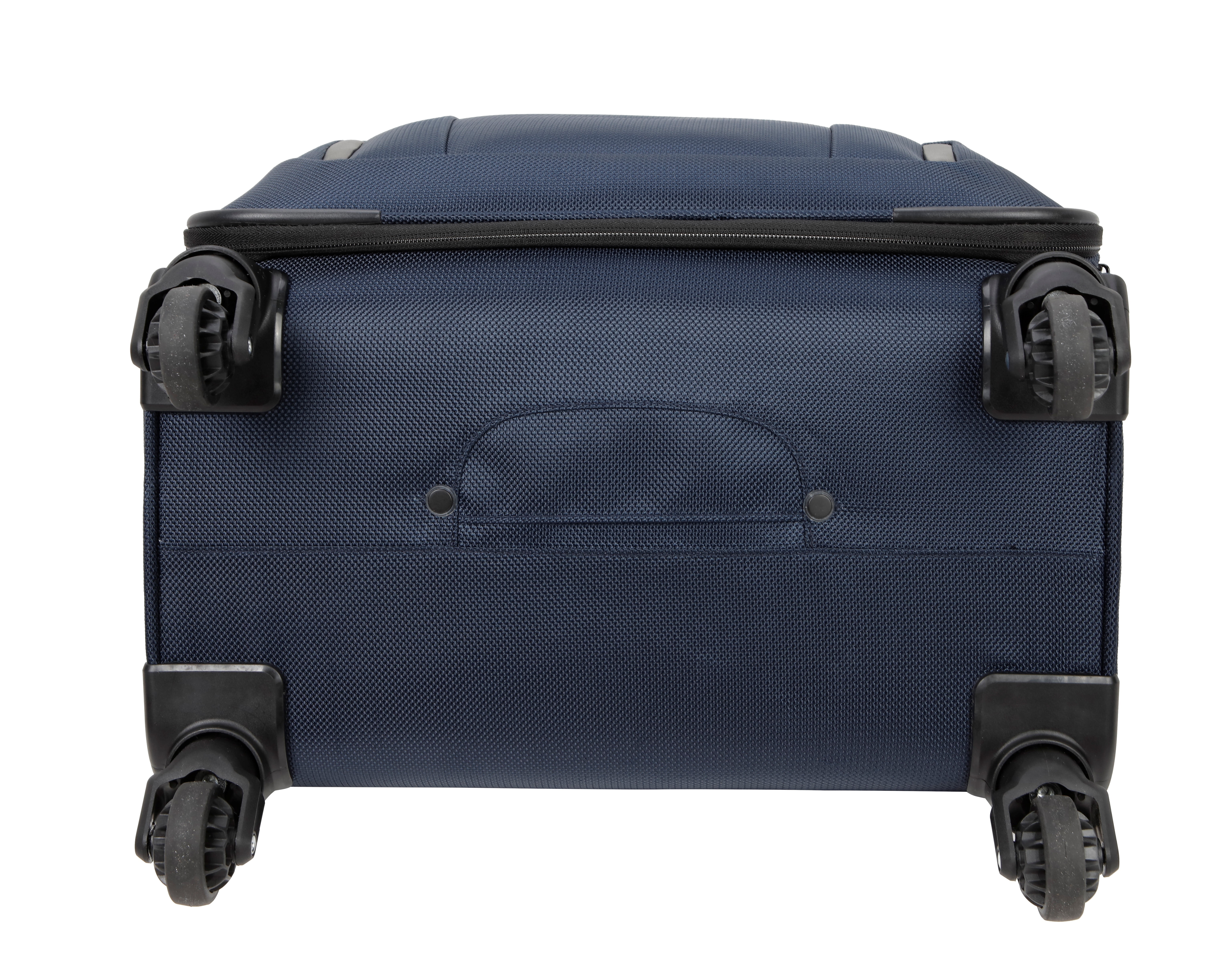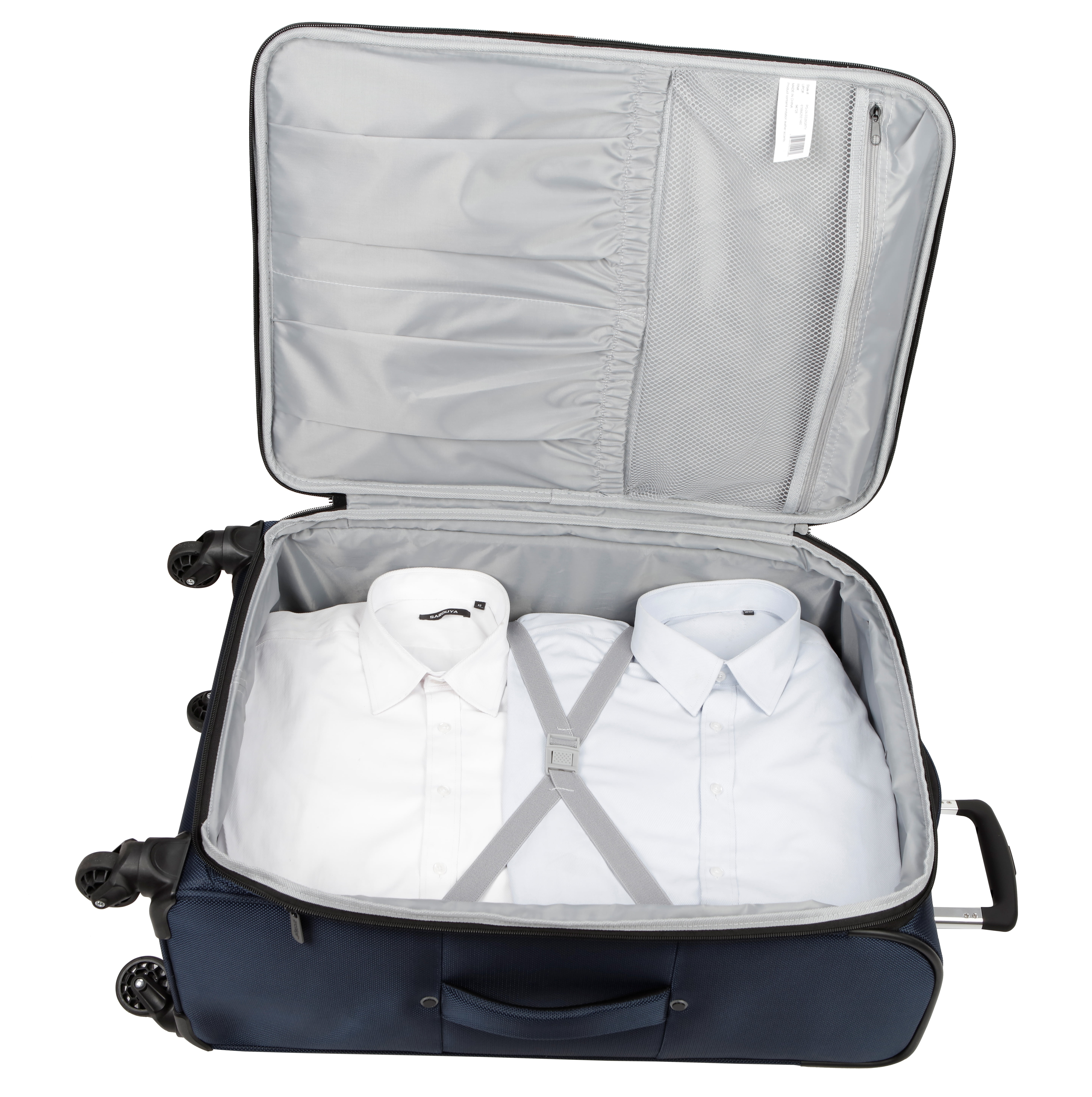 Protege Ashfield 29″ Softside Upright Luggage, Navy Blue Material: polyester Exterior dimensions (with wheels): 19.5″L x 12.5″D x 32″H Interior dimensions: 16″L x 9″D x 25″H Weight: 11.8 lbs TSA compatible zipper pulls for added security (lock not included) 2-inch zip-around expansion for added packing space 2 exterior multi-functional pockets that are great for small accessories Four 360-degree spinner wheels for ease of movement
