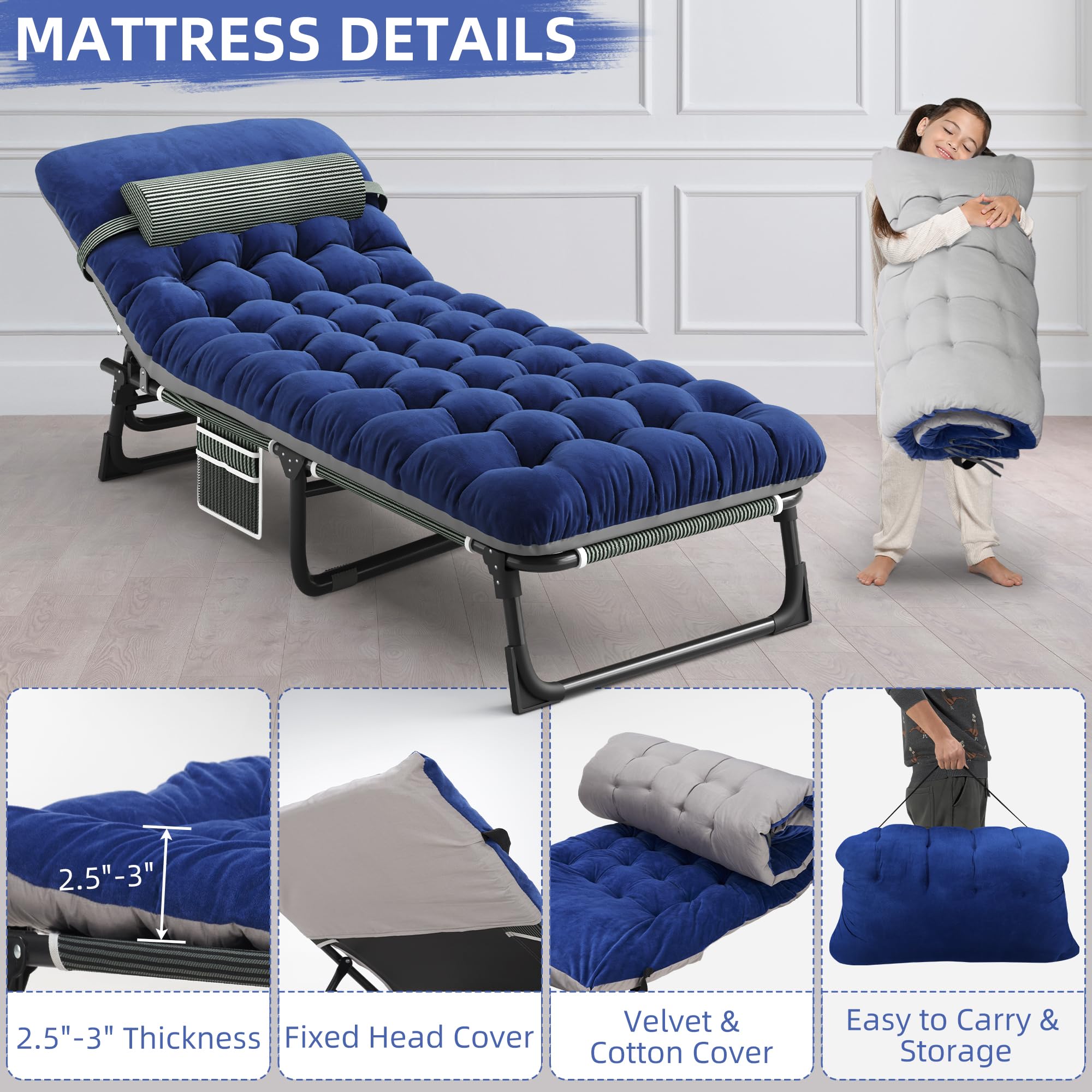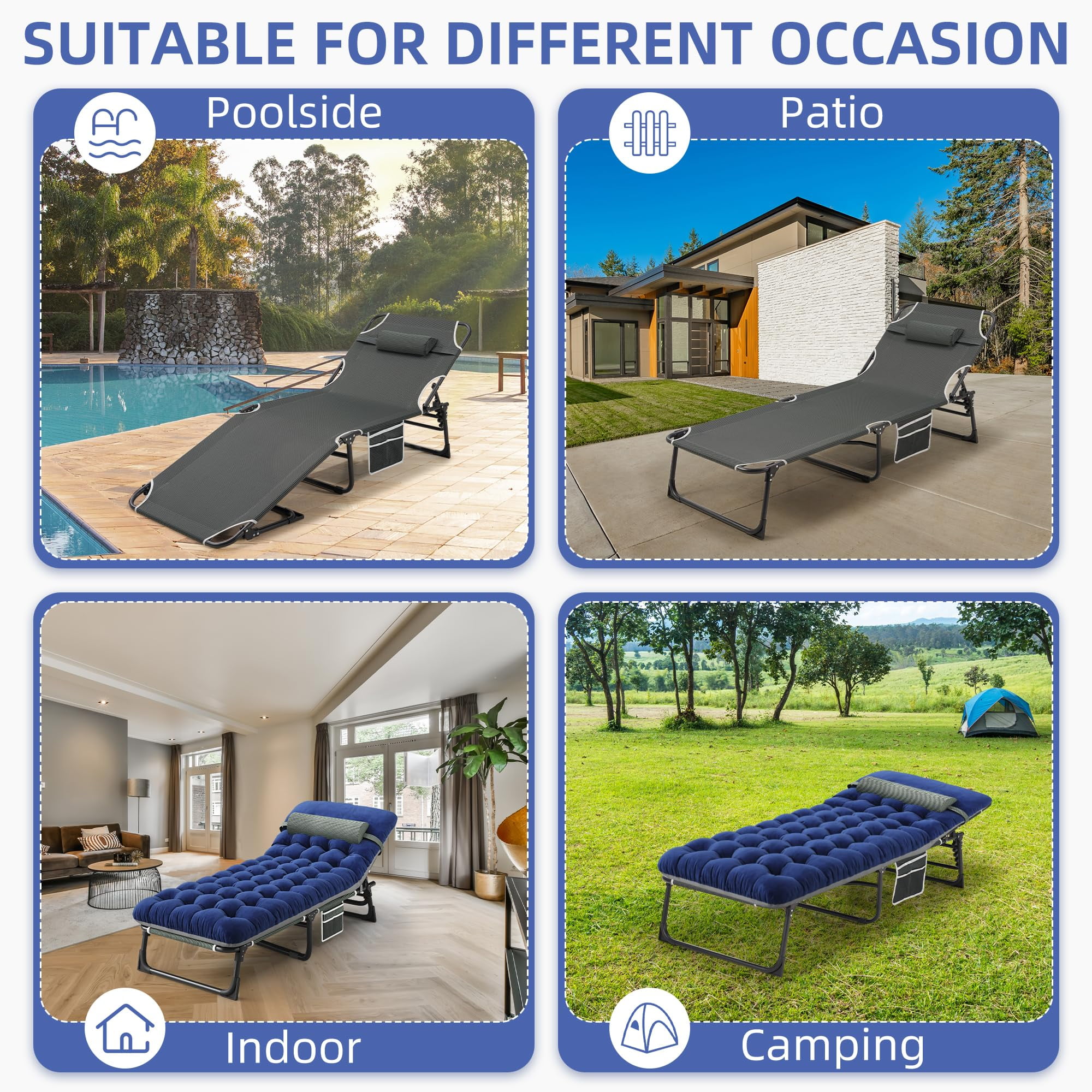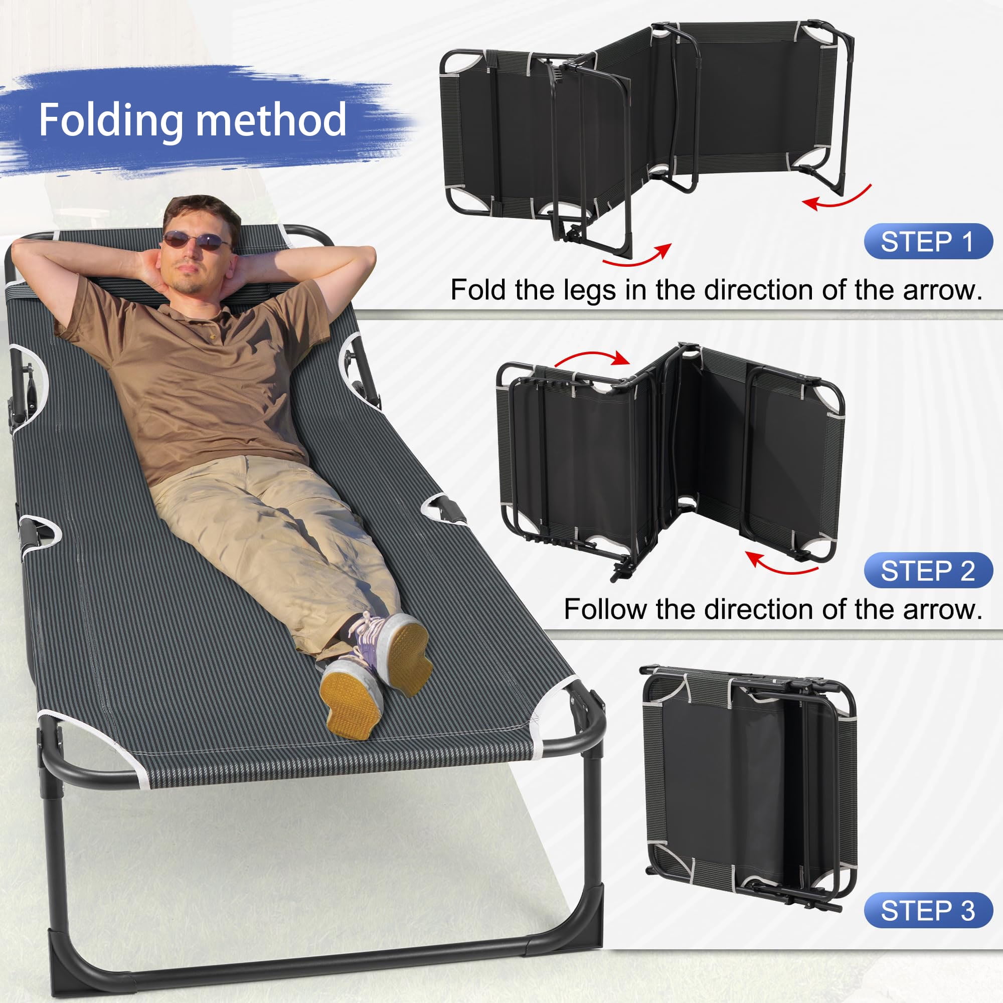WHATOOK Adjustable 5-Position Folding Lounger Unfolded size: 75.2″L x 26.8″W x 11″H. Folded size 28.3″ x 26.8″ x 7.1″, weighs only 11.4 lbs, very convenient to carry. This portable folding camping bed comes with a double-sided mattress, you can sleep more comfortably. The soft cushion adds extra comfort, making you feel more comfortable and warmer when sleeping in the fall and winter. You can also remove the cushion for ventilation when the weather is hot. Perfect for relaxing at home, by the pool, at the beach, as a comfortable sleeping place when camping, or as a perfect temporary bed when guests visit. Weight capacity up to 330 lbs. Can accommodate 1 adult or 2 children to sleep. Adjustable Folding Bed This sturdy lounge chair is designed with a 5-position adjustable locking system, allowing you to adjust it to a comfortable position as needed. You can recline or lie flat. Our Folding Adjustable Lounger with Mattress Beach Lounger is designed with non-slip feet to ensure stability. The folding camping bed also comes with side pockets and a headrest, providing comfortable support for your neck and head, helping you fall asleep quickly.