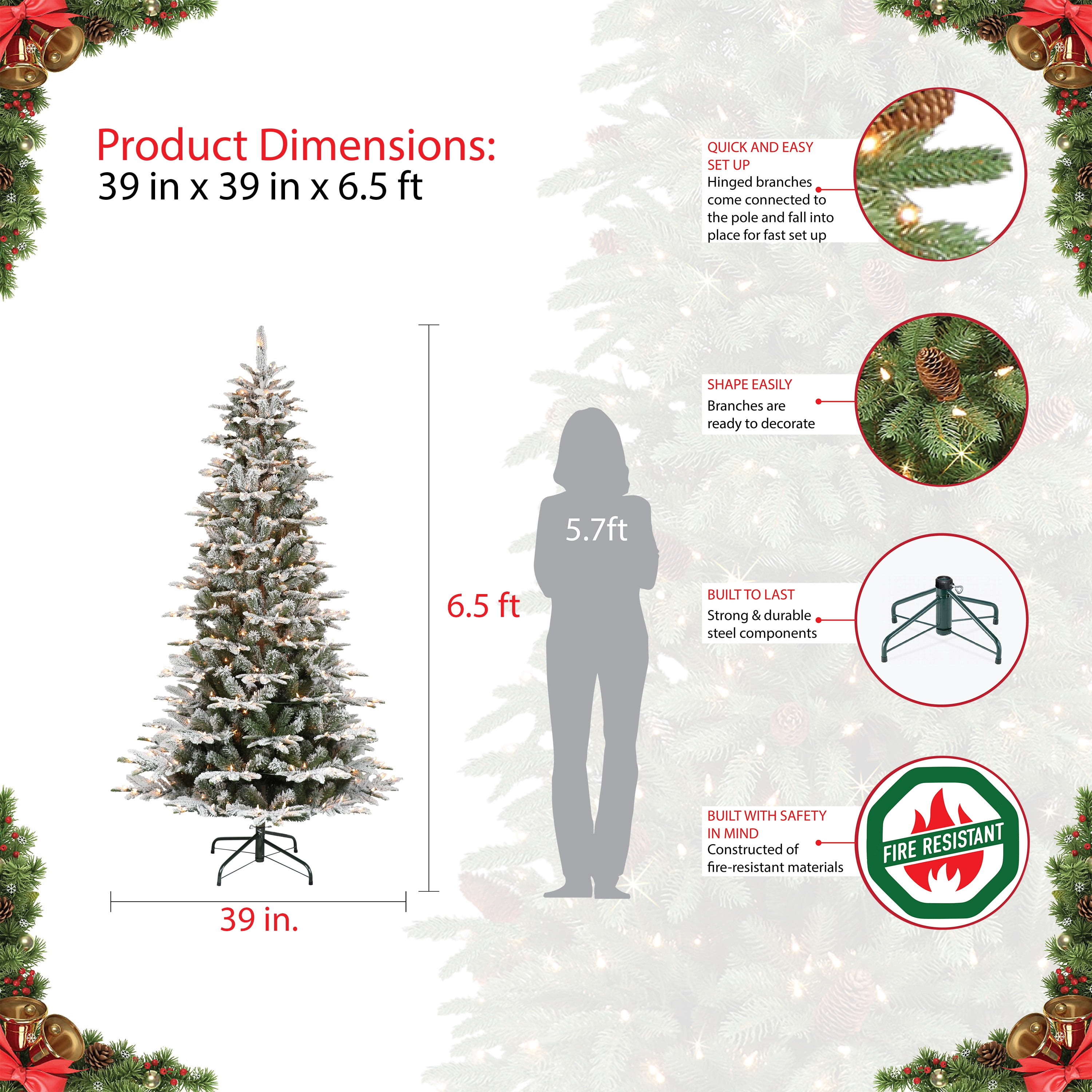 ELEGANT ARTIFICIAL CHRISTMAS TREE: Features flocked green pine needles and an elegant shape that perfectly capture the ambiance of the wintry forests in your home LIFELIKE DETAILS: Realistic pine branches bring nature’s beauty inside your home without the mess HASSLE-FREE ASSEMBLY: Comes with a sturdy metal base and sections that easily insert into one another for convenient assembly SAFER CHRISTMAS TREE ALTERNATIVE: Constructed from flame-retardant and non-allergenic materials to provide a safer alternative to real trees SIMPLE ASSEMBLY: Set up is quick and easy – simply take the tree out of the box, connect the 2 tree sections together, adjust the branches, and plug in the lights to get decorating right away FAMILY OWNED COMPANY: Christmas is all about family, and so is Puleo International. As the Oldest Name for Christmas Trees in America, Puleo is a 4th generation family-owned manufacturer and distributor of high quality, hand-crafted artificial Christmas trees and home décor. With a long and rich history dedicated to producing beautifully designed artificial Christmas trees and home decor items, the Puleo family and its dedicated team of employees continues to deliver exceptional products of the highest quality and craftsmanship. This has enabled us to serve families like yours for more than 65 years and counting. The Oldest Name for Christmas Trees in America™