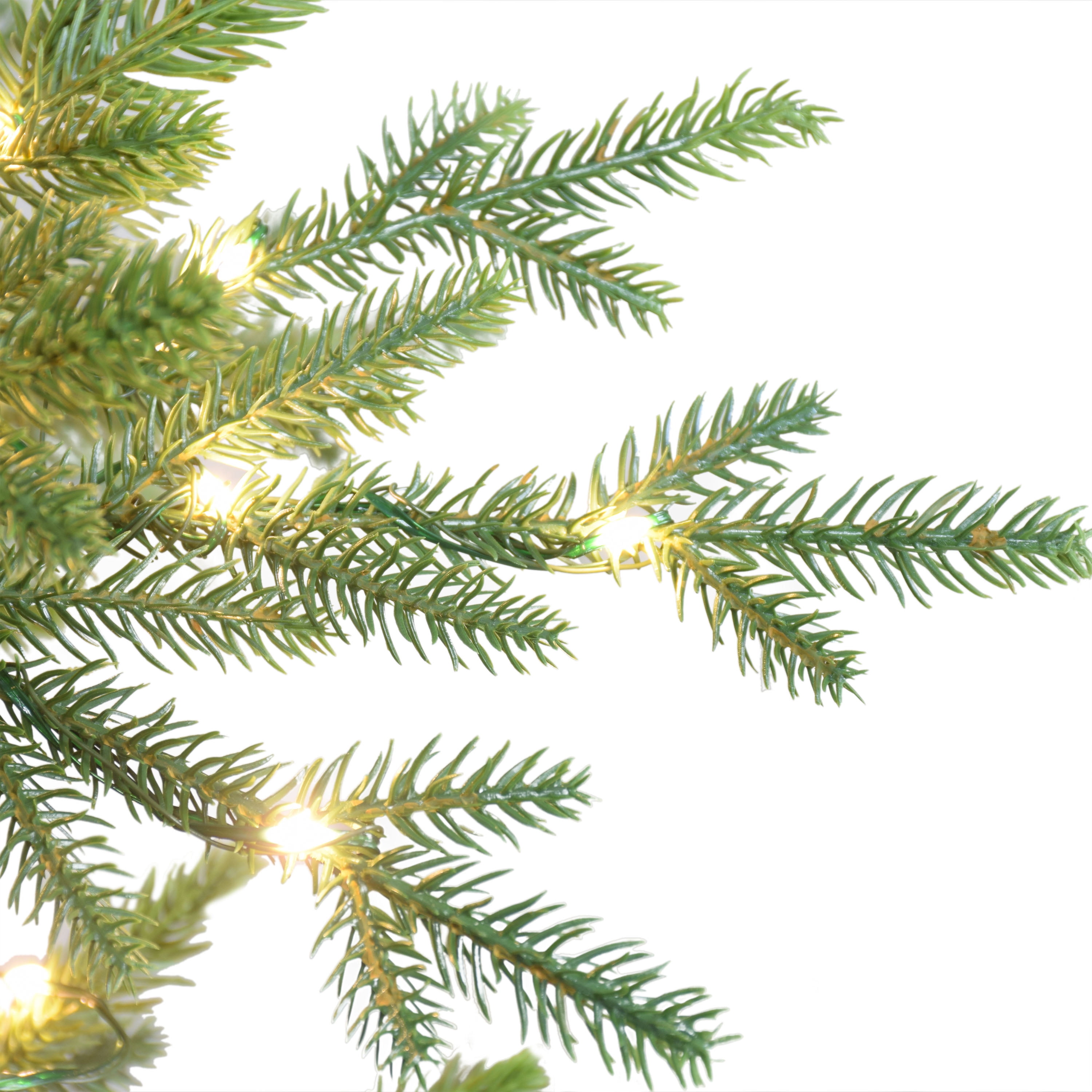 Stands 7.5 ft. with 56-in. diameter Alberta spruce shape 4132 tips 1000 lights Strand lights stay lit after one burns out Comes with metal stand Flame retardant Natural evergreen look Extra fuses and bulbs included