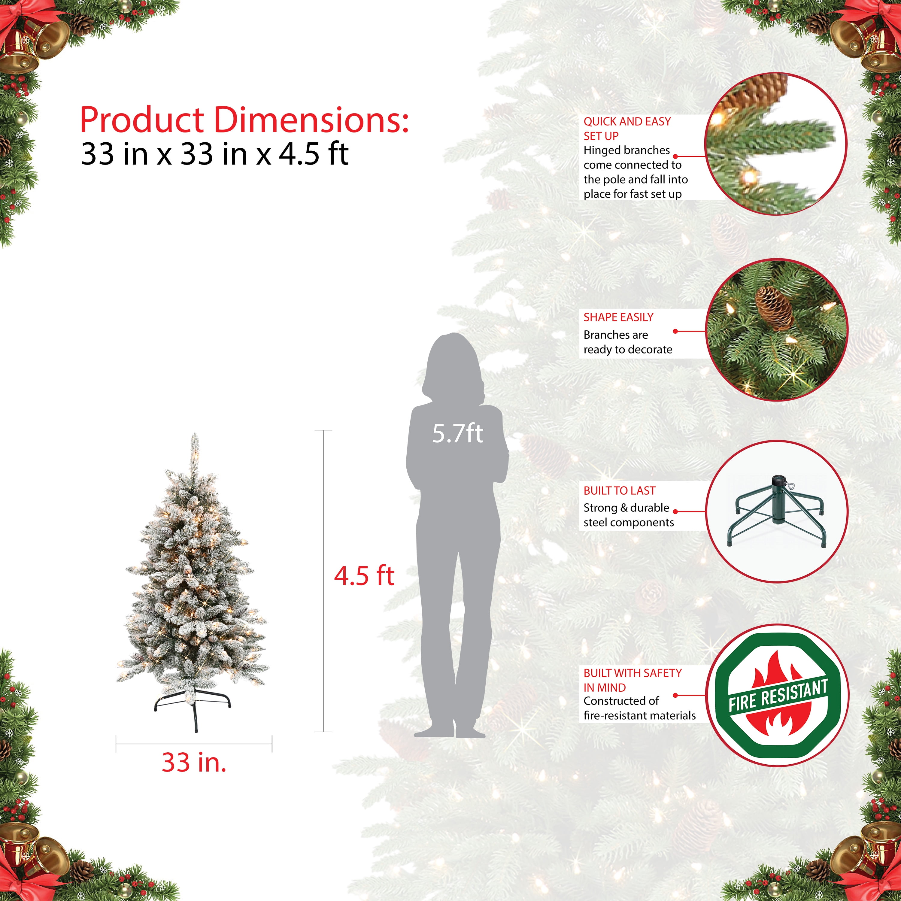 Deck the halls with the Puleo International 4.5-foot Flocked Bennington Fir Artificial Christmas Tree. Inspired by lush wintry forests, this artificial tree has 354 branch tips and 150 Incandescent Clear Lights. The incorporated lights means no more climbing ladders to string lights, saving decorating time. When a single bulb burns out, the other lights on the strand will stay lit for your convenience. Hypoallergenic and needle-shed resistant, the tree is an great alternative to a yearly real tree purchase. With easy to assemble pieces and an included base, your house will be ready for the holidays faster than you can say “Rockin’ Around the Christmas Tree”. Measures. 4.5 Foot High x 33 Inch Diameter. 7lbs