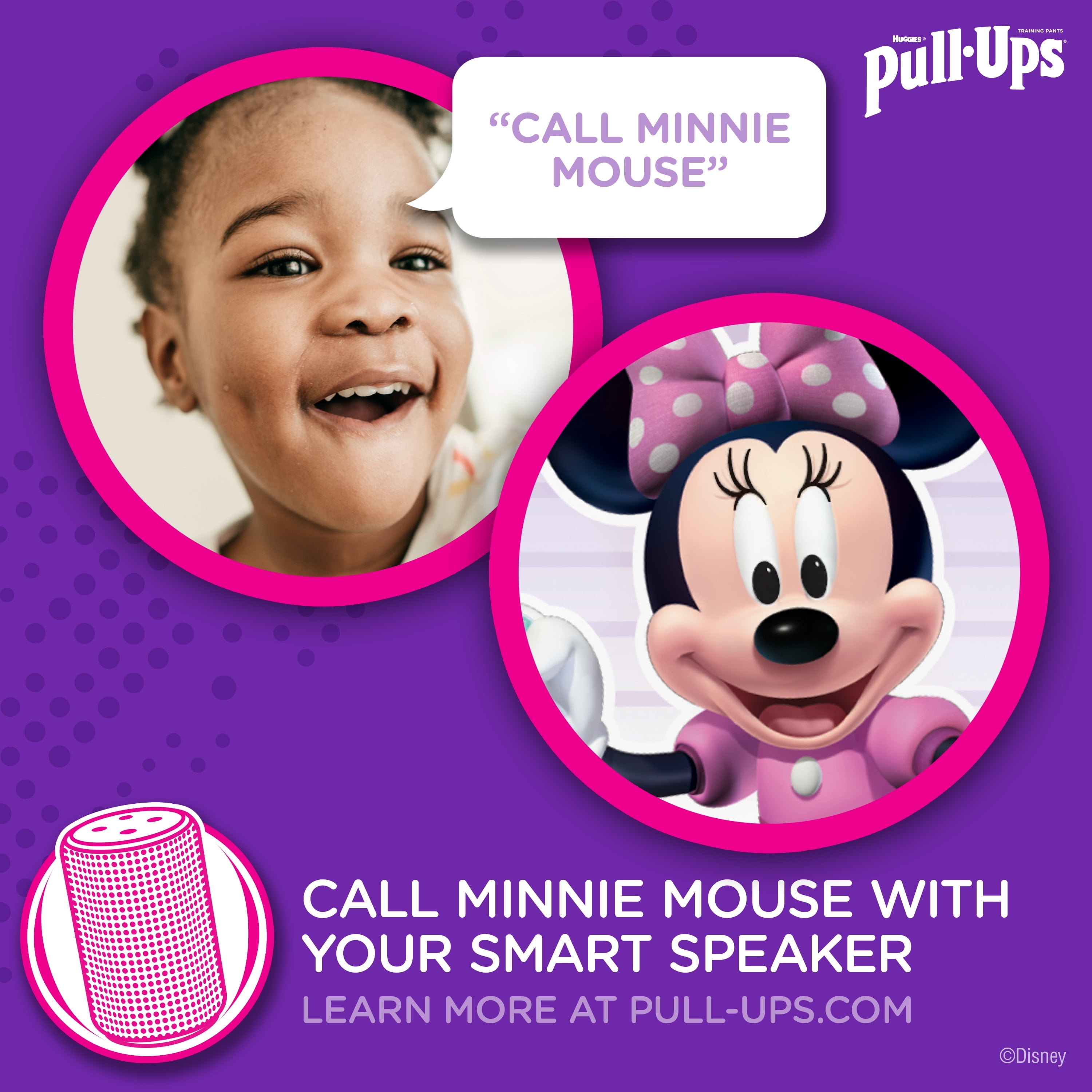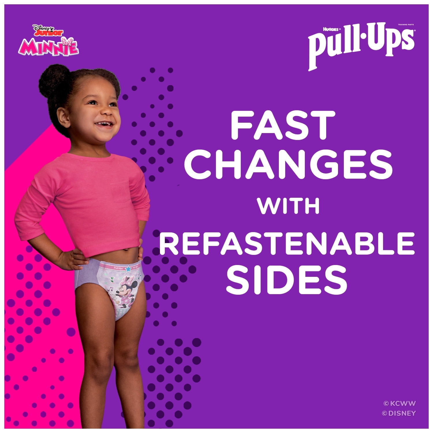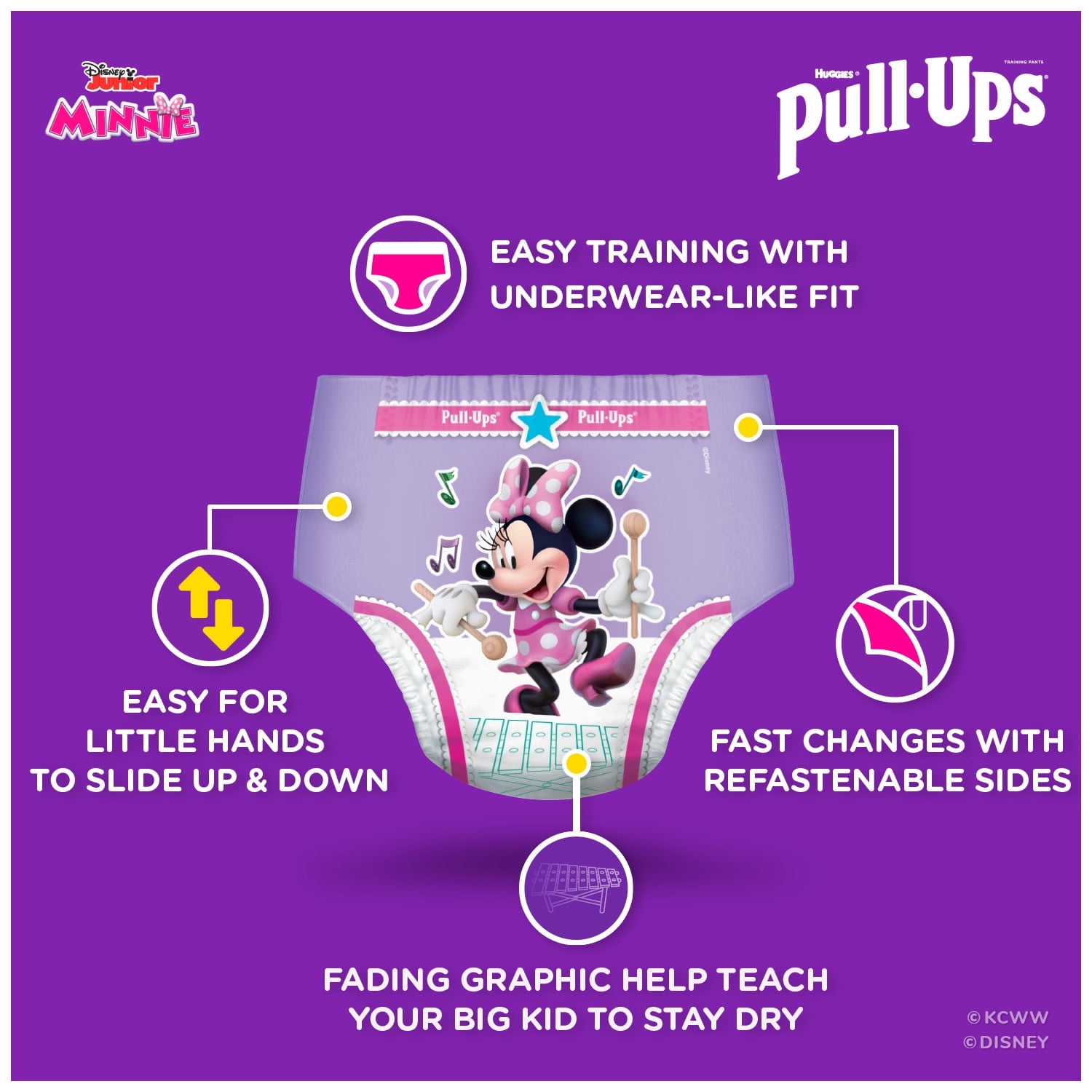 Disposable training diapers with leak protection you can trust – day or night Helps teach toddlers the concept of easy up and down in a pull-up diaper – girls’ training pants that fit like cotton underwear Exclusive Disney graphics with Minnie Mouse & Jessie and Bullseye that fade when wet Quick check & easy changes – diaper pants with easy open sides that can be refastened for an adjustable fit Available in sizes 12-24 Month (14-26lb.), 2T-3T (18-34 lb.), 3T-4T (32-40 lb.) and 4T-5T (38-50 lb.); visit Pull-Ups.com for tips, resources, games and more!