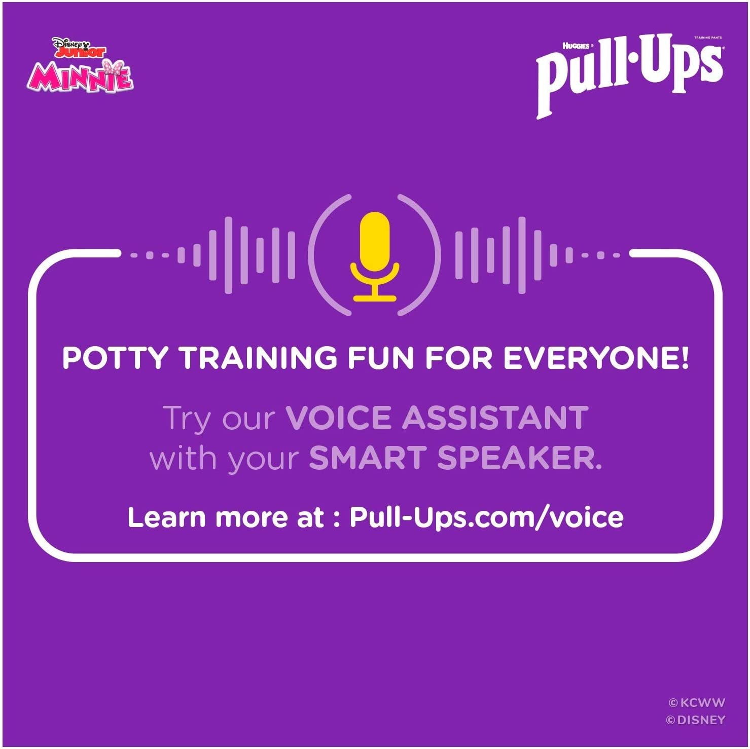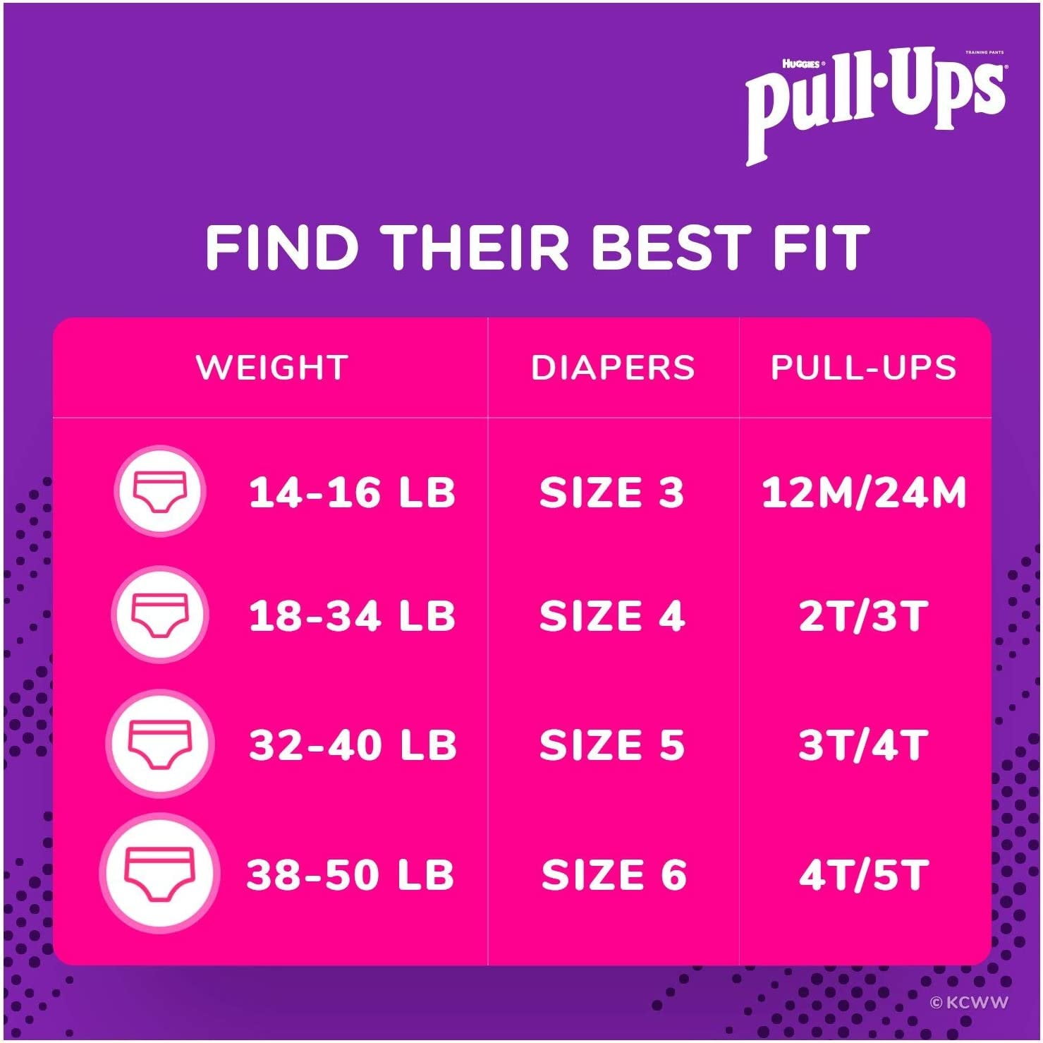 Make potty training easier* with Pull-Ups Training Pants! Pull-Ups provide outstanding protection & all-around coverage with soft, stretchy sides that fit like underwear and slide up & down to promote Big Kid independence. Refastenable, easy-open sides allow you to keep socks, shoes and pants on your toddler for quick changes on-the-go or at home. Pull-Ups disposable training underwear also feature adjustable sides to customize your child’s waistband and easily check for messes, plus added absorbency where she needs it most. Each pack includes front & back designs of Disney’s Minnie Mouse, with graphics that fade when wet to help her learn. When your child is ready to begin her potty training journey, the Pull-Ups brand can help. Visit pull-ups.com for expert articles, tips and potty training resources. We’ve helped train 60 million Big Kids and counting!** Pull-Ups Girls’ Training Pants are available in sizes 12-24M (14-26 lb.), 2T-3T (18-34 lb.), 3T-4T (32-40 lb.) and 4T-5T (38-50 lb.). Now available in One Month Supply Packs, making it easy to buy in bulk and save. (*vs. training in diapers **US & Canada)