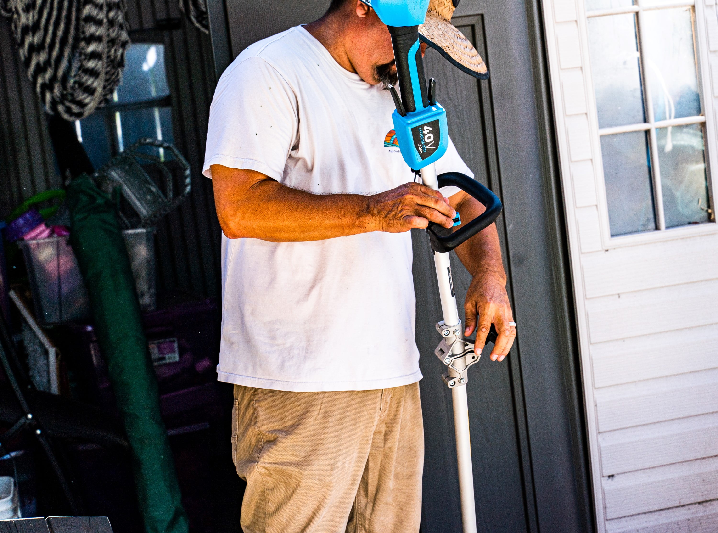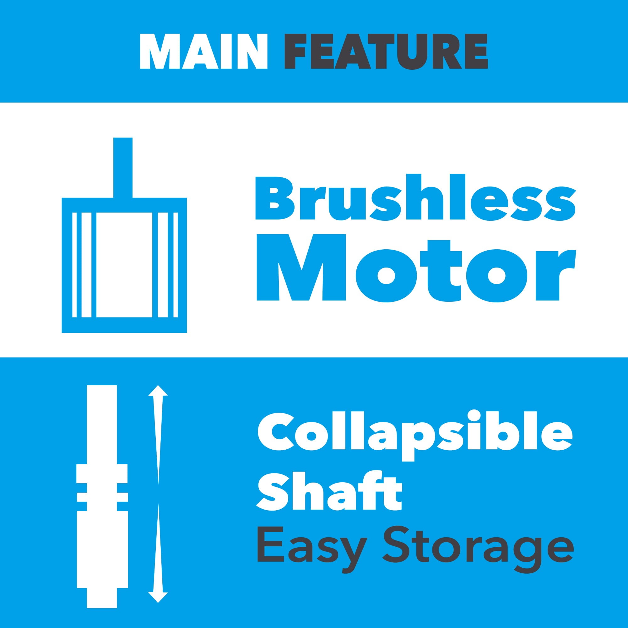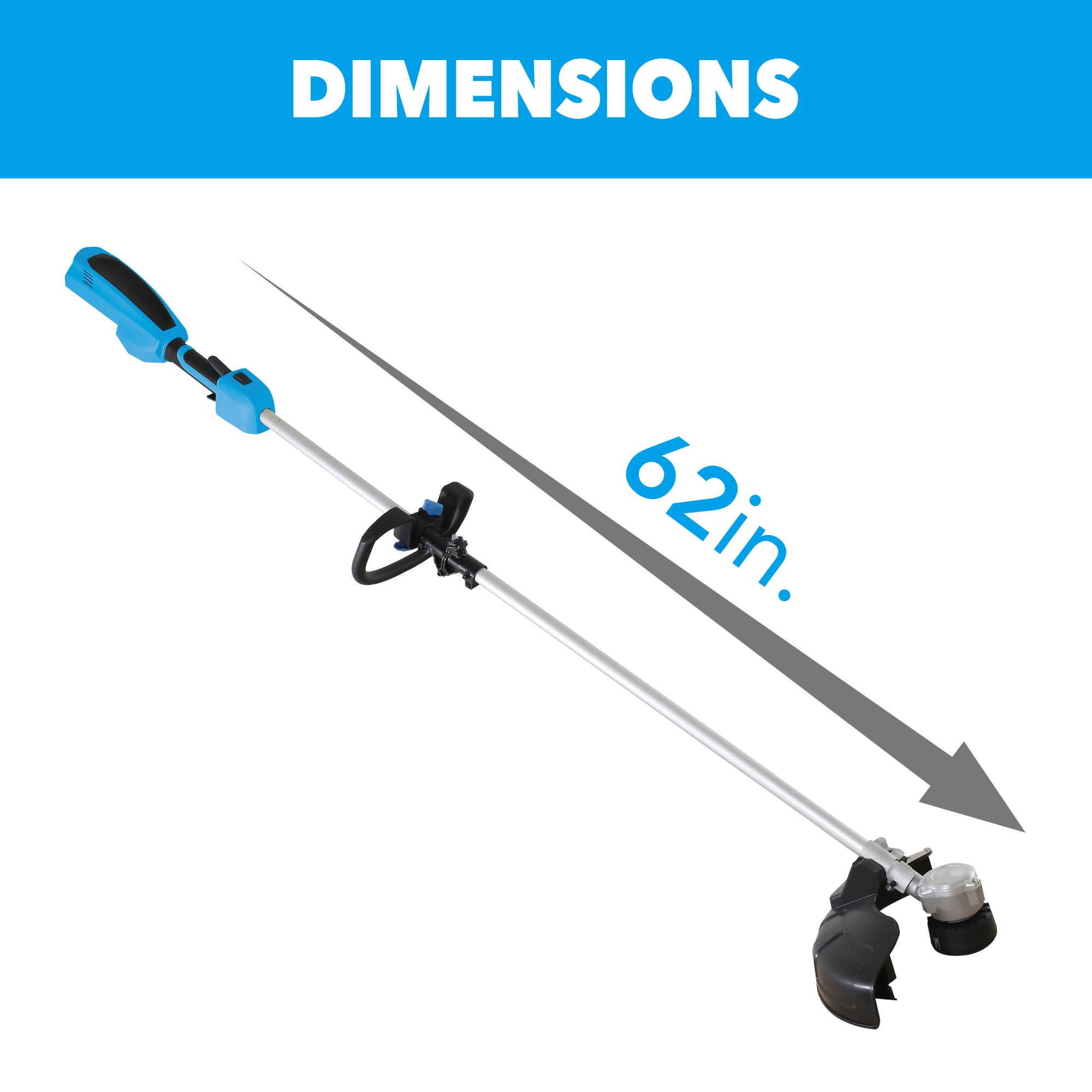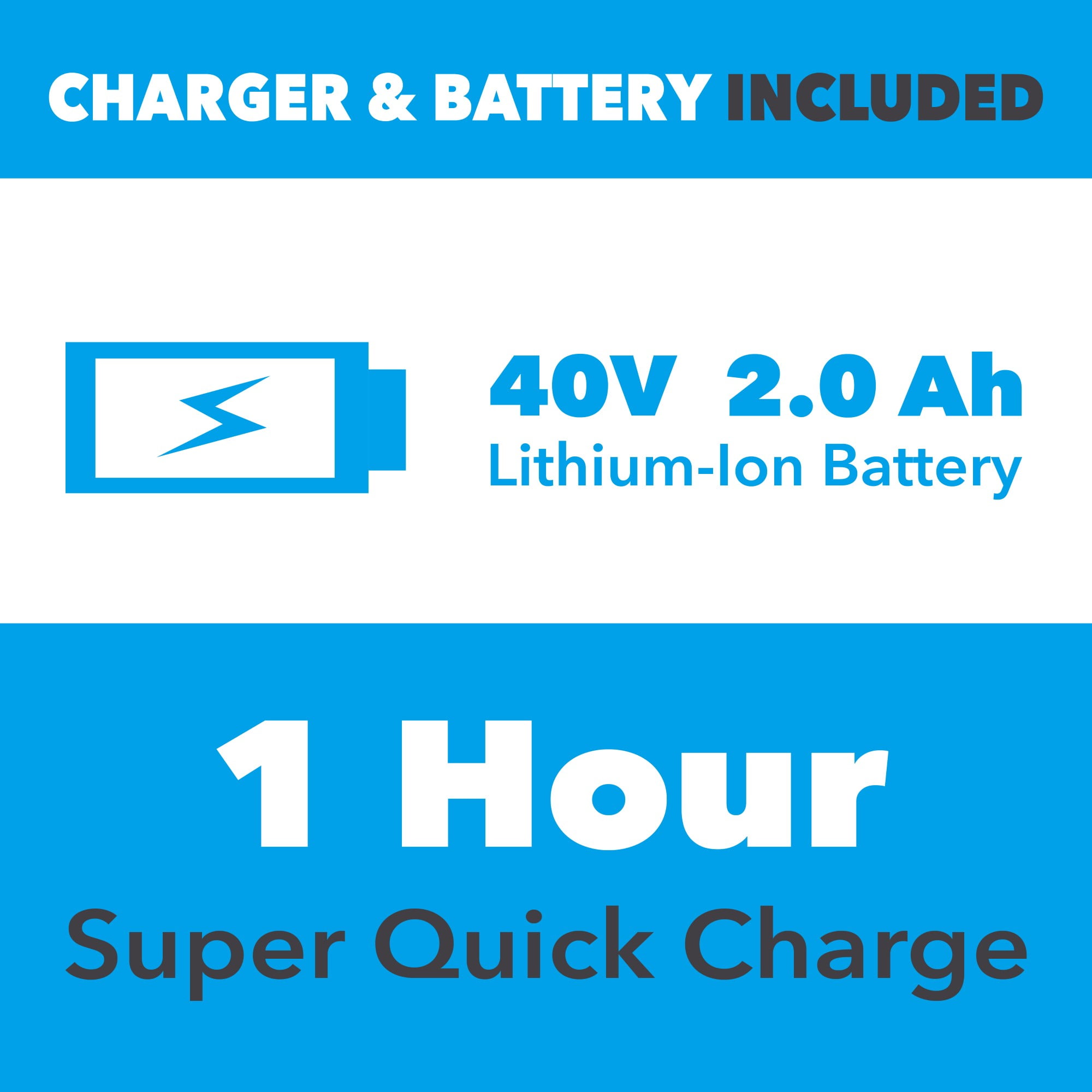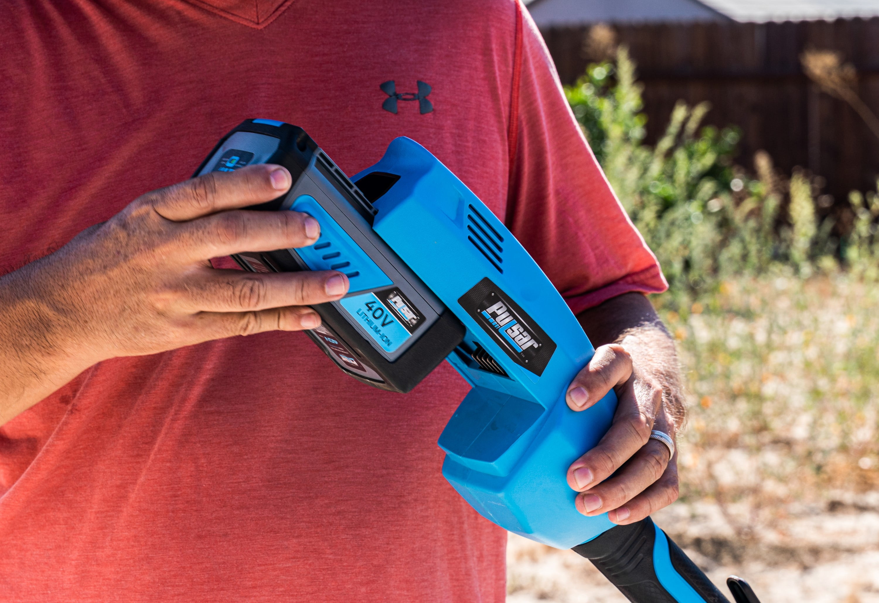 Electric trimmer with 13 inch cutting swath Pulsar 40-volt 2.0 Ah lithium-ion battery & Charger One hour quick charge Brushless Motor with 7200 RPM Telescopic aluminum shaft with safety shield 1 Battery and charger included