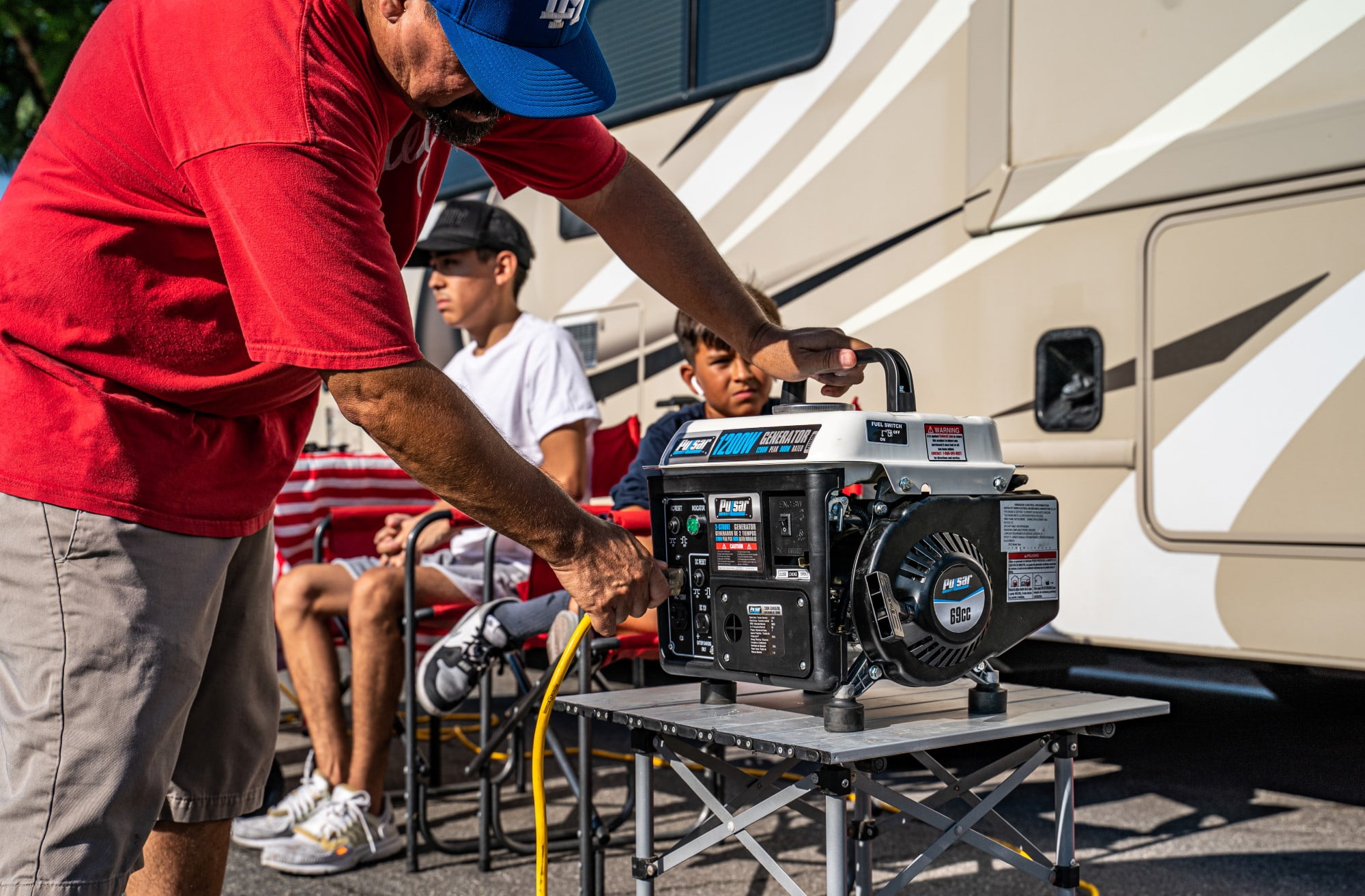 Introducing the Pulsar PG1202SA 1200-watt portable generator, designed for small-scale DIY projects, hunting, and camping applications where portable power is necessary. With its lightweight and compact design, this generator can easily be transported in a truck bed or trunk of a vehicle, making it a convenient option for tailgating events or camping trips. Featuring a recoil start, this generator comes equipped with two 120V outlets and one 12V DC outlet, providing ultimate convenience and portability. The PG1202SA generator boasts 1200 peak watts and 900 running watts, with a peak amperage of 8.3A. Equipped with a 69cc, 2HP 2-stroke engine, this generator utilizes a gasoline to oil ratio of 30:1 for efficient and reliable performance. With a 1-gallon fuel tank, this generator can run for up to 5 hours at 50% load. The Pulsar PG1202SA’s compact 35lbs design with carrying handle allows for easy transportation, while the included trickle charge DC cable provides the added convenience of 12V battery charging. Backed by a one-year warranty, this generator is the perfect solution for light duty on-the-go power.