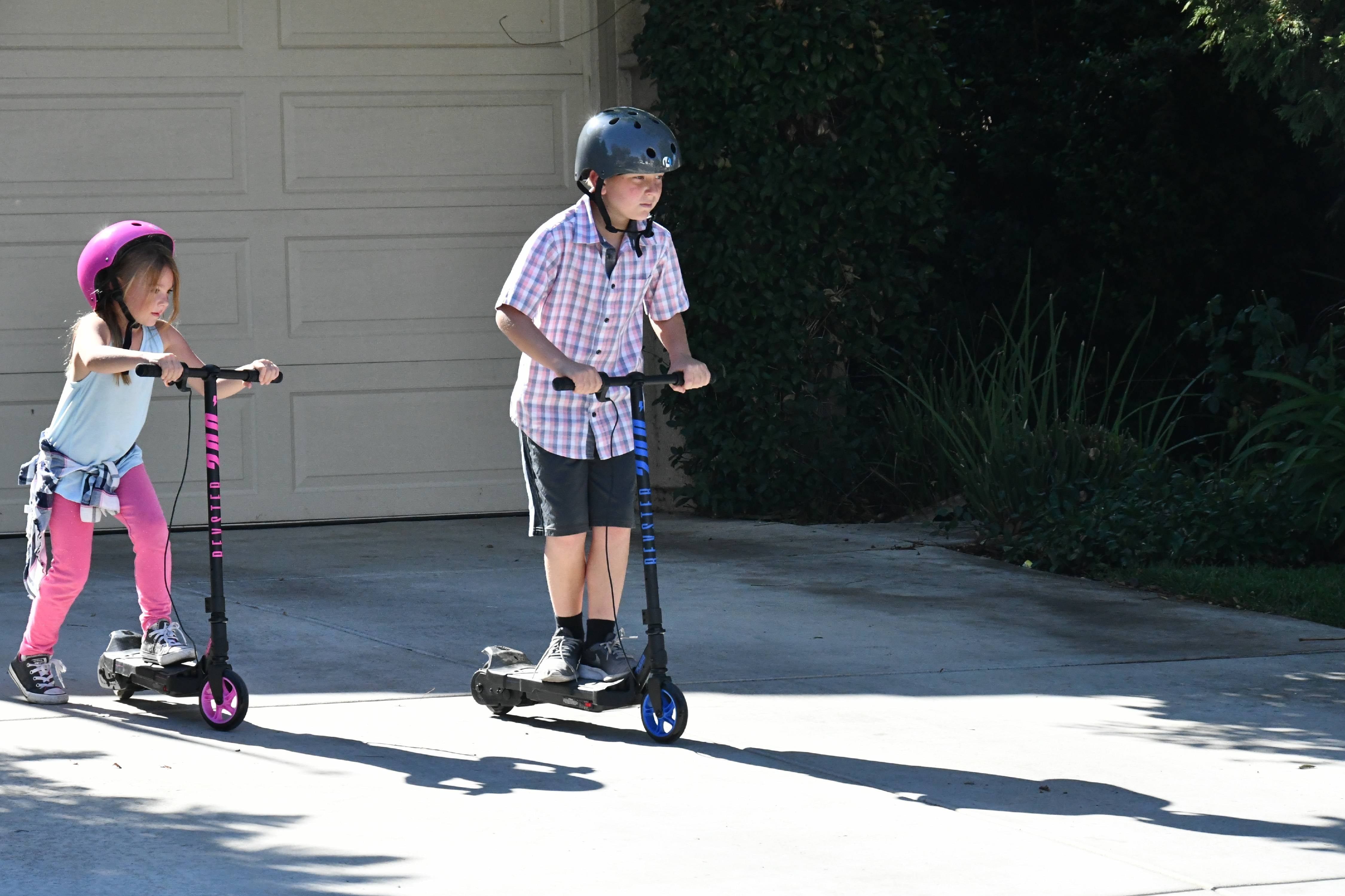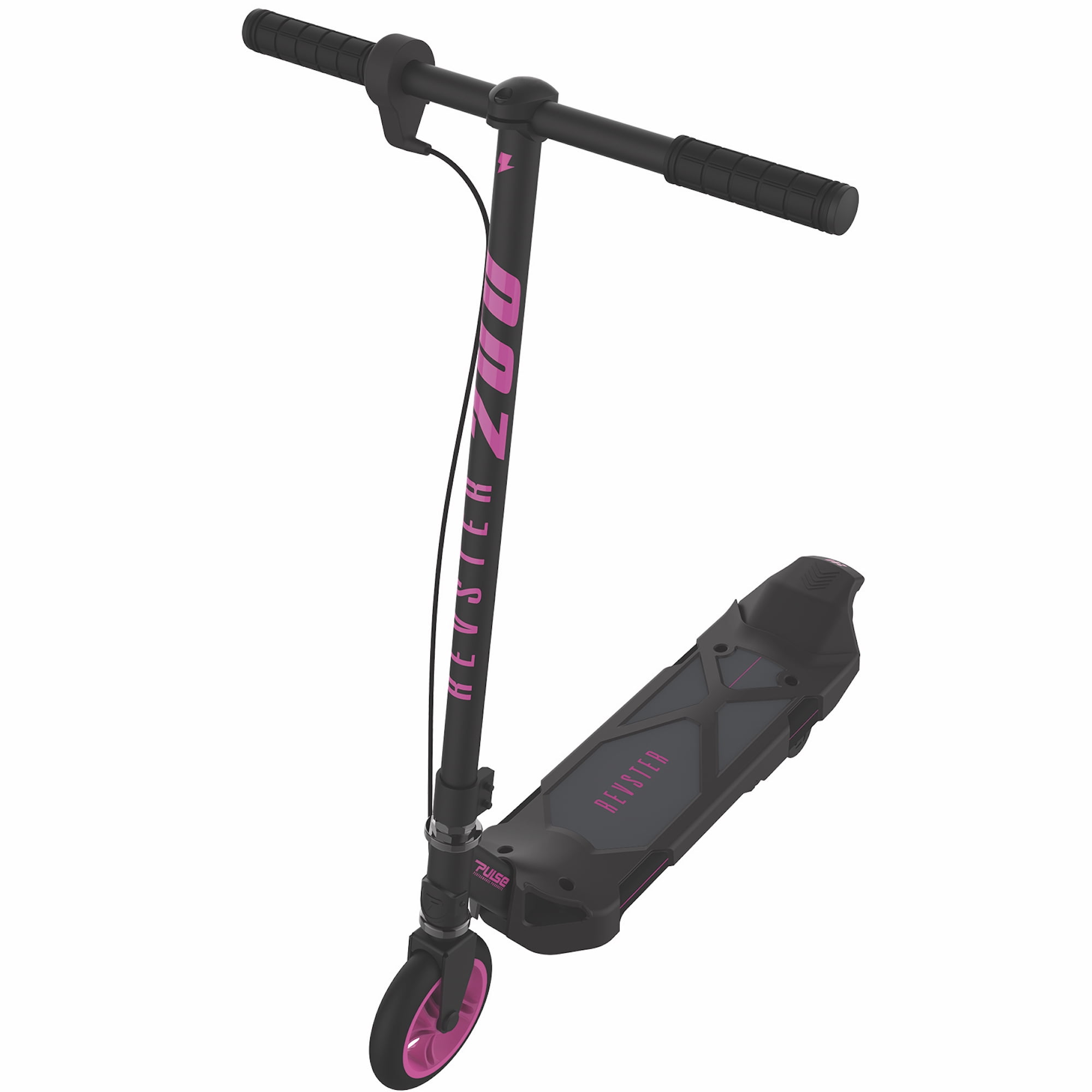 Pulse Performance Products Revster 200 Electric Scooter: Innovative 2-IN-1 Electric Free-Drive system provides an easy gliding KICK scooter and performance ELECTRIC scooter in one 12 Volt battery provides up to 70 minutes* of continuous ride time Speeds up to 8 mph Push- to- Start activated throttle for quick acceleration Rear foot brake with throttle cut-off makes it easy to stop Single piece composite deck with extra sticky grip tape for ultimate control and stability Maintenance Free 130mm cast polyurethane wheels with ABEC-7 bearings keep the ride smooth Heavy-duty steel constructed stem, rise bars, and internal frame for durability Includes a kick stand for easy storage in the garage Age Range: 8 years and up Designed for kids up to 120 lbs