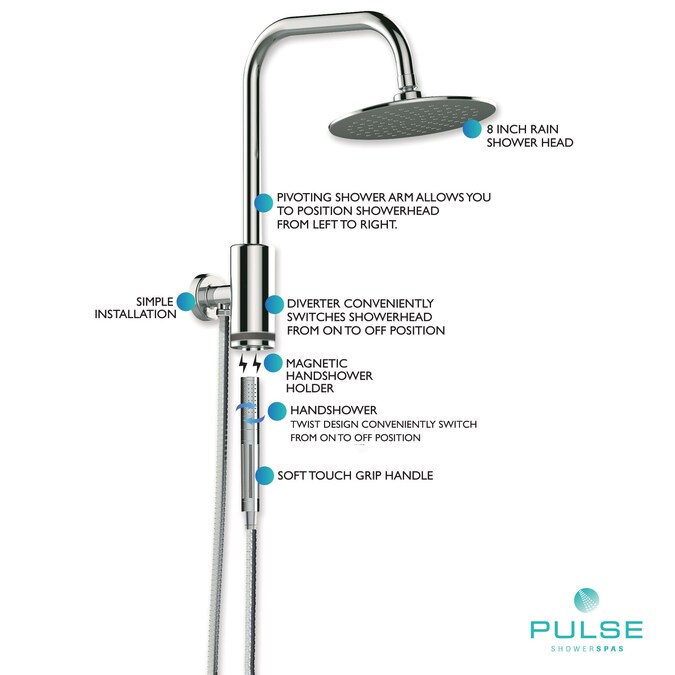 The Aquarius Shower System from PULSE ShowerSpas replaces your existing showerhead with an oversized rain showerhead and multi-function handshower. The integrated dual-function diverter allows you to use each function independently. Typical install is less than 1 hour—even for the do it yourselfer. It simply connects to the water supply at your existing showerhead location and uses your existing hot/cold shower valve.