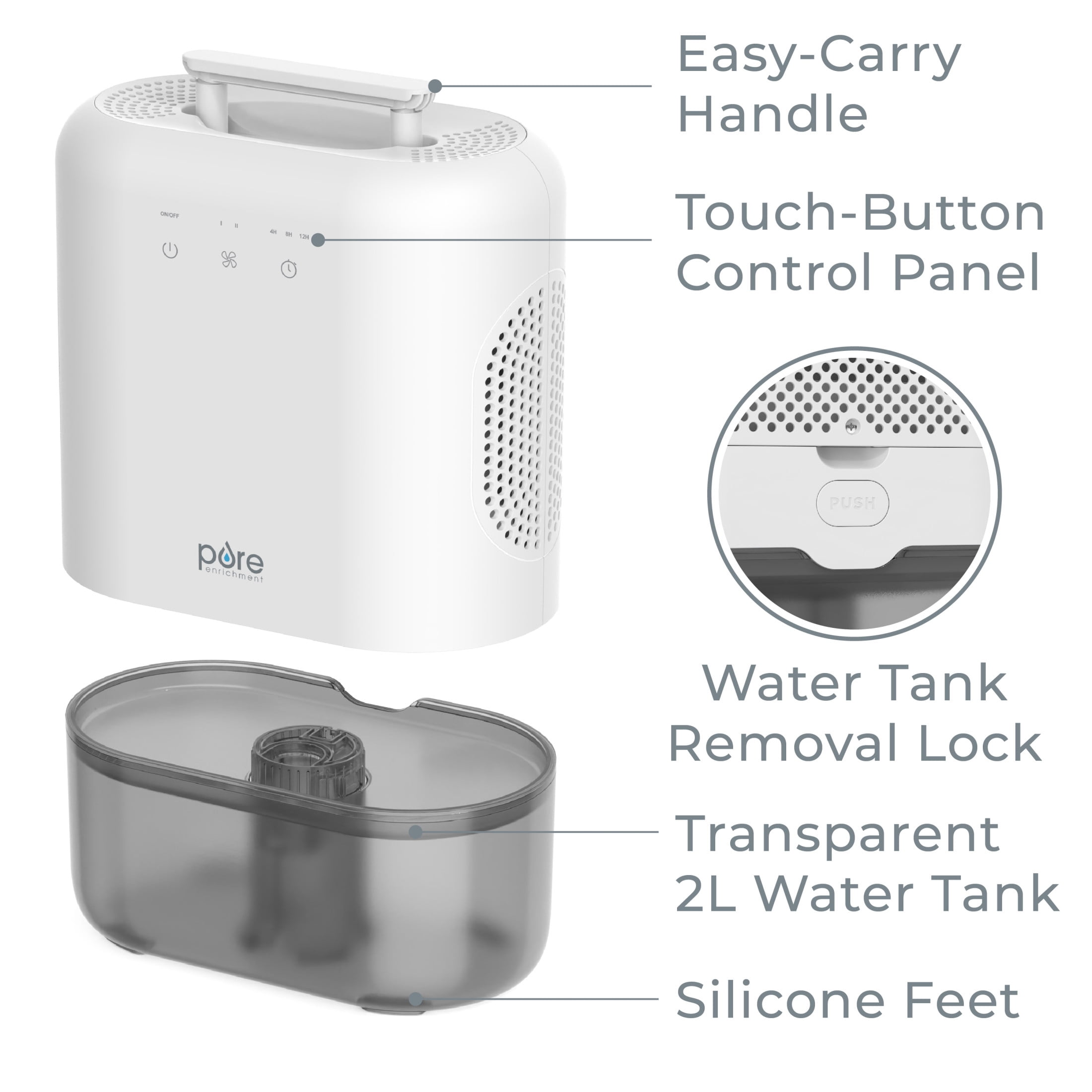 2L WATER TANK: Extra-large, removable transparent water tank helps make keeping track of water level easy while offering around-the-clock, multi-day protection from unwanted moisture in small spaces to mid-sized rooms TOUCH-BUTTON CONTROL PANEL: Choose from 3 easy-to-program timer settings and 2 different speed levels to dial in your ideal moisture relief. ROOM-TO-ROOM PORTABILITY: With its retractable handle you can easily move the dehumidifier to and from humid areas as needed. Ideal for closets, home offices, RVs, campers, crawl spaces, storage units, and larger areas such as bedrooms, bathrooms, laundry rooms, and living rooms up to 300 sq ft. AUTOMATIC SHUT-OFF: An intelligent auto shut-off with a red indicator LED will notify you when the tank is full and the unit has stopped to prevent overfilling or spilling. WHAT YOU GET: Extra-large 2L Dehumidifier, AC power adapter, user manual, and Pure Enrichment’s guaranteed 5-Year Warranty