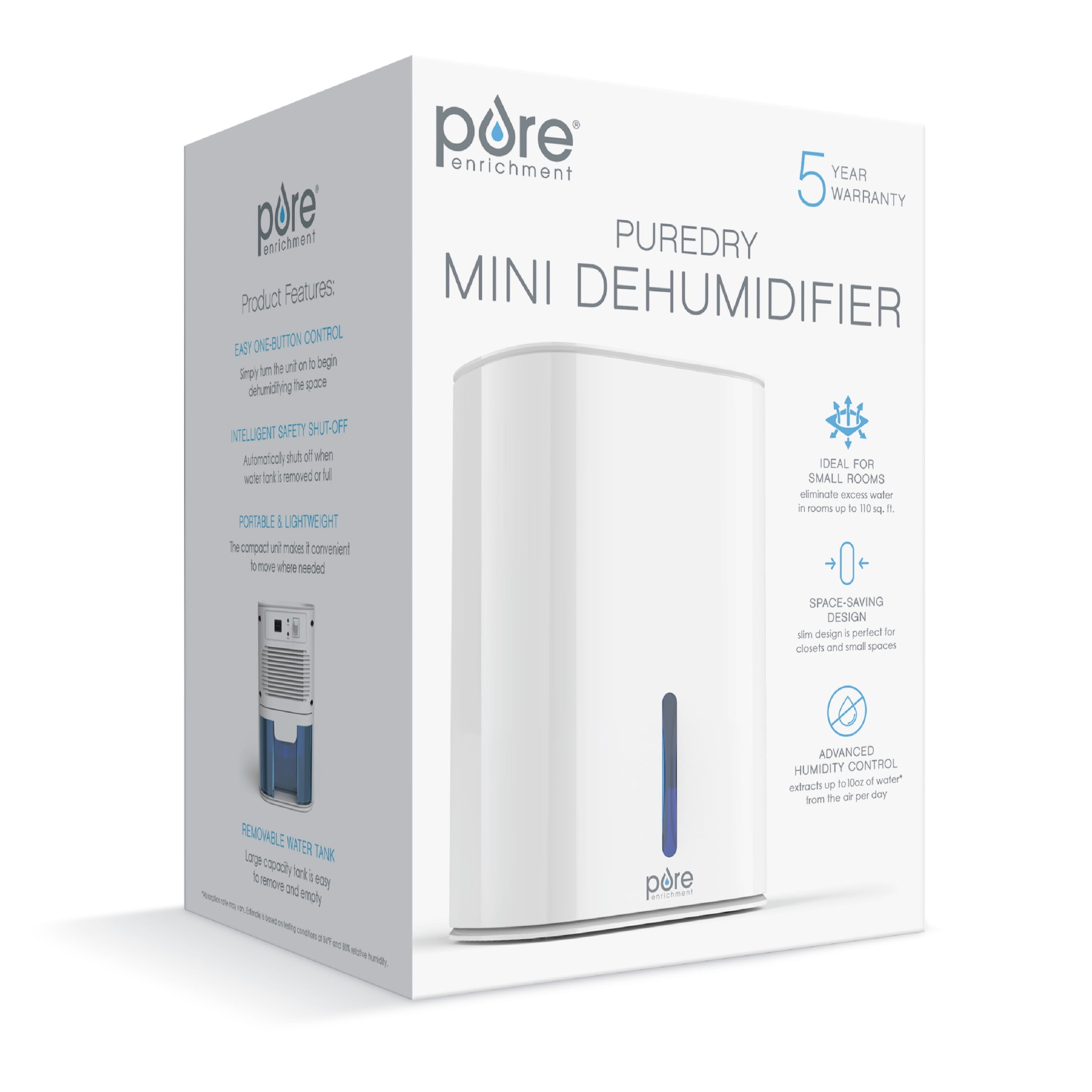TRANSPARENT REMOVABLE WATER TANK: Easily keep track of the water level as the unit extracts moisture from the air, reducing mildew and other moisture-loving allergens. EASY CONVENIENT OPERATION: Our portable and complacent product makes dehumidification simple, with a single switch that turns the unit on and off. INTELLIGENT AUTO SHUT-OFF: This unique dehumidifier automatically turns off when the water tank is full for safety and to prevent overflowing. WHISPER-QUIET OPERATION: PureDry™ Mini operates quietly in the background making it perfect for small spaces like a bathroom, closet, nursery or office. WHAT YOU GET: Dehumidifier, AC power adapter, user manual, and Pure Enrichment’s guaranteed 5-Year Warranty. Our customer support team provides daily quality service and peace of mind to millions worldwide all from a brand you can trust.
