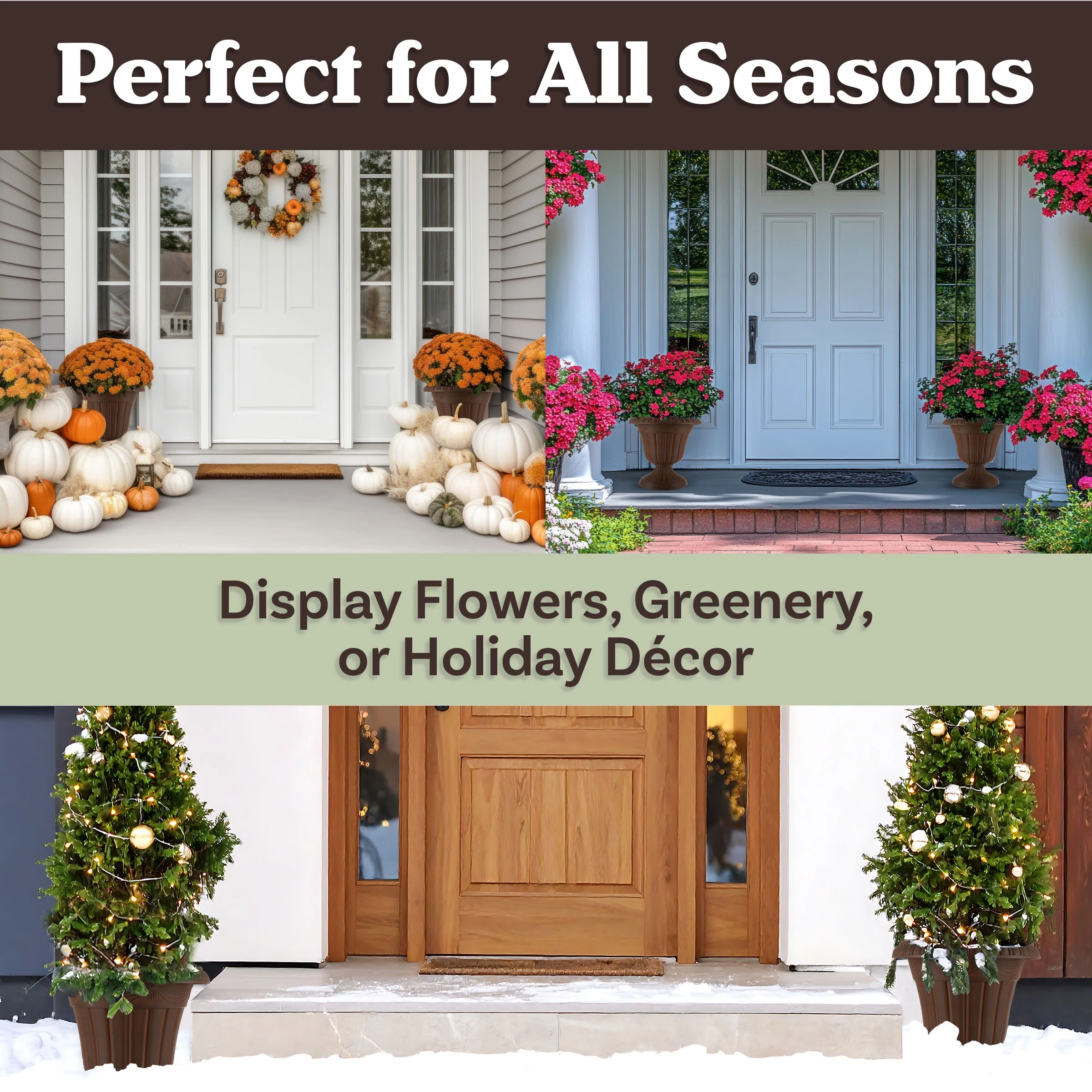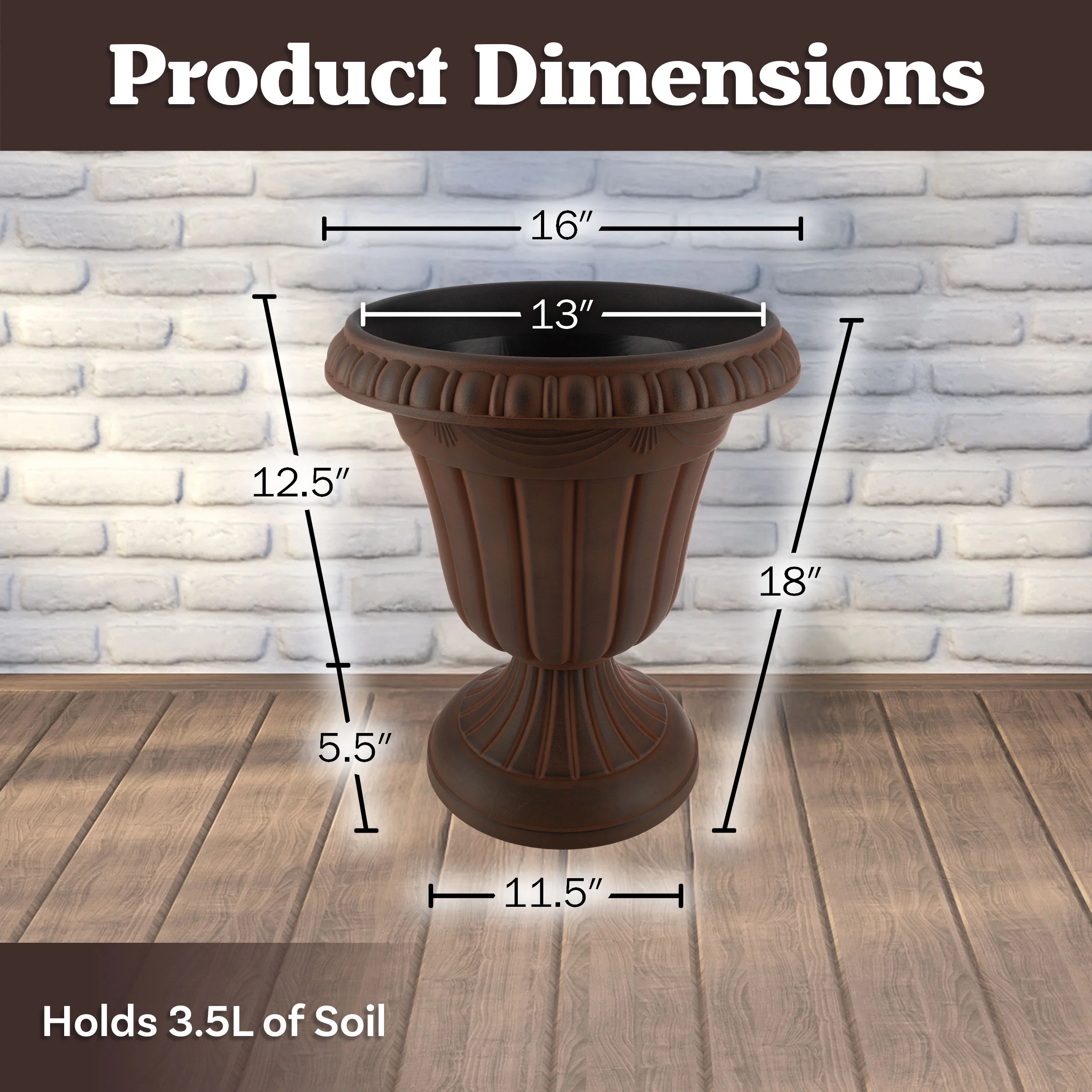 LARGE OUTDOOR PLANTERS 2-PACK – This urn planter set combines the traditional charm of a pedestal planter with a durable, lightweight, and easy to clean plastic construction. YEAR-ROUND USE – The recycled polypropylene material is tough enough to endure heat and cold, so you can enjoy these porch planters outdoors all year long. EASY ASSEMBLY – The pots for plants arrive in 2 pieces and assemble with a simple twist with no tools required, and drainage holes can be drilled in the bottom if desired. VERSATILE STYLE – The gardening pots can be used indoors or out with living or artificial plants, so you can use the outdoor planters for porch decor, to frame an entry with topiaries, decorate a deck, or fill your garden with blooms. MATERIALS – Recycled Polypropylene Plastic. DIMENSIONS – (L) 16” x (W) 16” x (H) 18”; Weight: 3.8lbs; Interior Planting Space: 13” Diameter x (H) 12.75”; Soil Capacity: 30lbs/13.6L. COLOR – Brown.