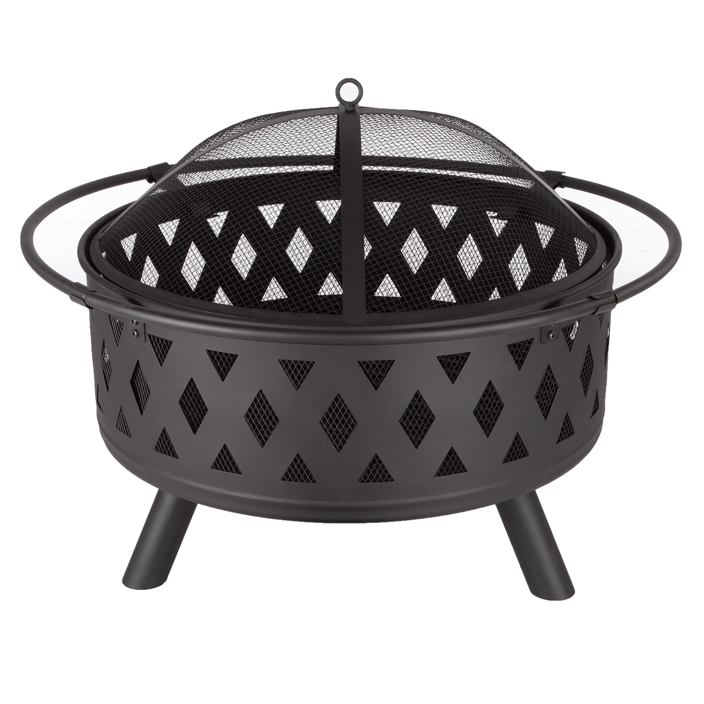 OUTDOOR FIRE PIT – This small fire pit is an ideal blend of modern design and natural elements with its beautiful cross-weave pattern cutouts. DURABLE DESIGN – Made from powder-coated steel to resist rust, this outdoor fireplace is sturdy and weatherproof for long-lasting use. LOW MAINTENANCE – Clean the outside of the bonfire fire pit with a slightly damp cloth — no chemicals or cleaning product required. ACCESSORIES INCLUDED – This camping fire pit comes with a spark cover, a log grate, log poker, and a weather-resistant PVC cover to keep the wood burning fire pit looking beautiful season after season. MATERIALS – Powder-Coated Steel and PVC. DIMENSIONS – (L) 32” x (W) 32” x (H) 18”; Safety Screen: (H) 6”; Fire Bowl: (L) 26.5” x (H) 9.4”; Weight 22lbs. COLOR – Black.