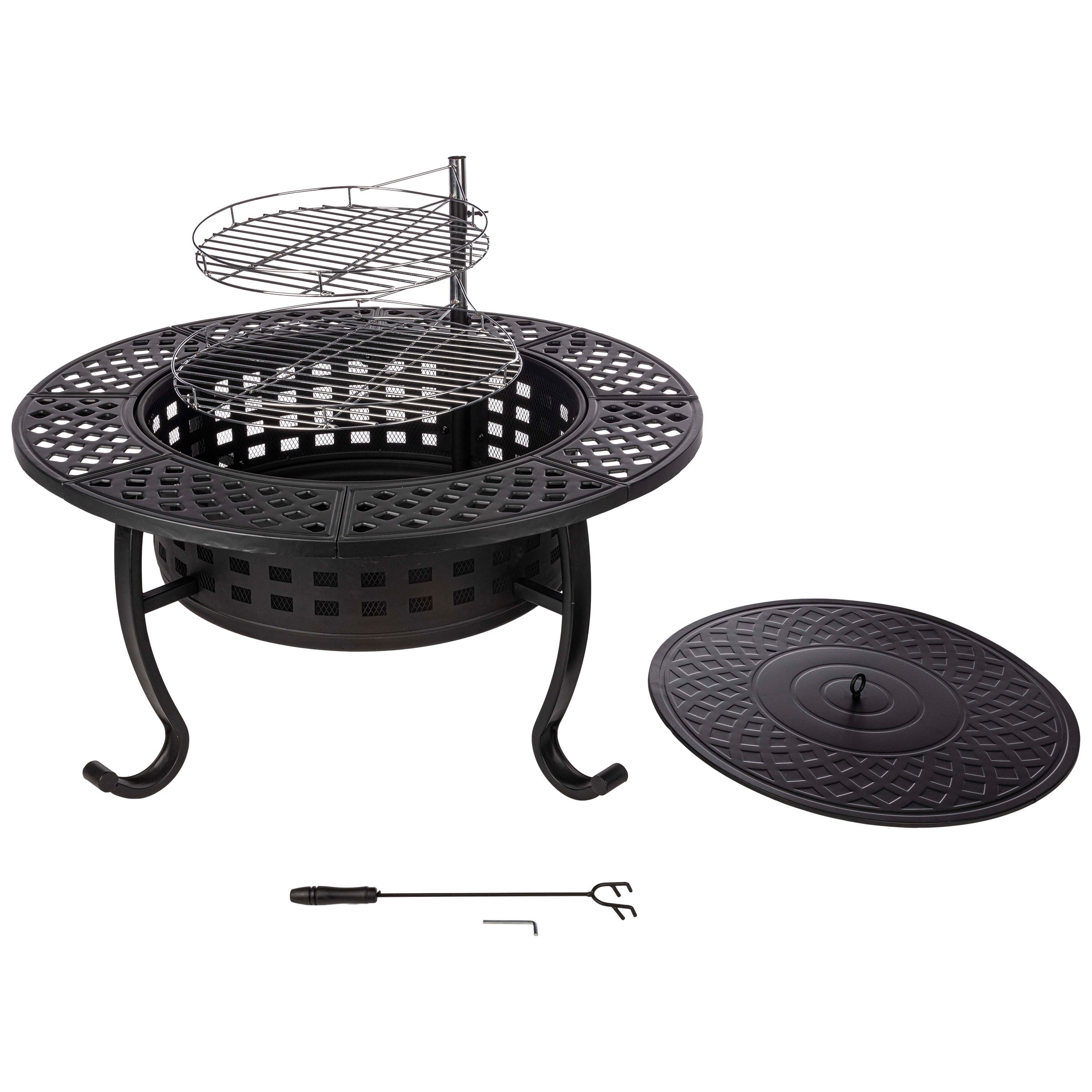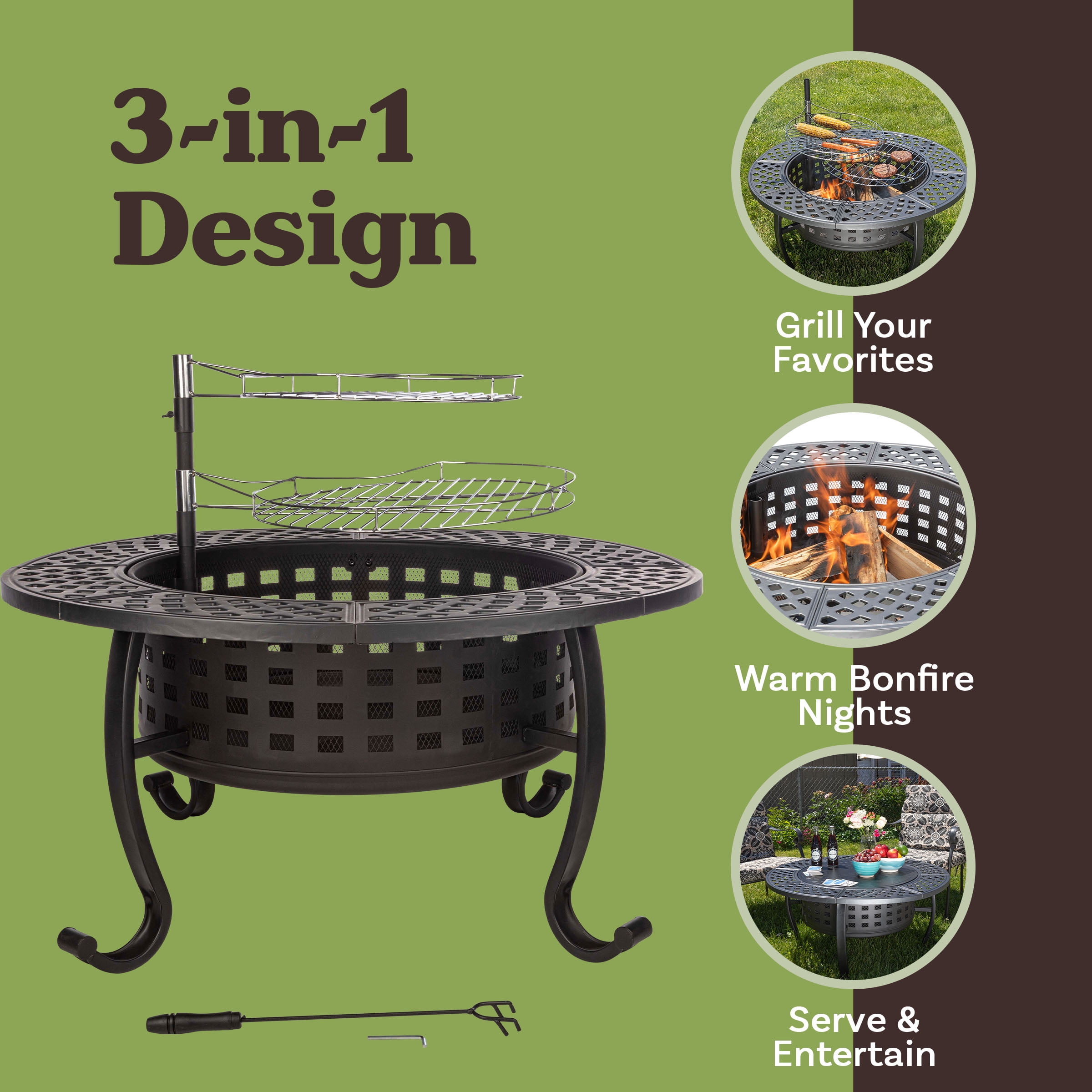 Create a cozy atmosphere while cooking out with the firepit grill combo by Pure Garden. This wood fire pit features 3-in-1 functionality, serving as a bonfire pit, an outdoor table, and a fire grill thanks to the 2 removable elevated grill grates: a larger 18-inch firepit grill grate for barbequing and a smaller 15-inch grate to keep your food warm. The height of the grates can be adjusted, and they each rotate 360-degrees for simple serving. Outdoor entertaining is easier than ever with our wood fire pits for outside patio. Pure Garden is your source for wood burning fire pits for outside that are thoughtfully designed to enhance any outdoor space.