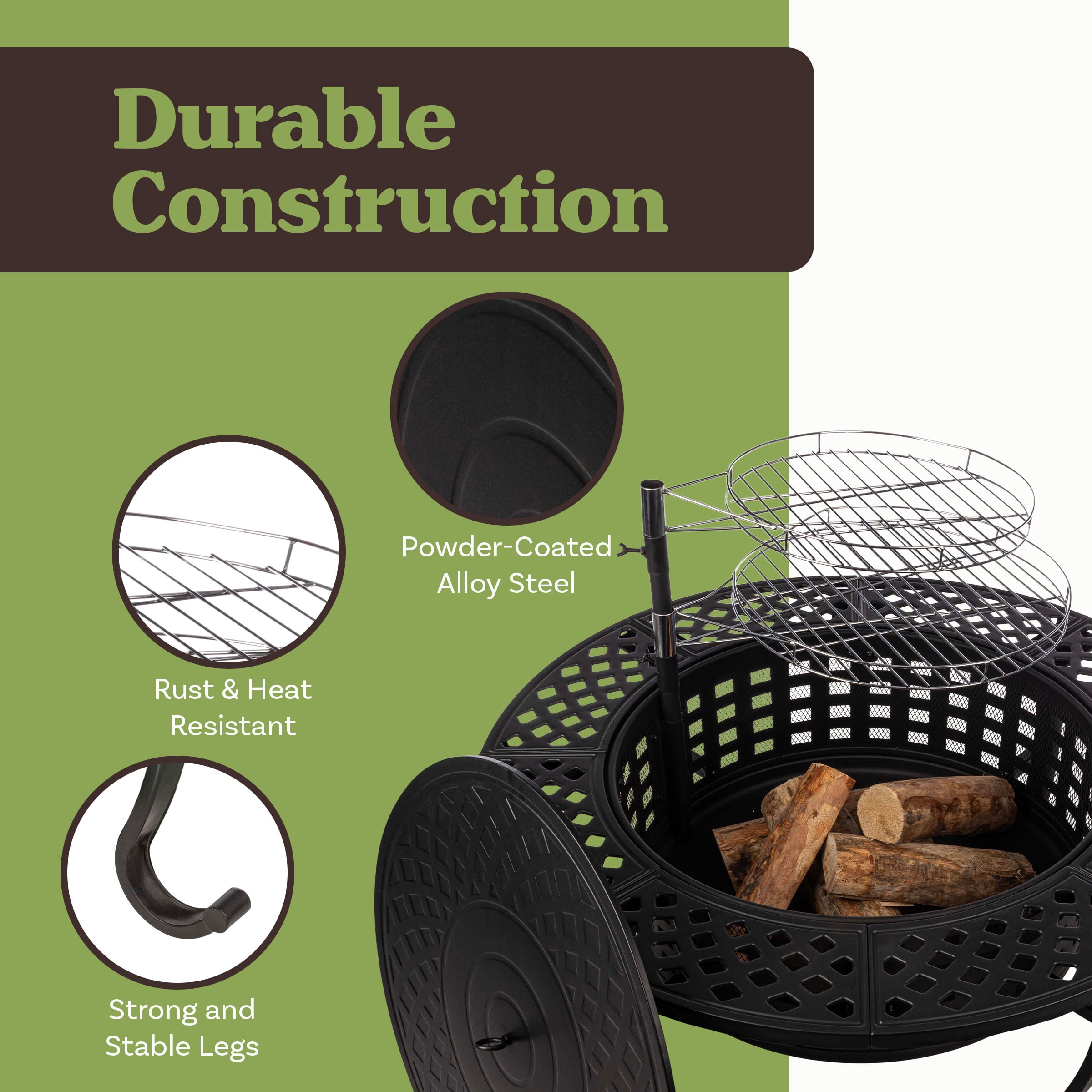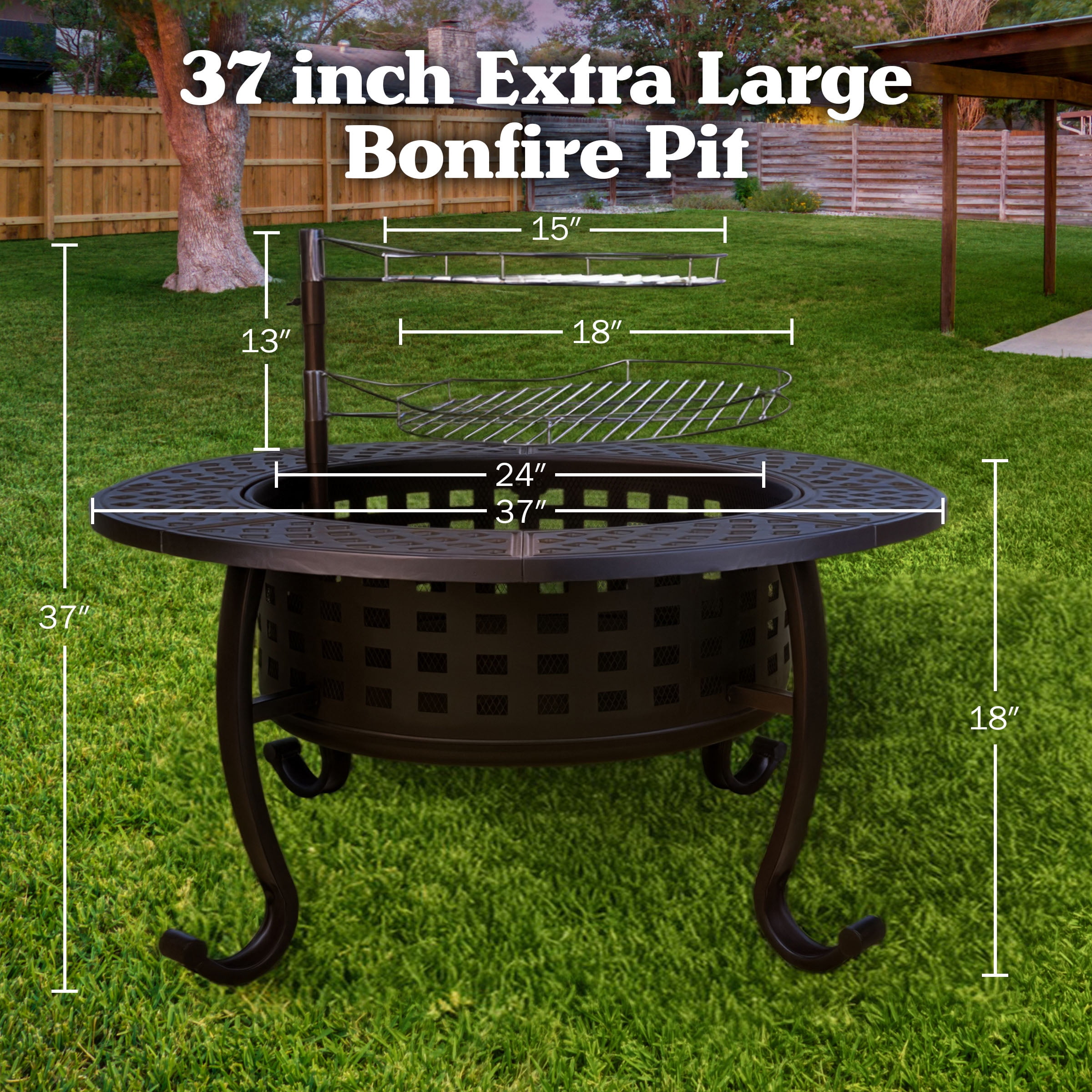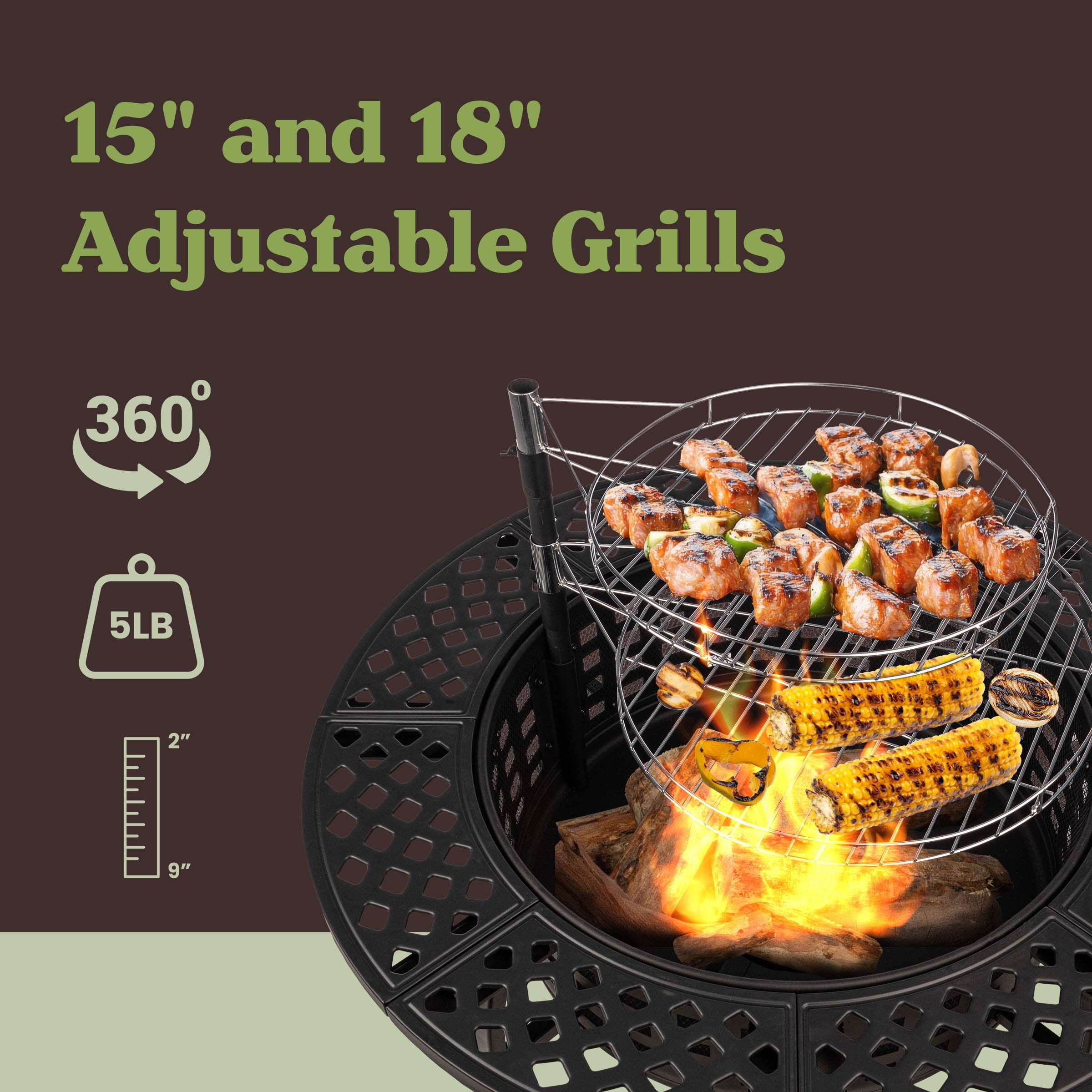 OUTDOOR FIRE PIT – This 37-inch fire pit grill has a compact design with multifunctionality that makes this patio fire pit the perfect pick for outdoor entertaining. 3-IN-1 DESIGN – This outdoor fireplace functions as a bonfire pit, as a firepit grill for barbequing food, and as a fire pit table, providing a handy tabletop for drinks and snacks when not in use. 2 BBQ GRILLS – This bonfire fire pit comes with 2 removable, adjustable-height 15- and 18-inch-diameter wood fire grill grates: 1 for cooking and the other for keeping food warm. DURABLE CONSTRUCTION – This sturdy patio fire pit table is made from high-temp and rust-resistant powder-coated alloy steel with 9 drainage holes, and supports up to 20lbs of wood. MATERIALS – Steel and PVC. DIMENSIONS – (L) 37” x (W) 37” x (H) 18”; Bowl Diameter: 24”; Lid Diameter: 24.5”; BBQ Pole: 20.5” (Extends 13” Above Firepit); Weight: 44lbs. COLOR – Brown.